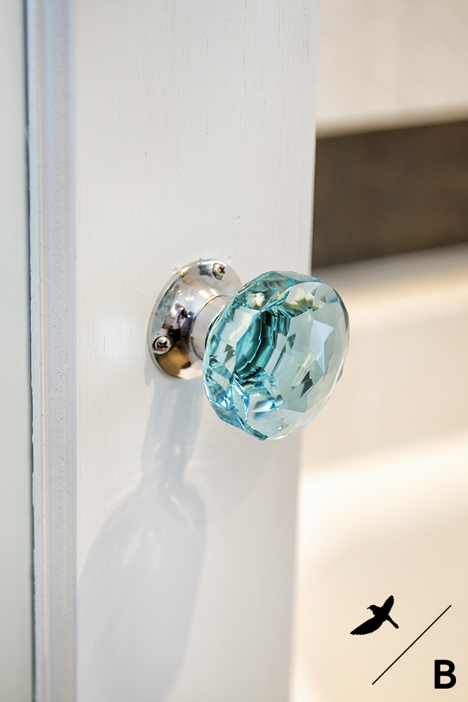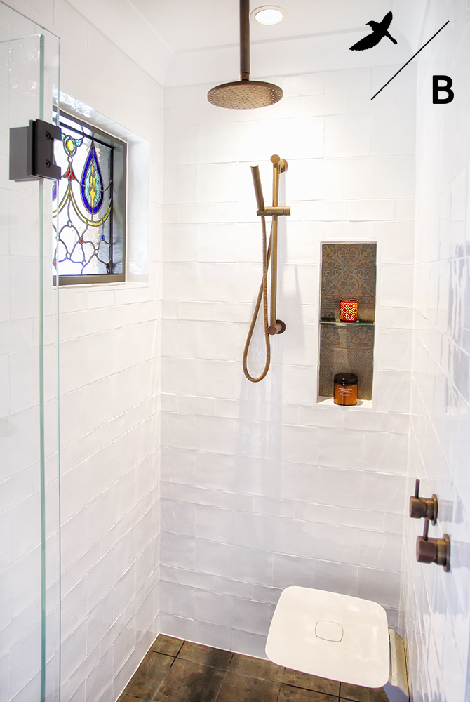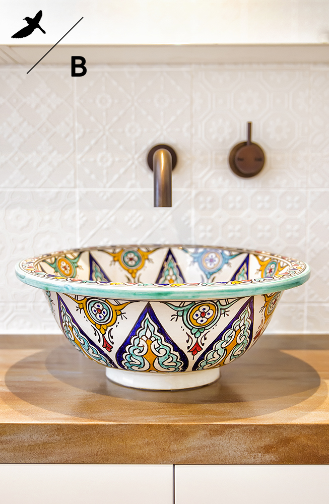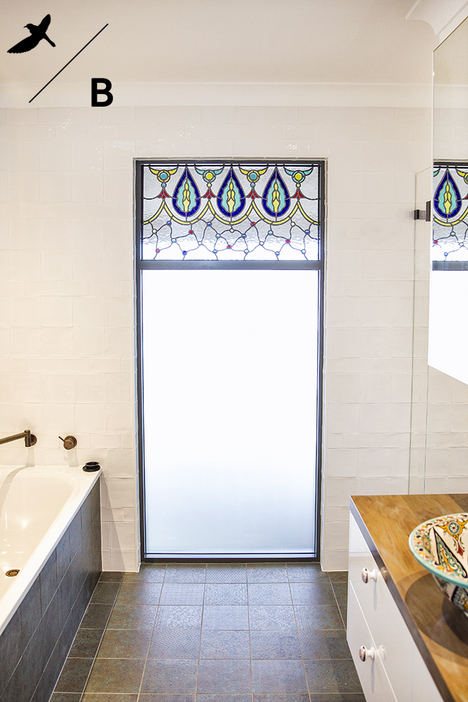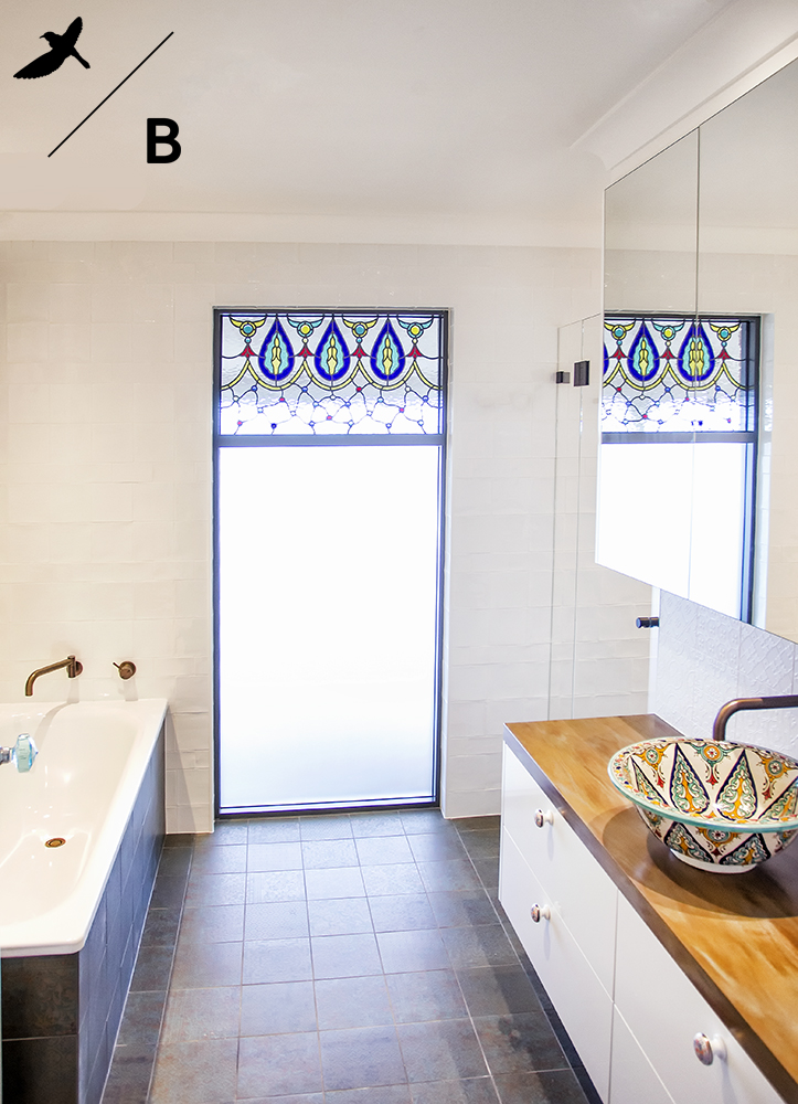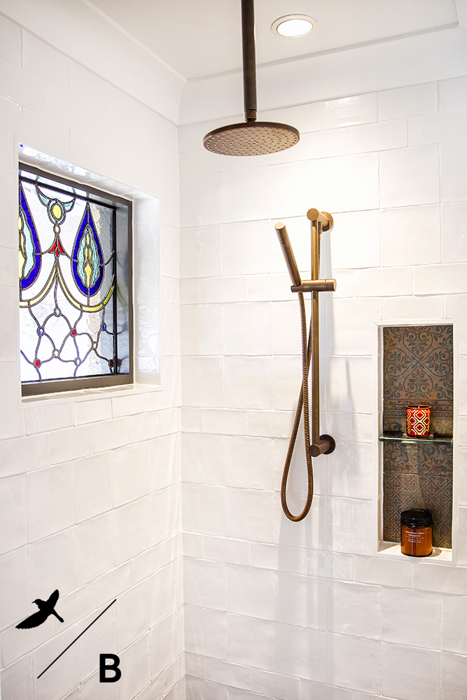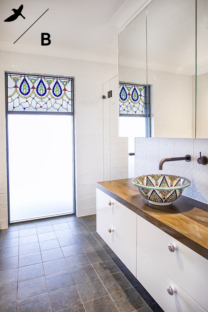 One of the most important elements introduces pops of colour into the space are the two stained-glass windows which echo the Moroccan influence. Both windows were custom-made, reflecting the colours and patterns found in the feature basin; a beautiful statement, capturing the eye as you step into the Bathroom.