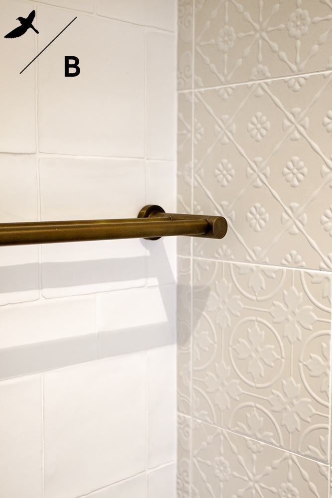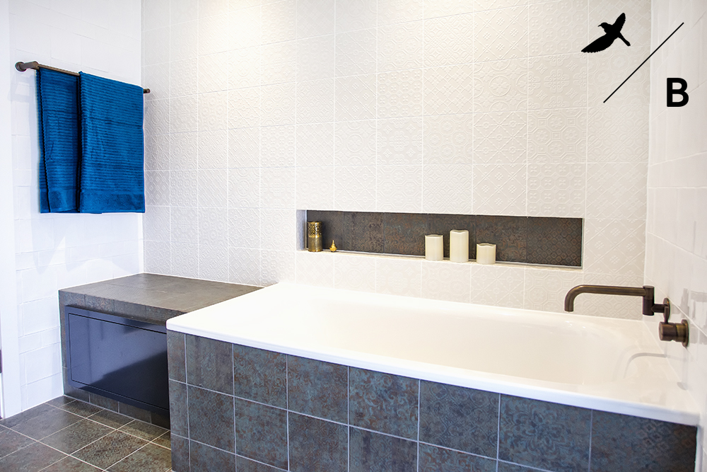 For the flooring in both the Main Bathroom and toilet room, we sourced a rustic metallic coloured tile, reflecting a Moroccan style in a subtle manner and certainly adding that luxe factor to both spaces. For the walls, we used a combination of square and rectangle gloss white tiles. The use of white wall tiles gives an illusion of a large space, making both spaces bright and inviting.