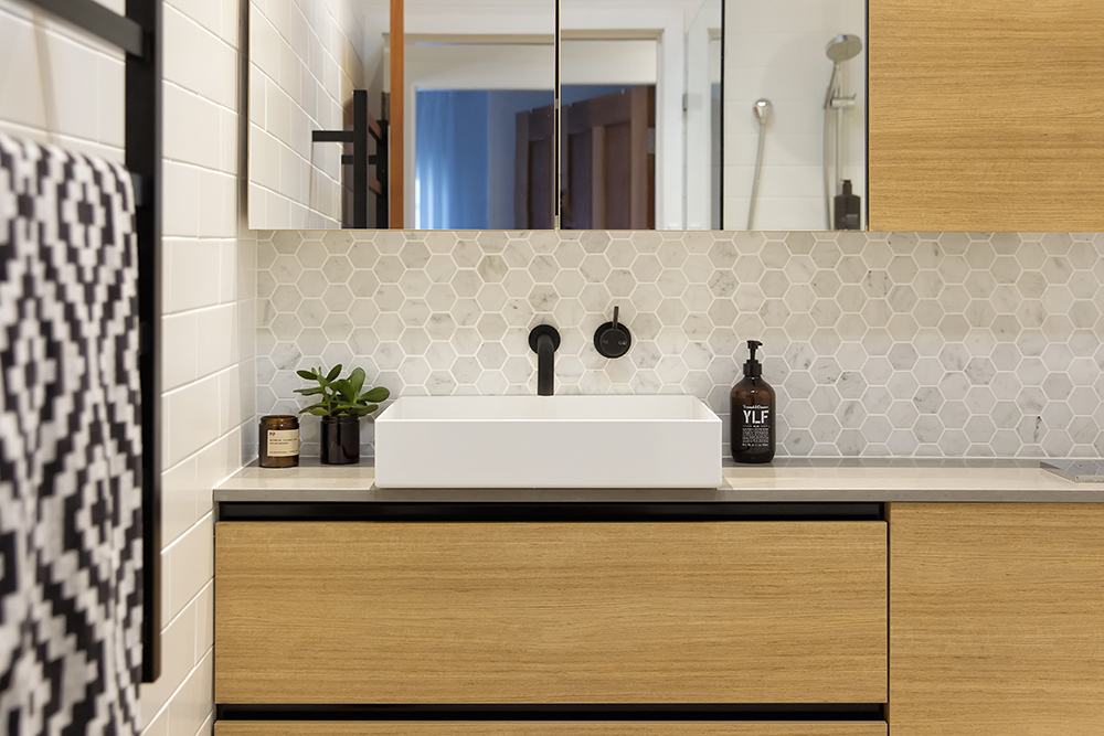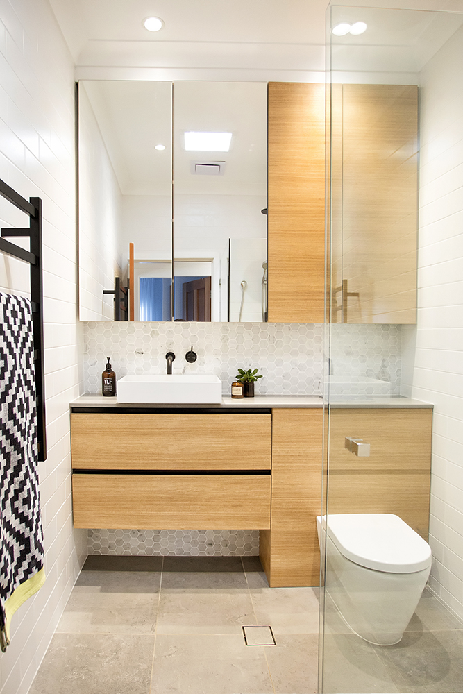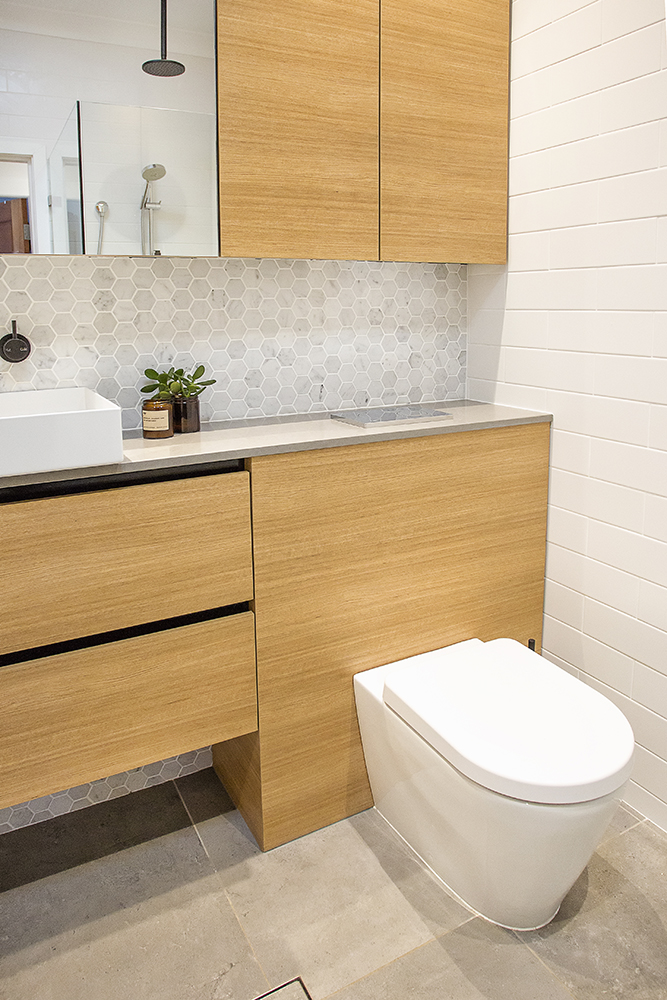 The light space was warmed up with the gorgeous textured timber look cabinet finish. The horizontal timber grain runs along the full length of the vanity wall and elongates the space further creating a larger and sophisticated atmosphere. Aiming for sleek and minimal design we designed a space within the joinery to house the cistern for the new toilet pan installed. The design also allowed us to create much more bench space within the room and have the vanity run from wall to wall.