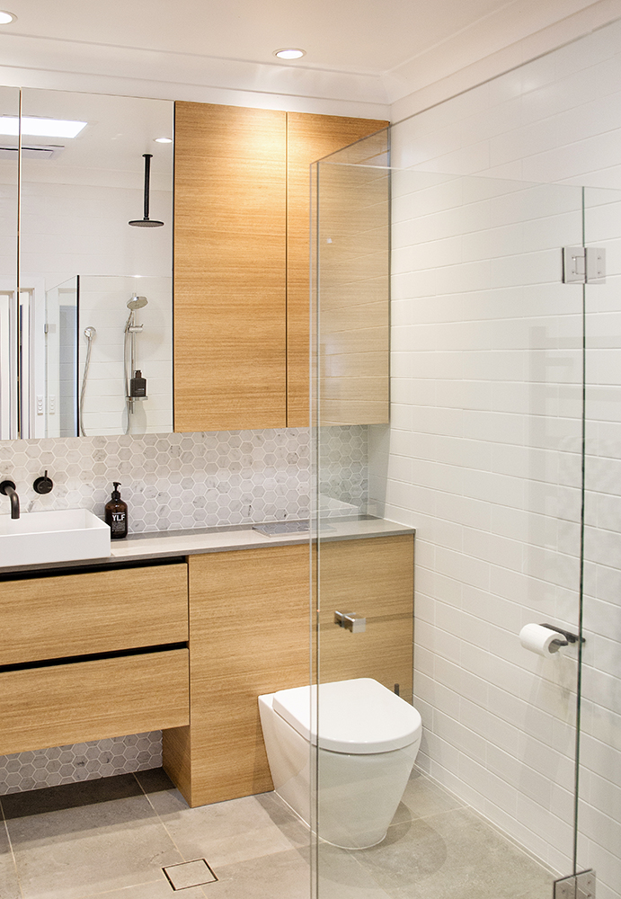 Taking into consideration that our clients were after a space much more functional, we opted to remove the bath which they didn’t use. This allowed for us to replace it with a much larger frameless shower. By removing the bath and having the shower frameless the small space was opened up immensely and made the room feel much bigger and lighter in comparison.