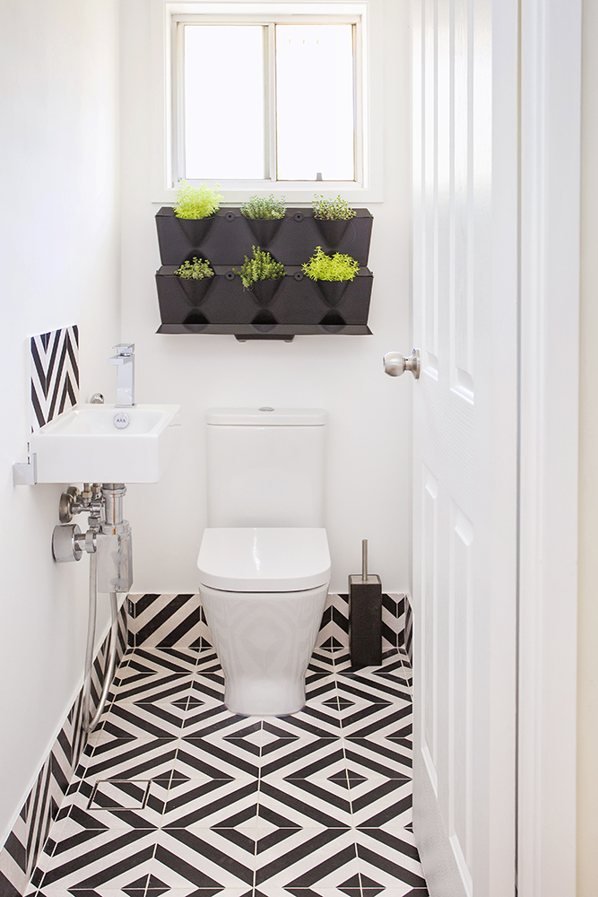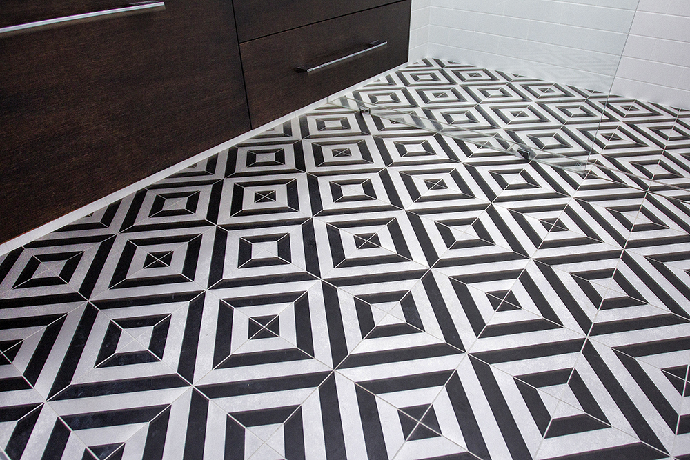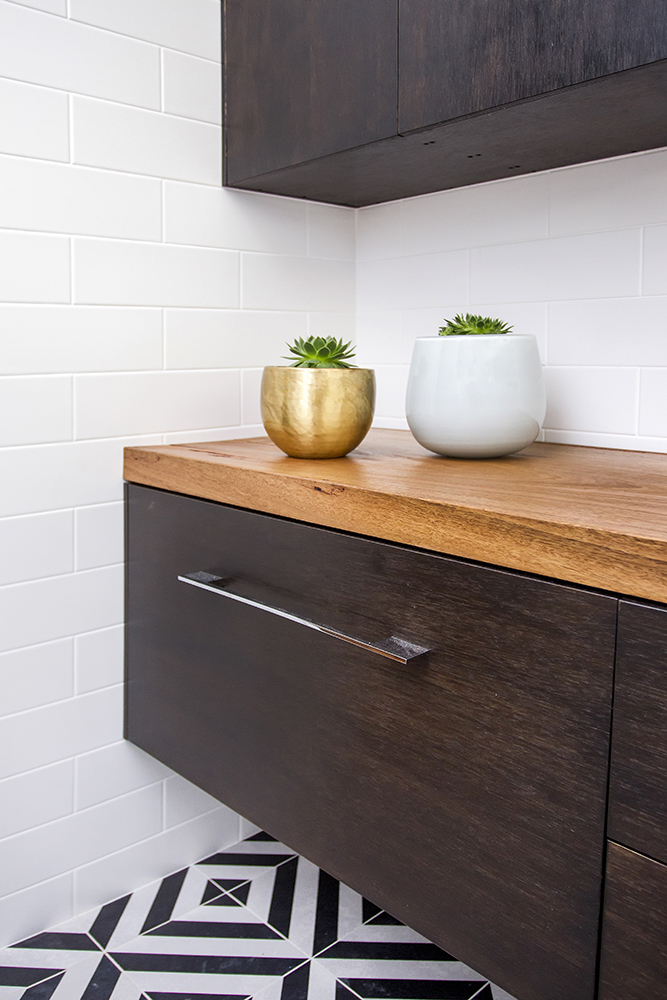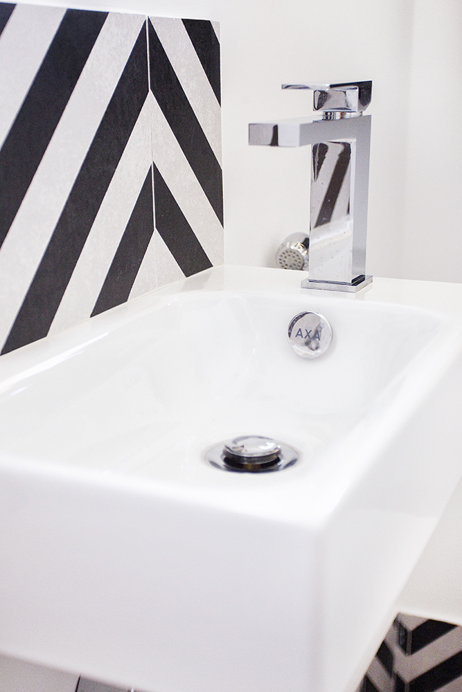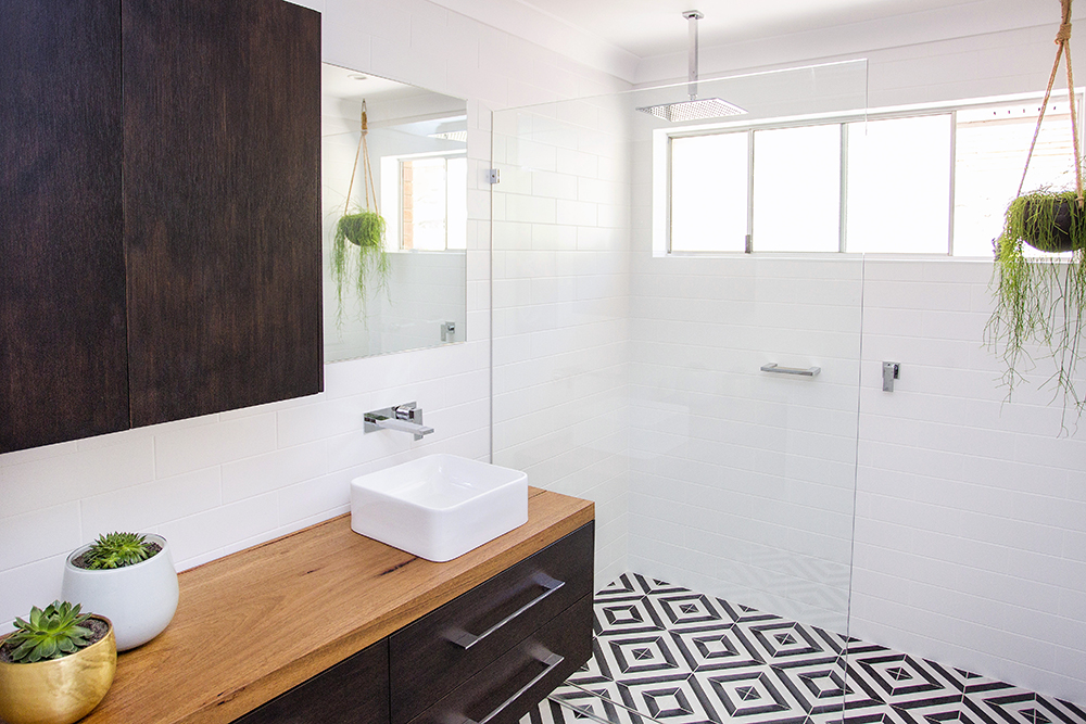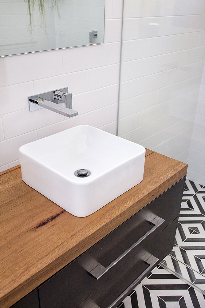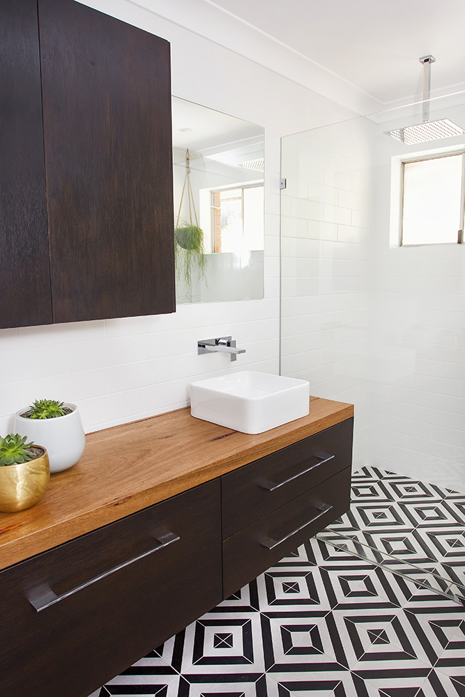 The hero of the room has to be the black and white geometric tiles. We were conscience in allowing these tiles to be the feature without any competition and they certainly work paired with the matt white subway wall tile.