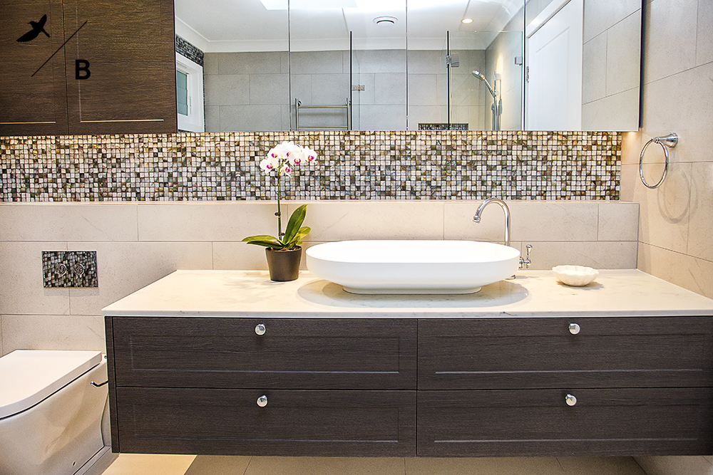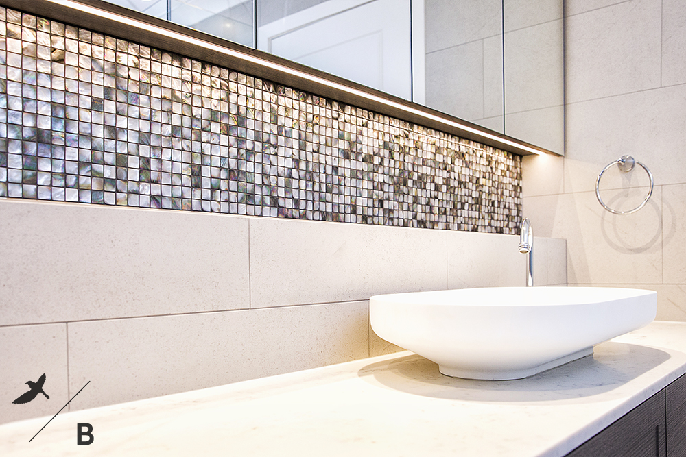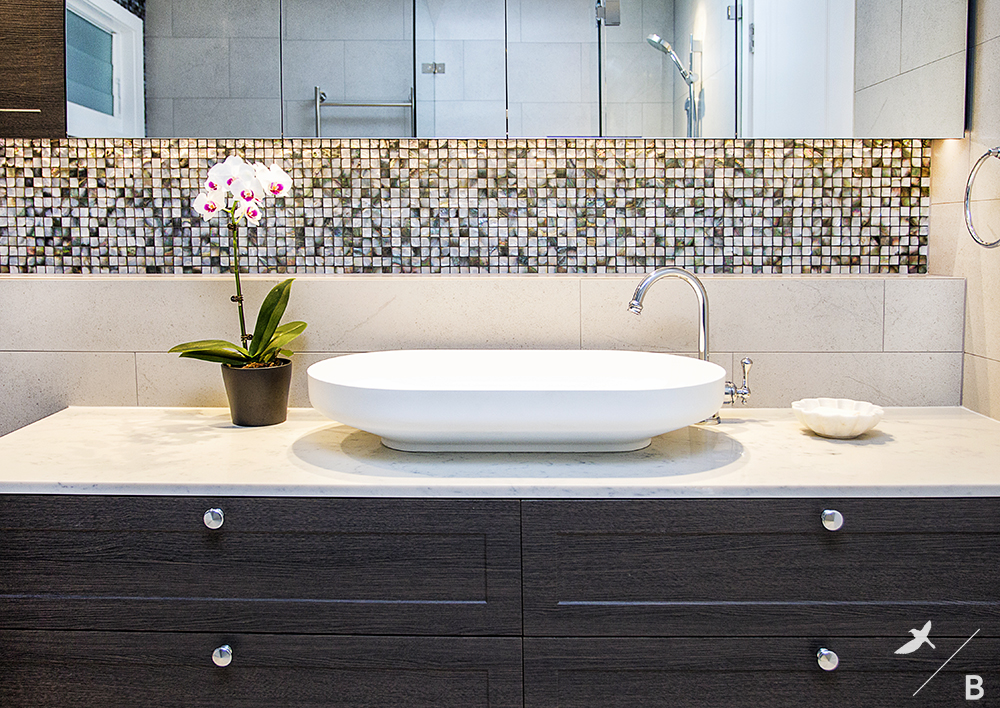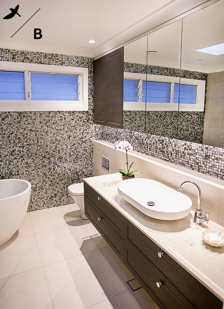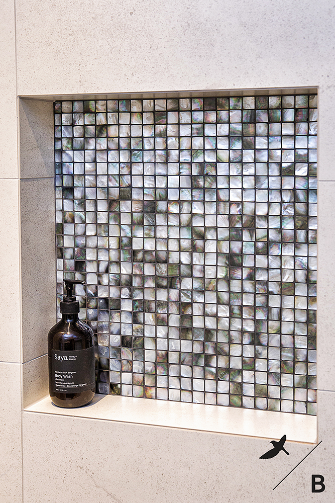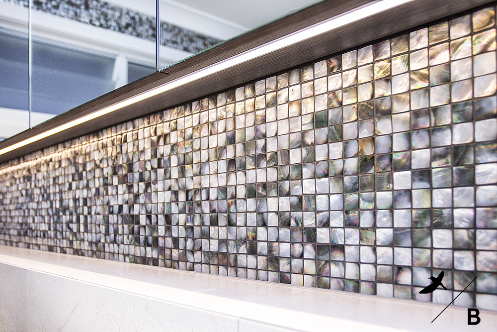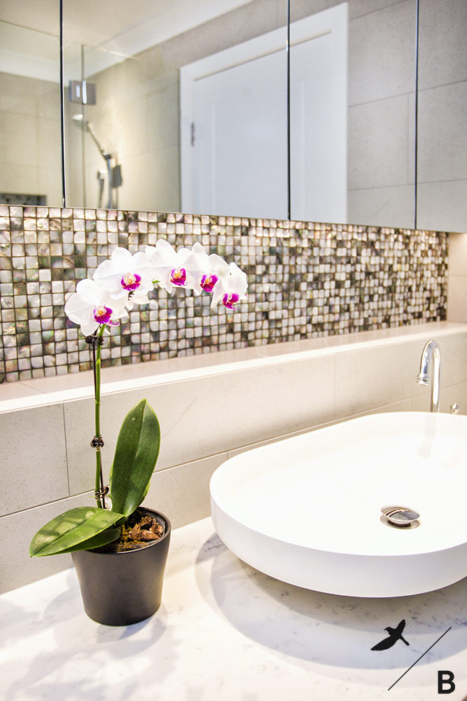 The vanity benchtop uses a reconstituted marble look stone that combines beautifully with the dark timber shaker style vanity, all of which echoe the tones in the shell mosaic. Sitting on top of the vanity is an Omvivo basin which mimics the curve of the bath. Above that is a recessed niche followed by overhead cabinetry fitted with mirrored doors and recessed LED strip lighting. The toilet is tucked behind the vanity, out of sight when we walk into the beautiful space.