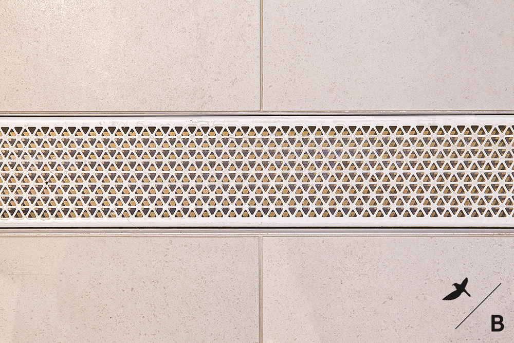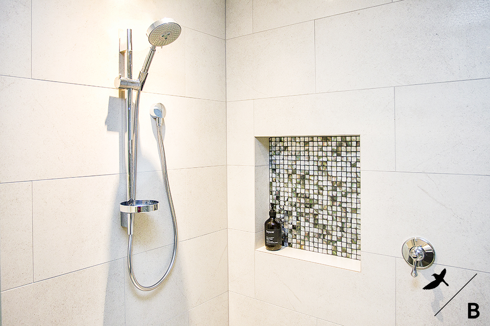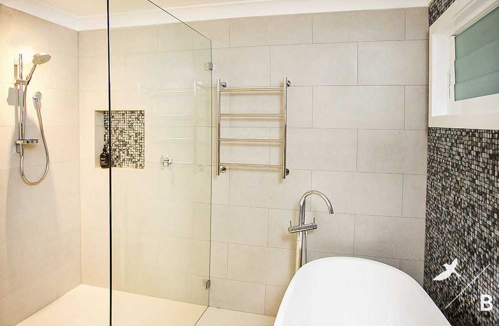 A generous sized frameless glass shower was installed, fitted with a custom shower grate which was powdercoated to blend in with the floor tiles. The large format floor and wall tiles have a limestone look which is the perfect neutral tone in contrast with the feature mosaic.