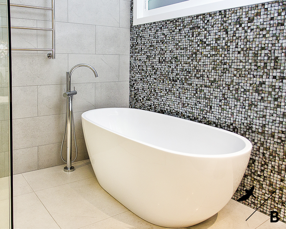 The back wall of the bathroom became the focal point of the room through tiling it with a luxurious shell mosaic tile. This tile was used in continuation throughout the space, in the shower niche and underneath the overhead cabinetry. This white freestanding bath pops in contrast to the darky smoky emeralds of the tile behind.