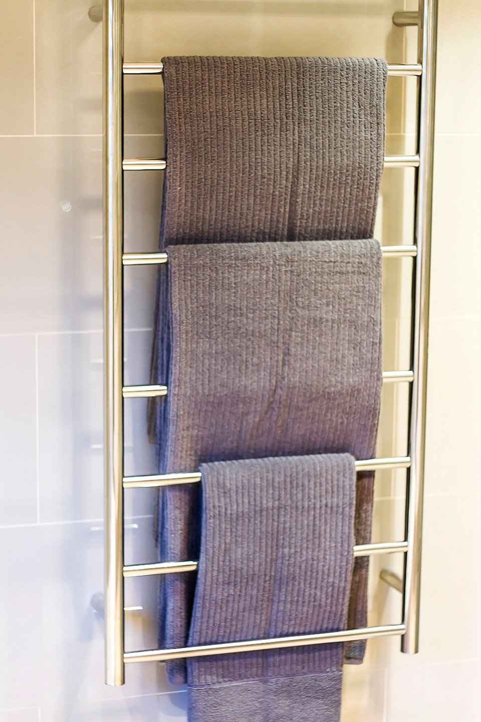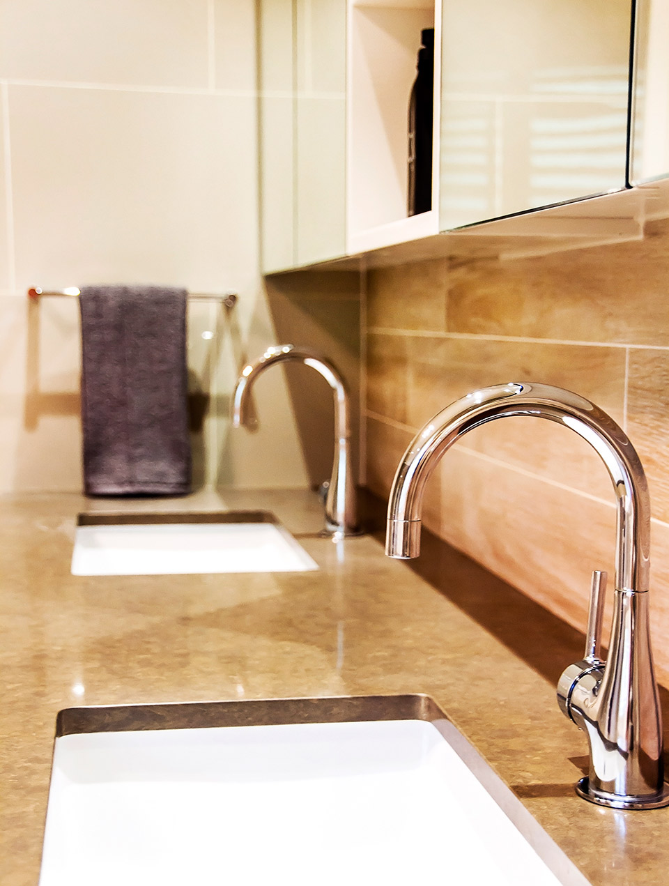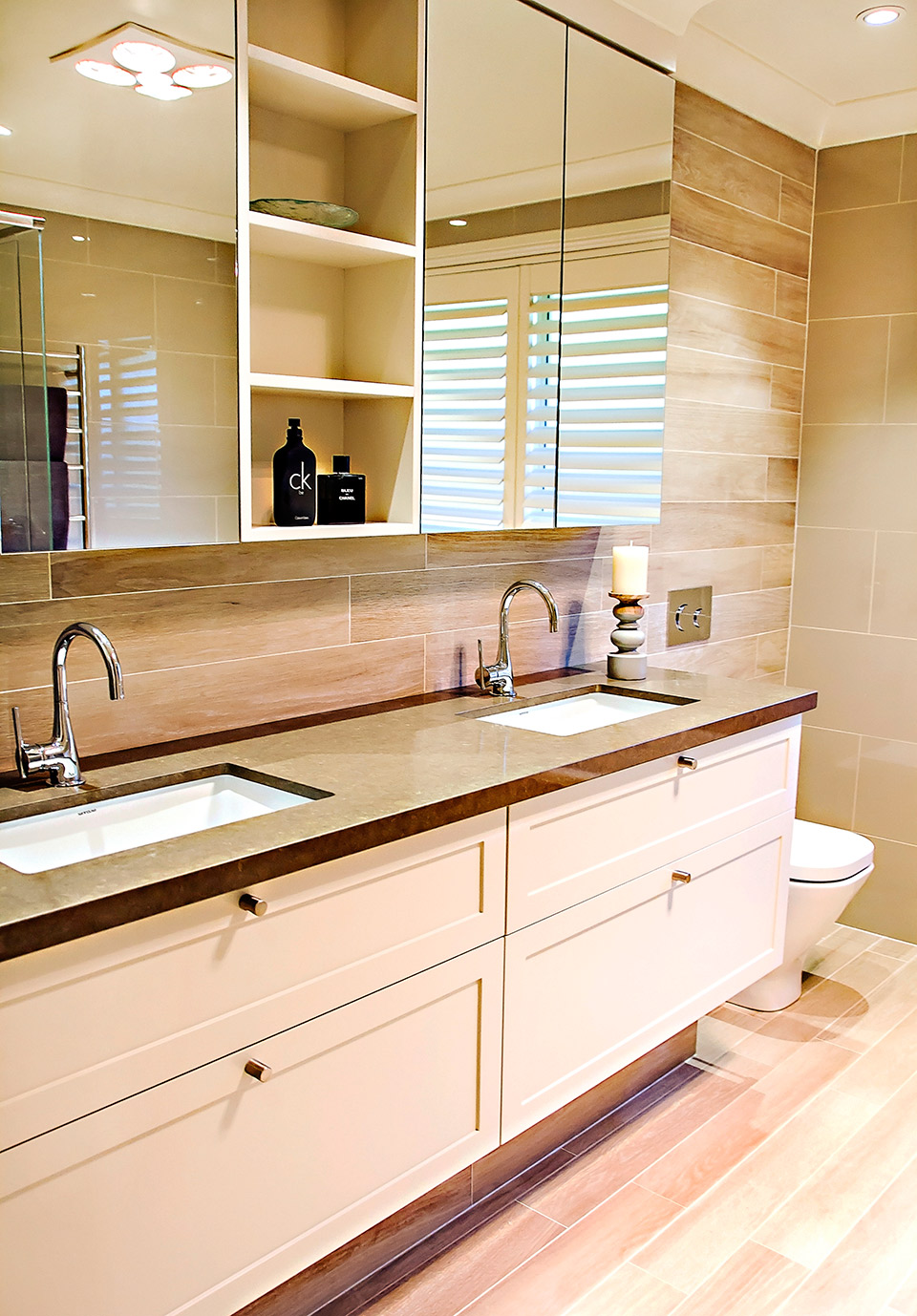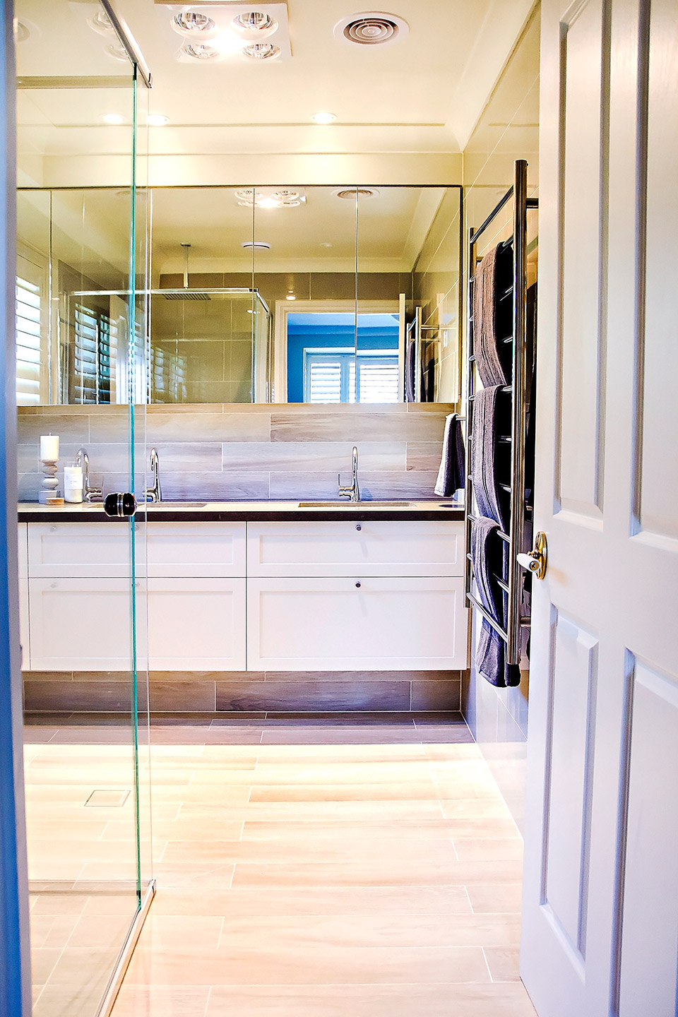 We used a bone white coloured tile on the walls which aids in making this space feel very warm and cosy. The custom made joinery and dark stone benchtops add plenty of storage and help breakup the space with added colour and texture.No detail was spared with beautiful formed tapware and accessories selected to ensure they too match the overall looking we were wishing to achieve.