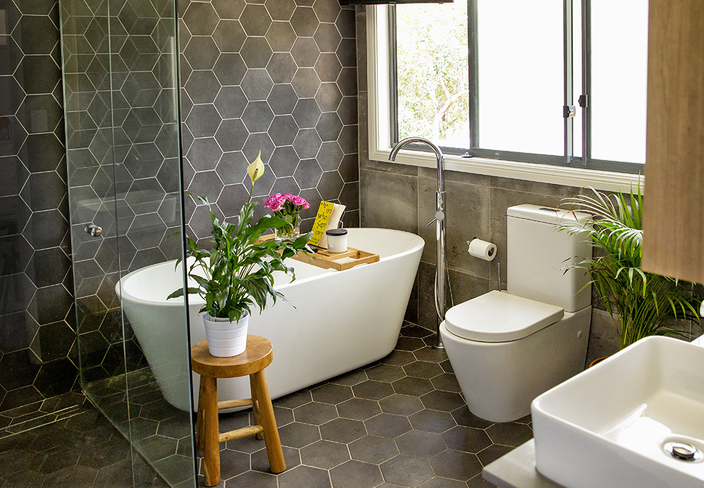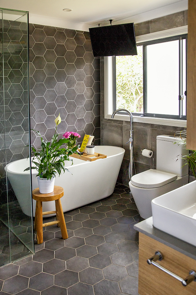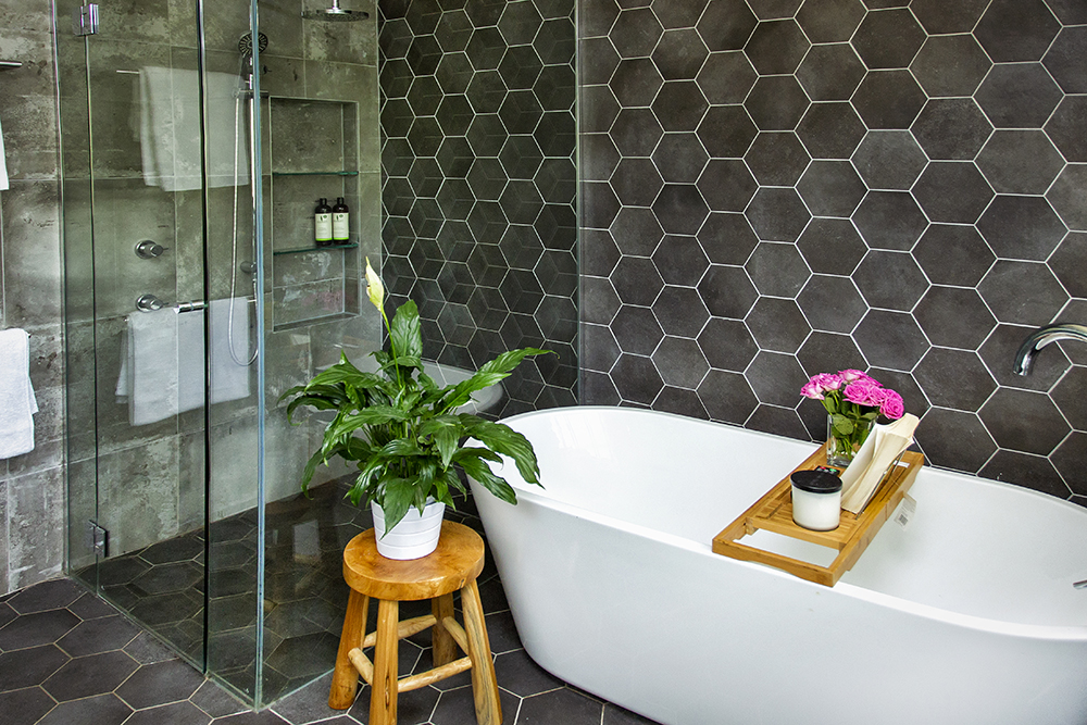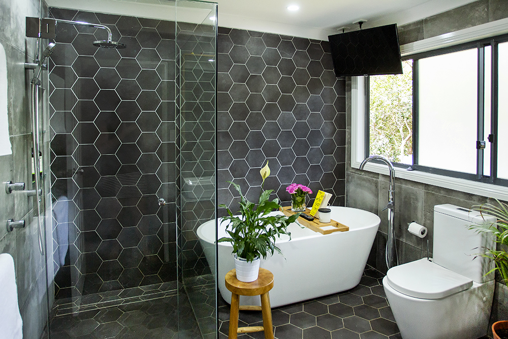 Charcoal coloured tiles fill the room both on the floor and walls creating a moody feel which is perfect for a relaxing bath.