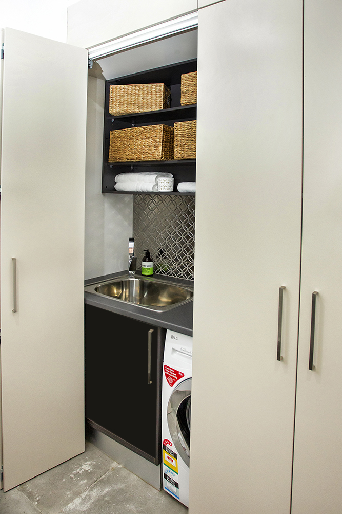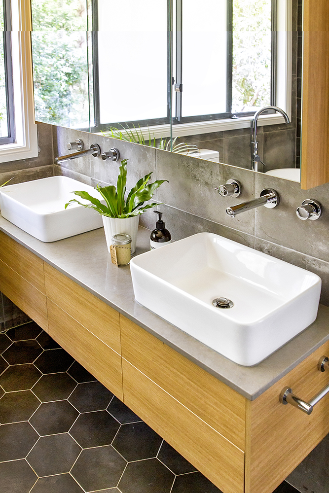 To bring warmth in to the room a beautiful teak timber has been selected for the custom vanity and overhead mirror unit.