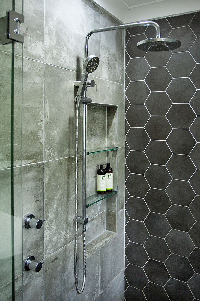 The bathroom has an open feel which just goes to prove that dark tiles won’t make a space look small. This modern bathroom has all of the features whilst still functioning as the main bathroom in this family home.