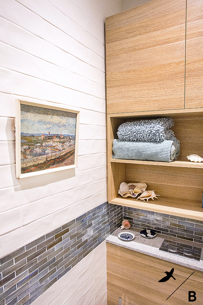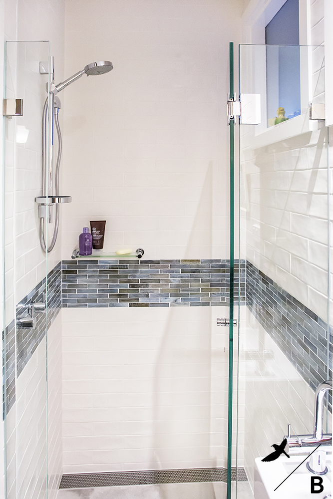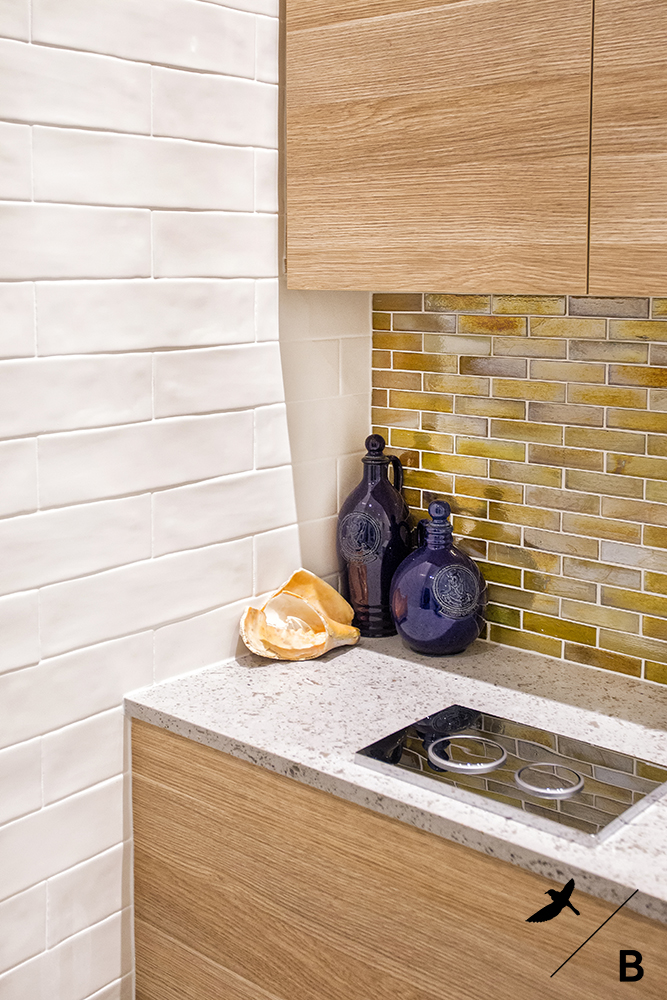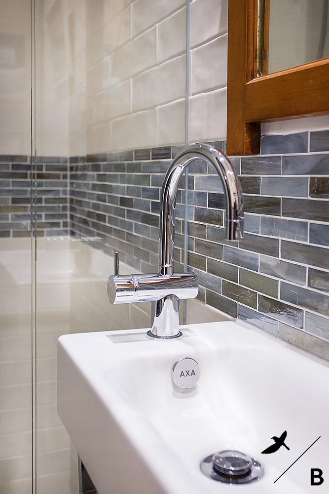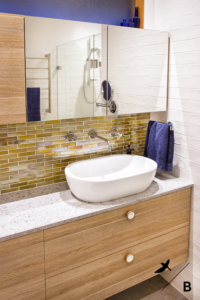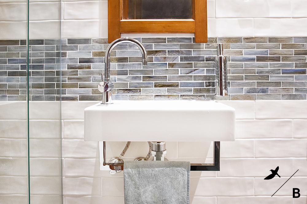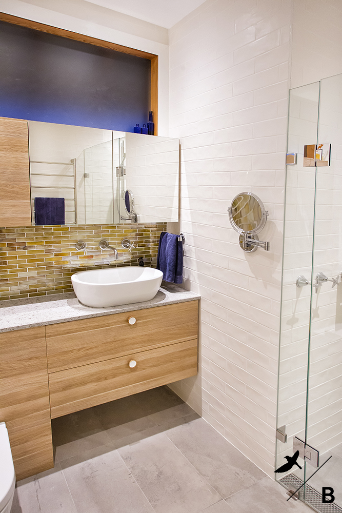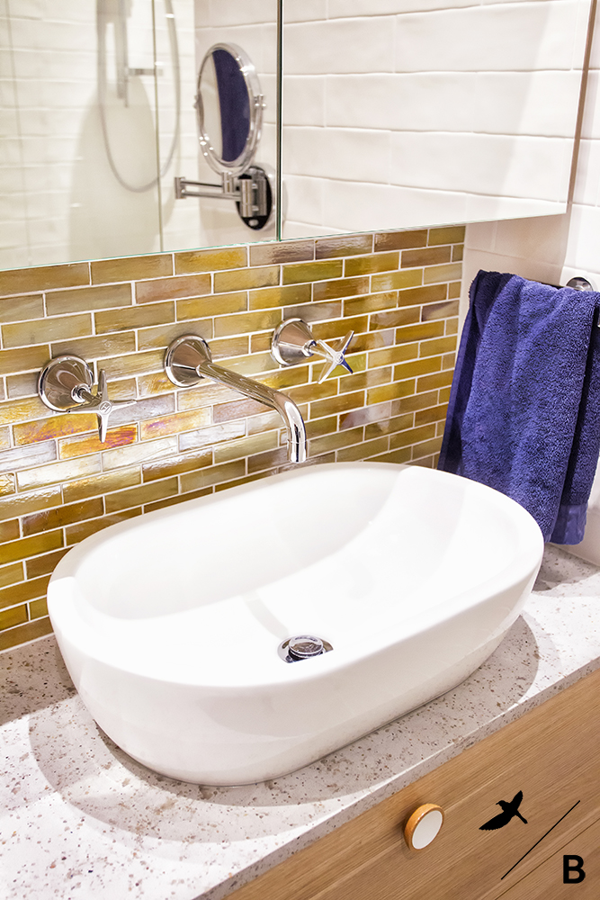 Both spaces echo a similar colour palette with a slight differentiation in colour. The glass mosaic was chosen for this, granting the ensuite with mustard tones and the powderoom with blue. This feature tile also adds texture to the space.