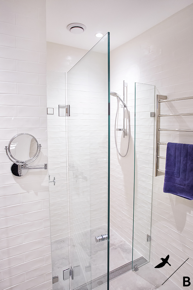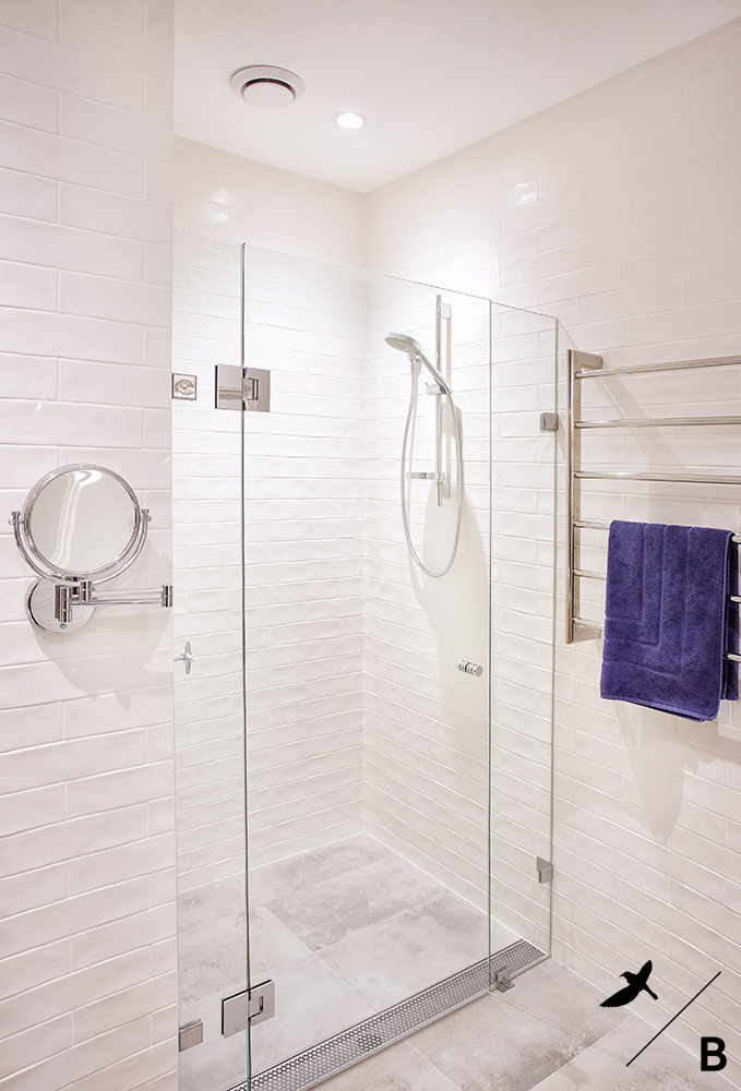 The existing ensuite had a large amount of wasted space, including an unsafe step in shower/bath and an dysfunctional corner vanity which provided limited storage. The space also had two small windows, we replaced these with a large horizontal window which graced the space with additional natural lighting. Below this window we designed overhead cabinetry accompanying a vanity which also provides an area for the toilet’s in-wall cistern.