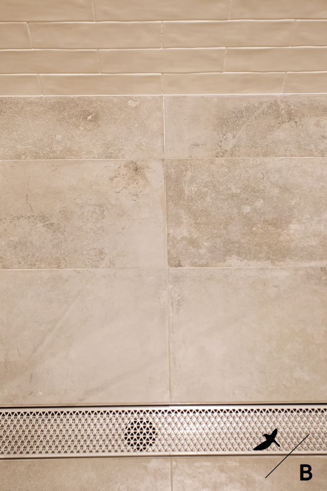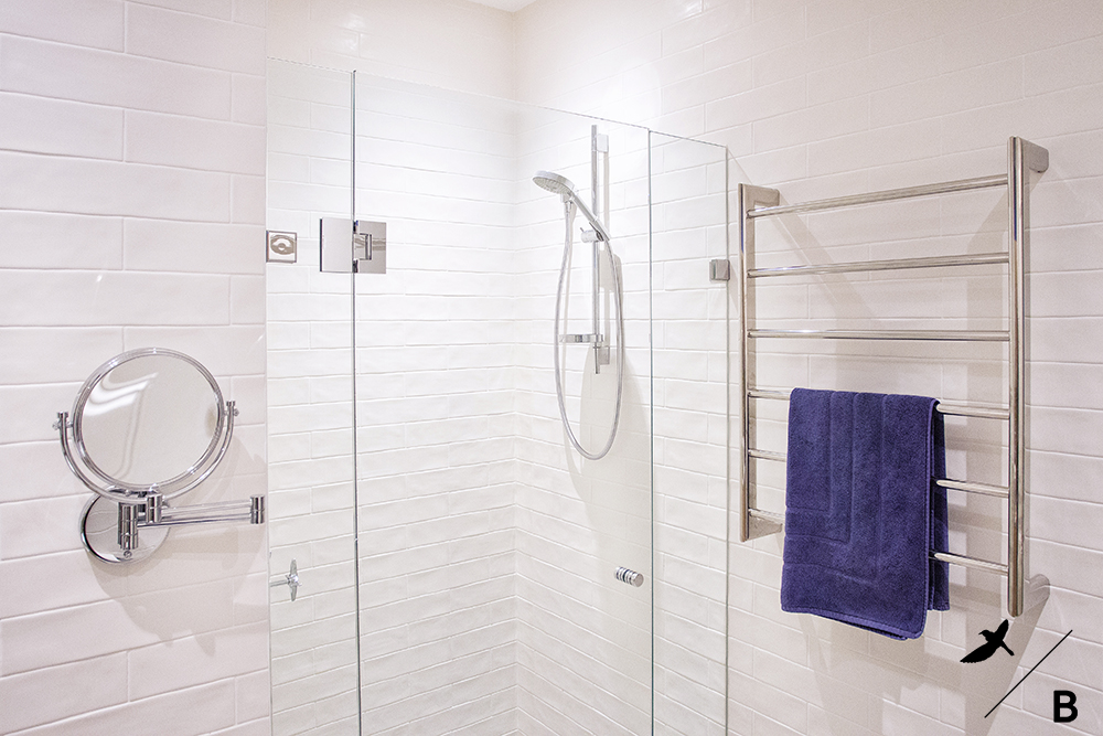 Both spaces have large format porcelain tiles installed. The walls are tiled from floor to ceiling using white subway tiles in a brickbond pattern. The use of white creates a clean, bright space.