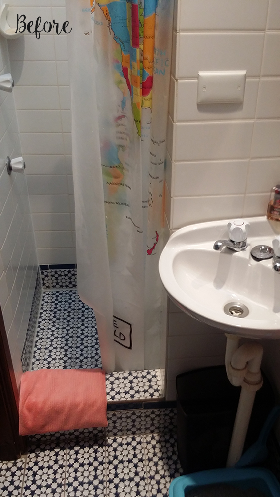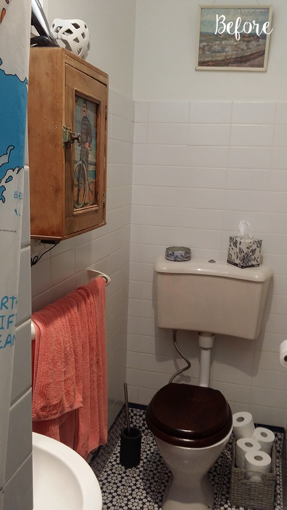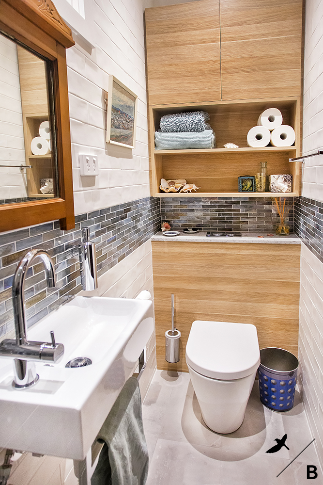 The existing powder room was also renovated in a similar style to the ensuite. It was designed with the consideration of utilising the existing plumbing points. This tight space lacked storage which was a huge inconvenience. To overcome this problem, we designed a storage unit situated above the toilet. To open the space, we removed the old nib wall in the shower and replaced it with a frameless glass shower screen.