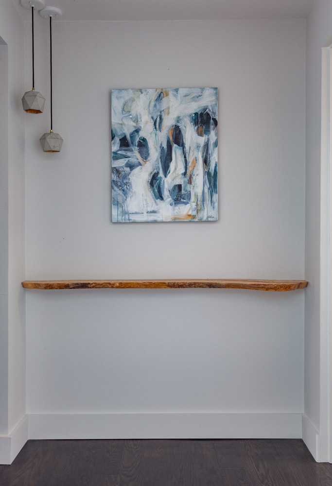 Upon entering the suite we created a nook with a reclaimed timber shelf with feature artwork and lighting above. One either side of this entry is a door, one leading to the bedroom side and the other leading to the ensuite (there is a second door access to the ensuite from within the bedroom).