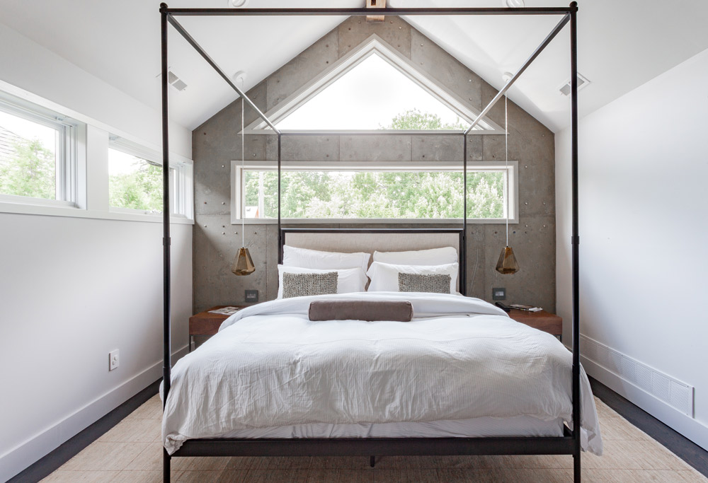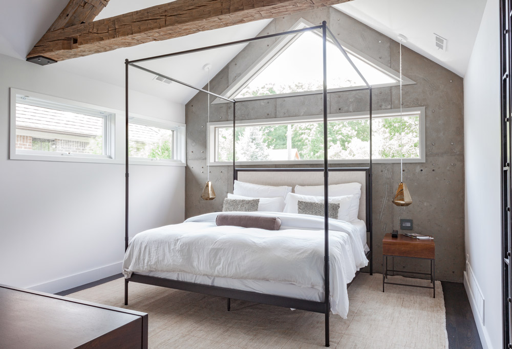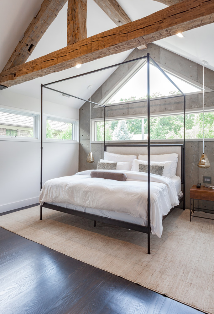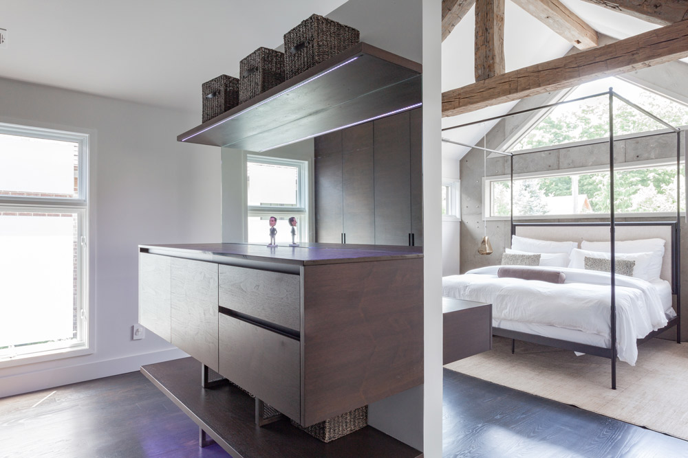 The bedroom is zoned into two areas. The first is the husband’s walk in robe and dresser space. A full height wall with walk-around access separates this area from the bed side. New windows were installed providing a light filled room. The bedroom furniture was all selected to tie in with the Industrial Modern theme throughout the home. A custom entertainment unit floats against the wall opposite the four-poster bed.