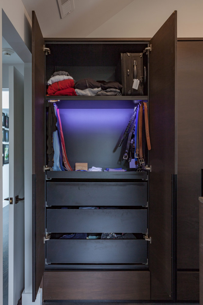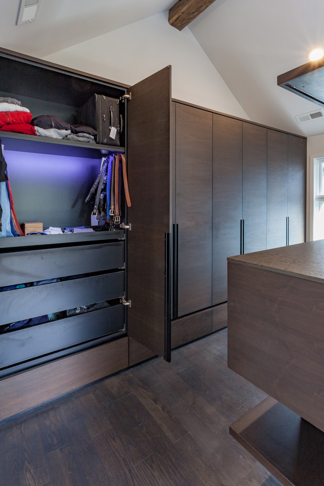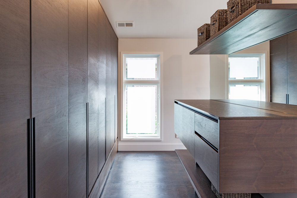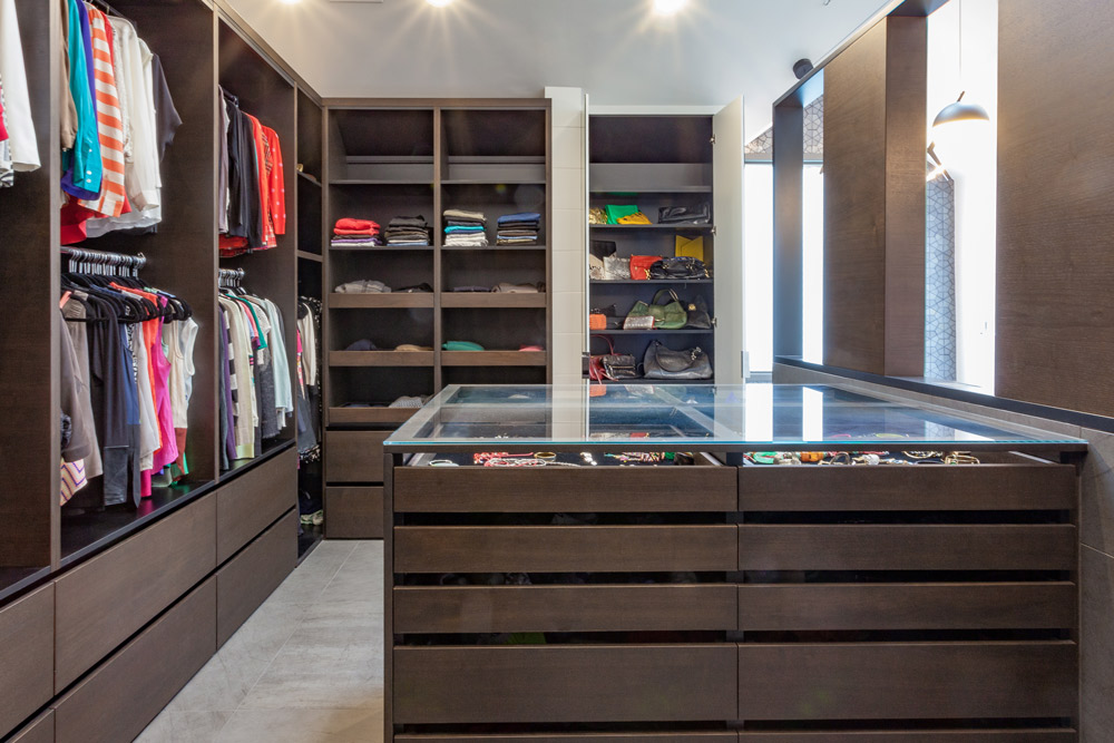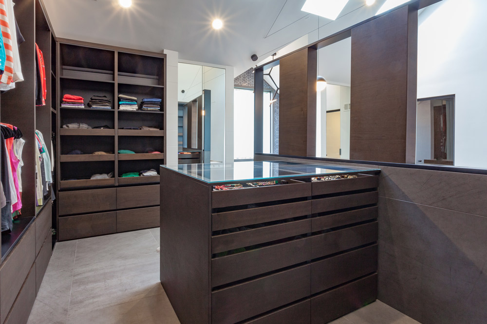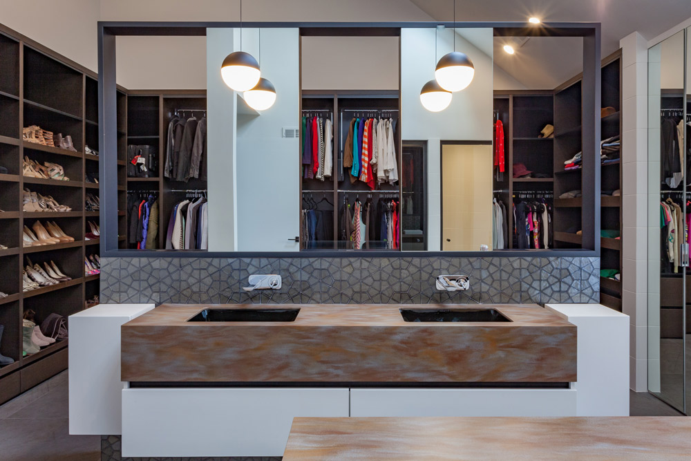 New ducted ventilation and heated floors allow us to have a partially open style robe as there is no condensation or moisture build up. Her robe was meticulously designed to fit every pair of heels, boots, long dresses, gym clothes, work clothes, purses, jewellery etc that she owned.