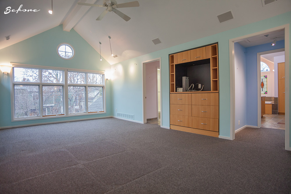 The master bedroom was already large in size but felt extremely sparse. We needed to create specific zones, that being the bedroom, ensuite and robe areas which whilst zoned were still going to relate to one another.