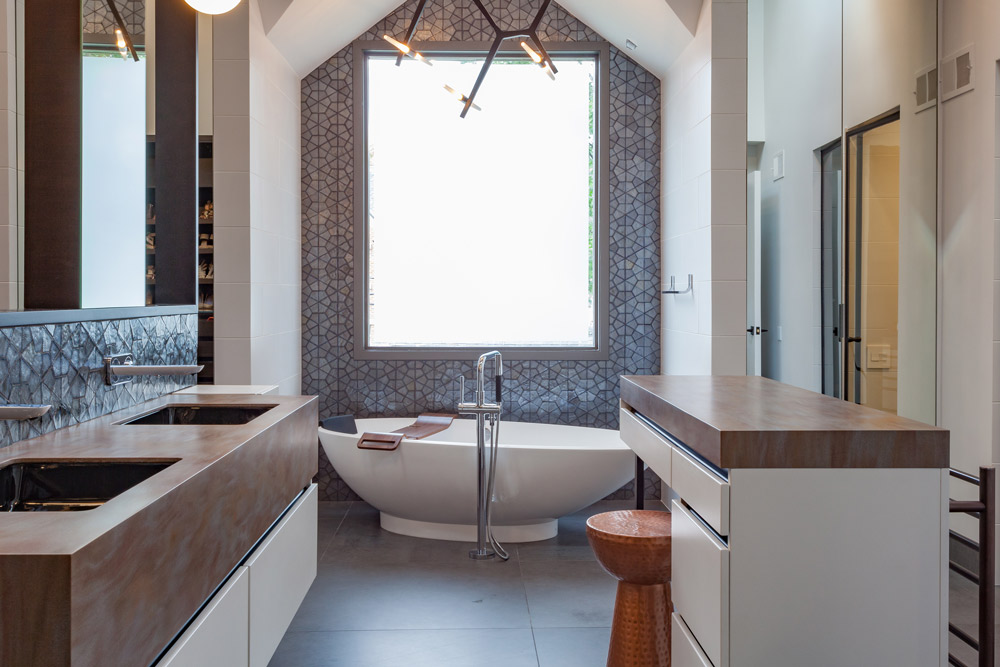 Given that we had a beautiful pitched ceiling to work with I really wanted to accentuate the height by drawing your eye upwards. This was achieved by our feature lighting. Over the bath sits a black angled Agnes chandelier. Above each basin is a black Flos string light. The placement of these lights with their string element create an architectural feature whilst still providing functional light.