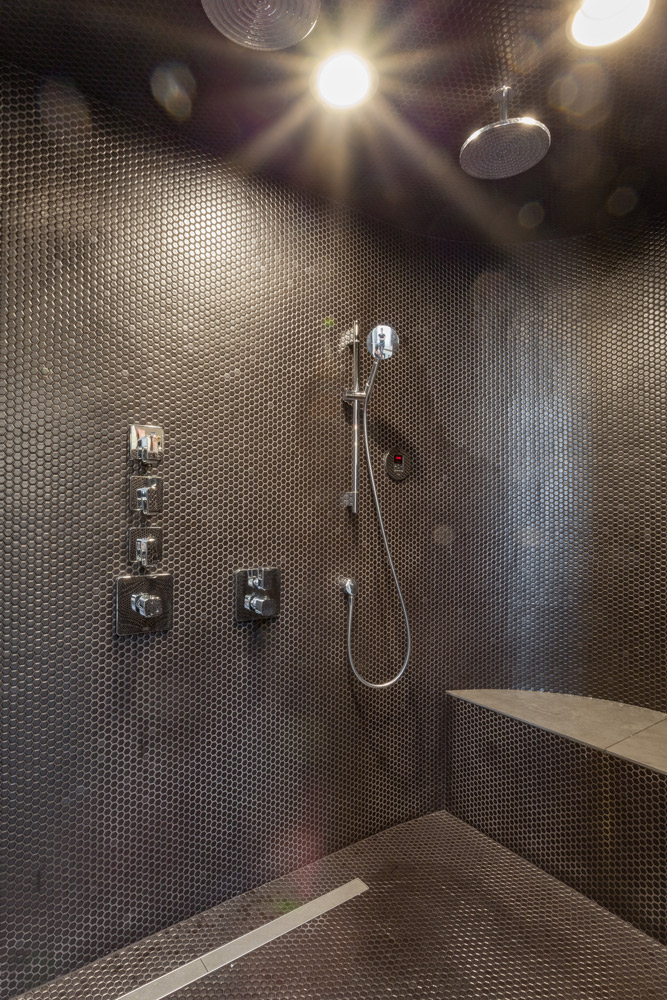 The feature of the room has to be the freestanding Napoli bath, which sits adorned by the soft grey geometric glass mosaic tiles and natural light from the window above. On either side of the bath is mirror faced full height cupboards which store her purses and bags.
