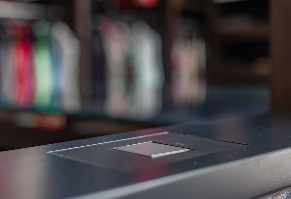 Back on the bathroom side we have a dual vanity unit with corian benchtop and framed mirror unit. Built within the mirror framing is pop-up powerpoints for easy access for hairdryers and electric shavers. Parallel to the vanity is the makeup station. Our client wanted a space that she could sit down at and apply her makeup of a morning whilst still being close to the basins.
