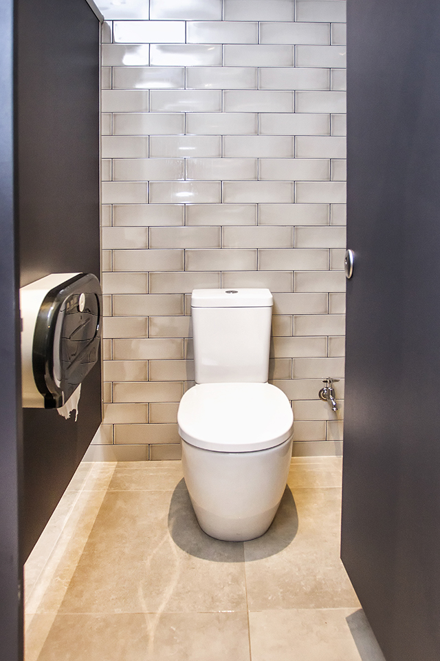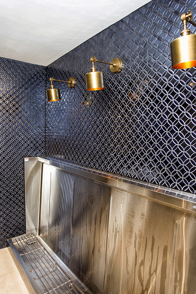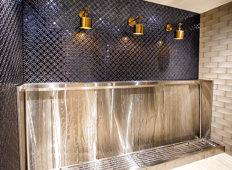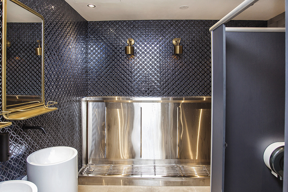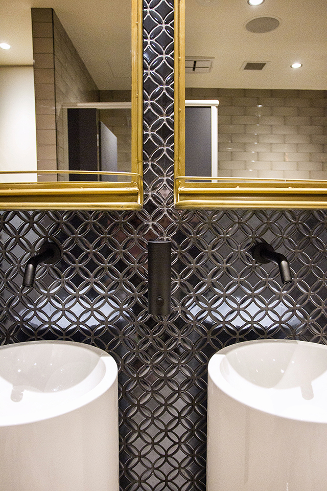 Additional warm tones have been incorporated into the space by carefully selecting bronze highlight pieces. Seductive bronze framed mirrors sit above two feature pedestal basins.While large bronze wall mounted pendant lights protrude along the length of the space, the lights emit warm light downwards, contrasting the cold steel of the wall-to-wall length urinal.