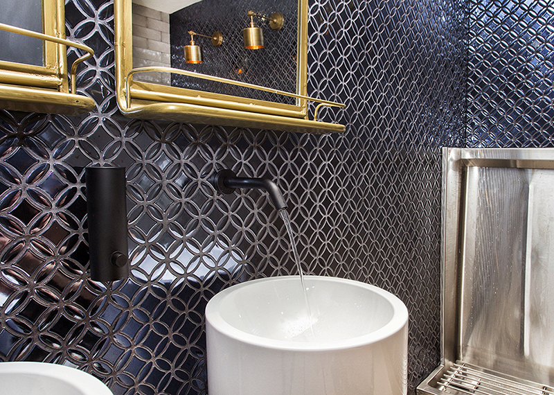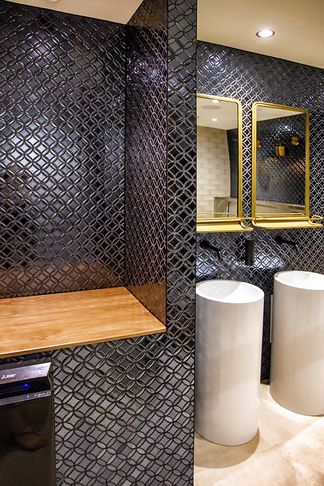 The original bathroom had two single urinals, a toilet cubicle and a double basin. We understood the necessity for cohesion throughout the entire club: this space deserved special attention to complement the surrounding elegant venue. Navy glass mosaic tiles bring the room to life, embedding that glitz and glamour feel into the room with a reflective kaleidoscope effect. The space is complemented with an olive-grey subway wall tile and large format Italian porcelain floor tiles. The black grout against the subway tiles creates a striking contrast.
