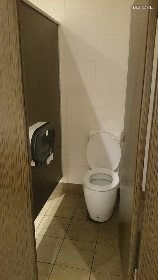 A charcoal, textured laminate has been specified for the toilet partition to maintain that sense of luxury throughout the space. With the entry space being finished off with a beautiful featured timber benchtop, this bathroom now radiates warm opulence as a space both impacting and functional.