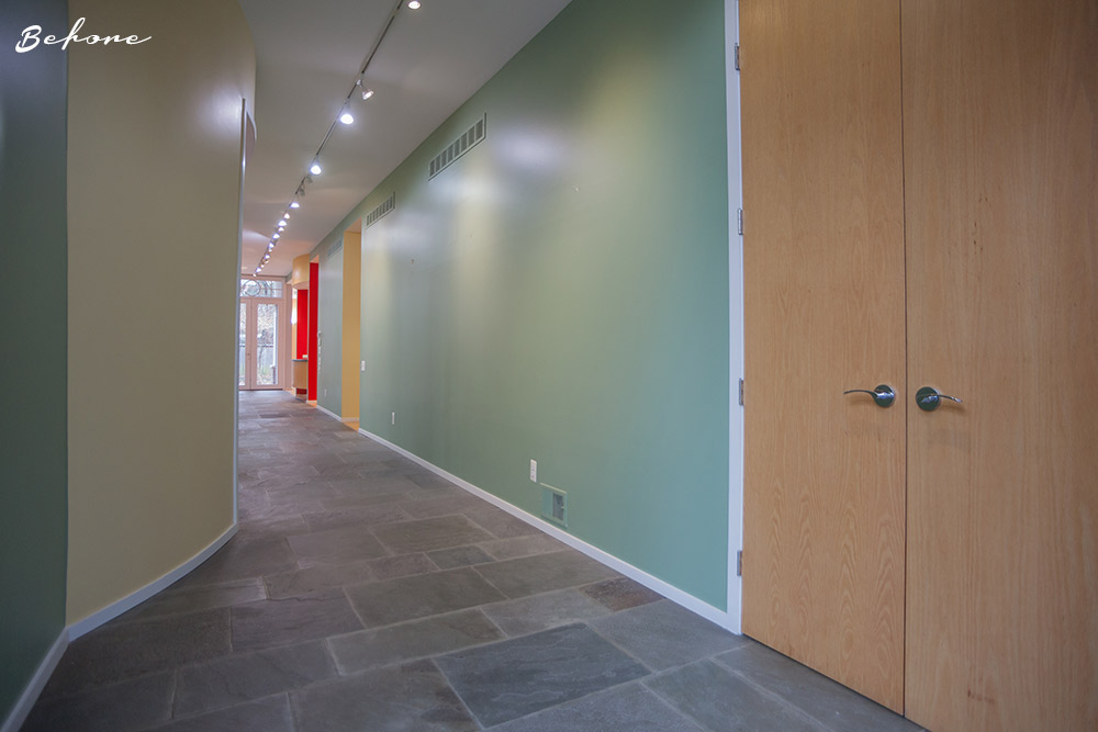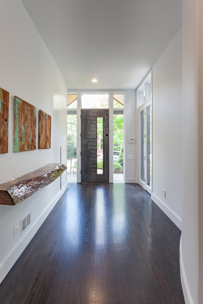 A new front door which has an Axolotl coating (rustic metal) is our first hint of the Industrial style to make an appearance.The old timber floors were throwing a lot of yellow so we stripped them back completely and re-stained them in a black ebony matt finish. That alone has made one of the biggest differences throughout the common areas.The entry into the home has a reclaimed timber shelf with artwork above that are sentimental pieces to our client.