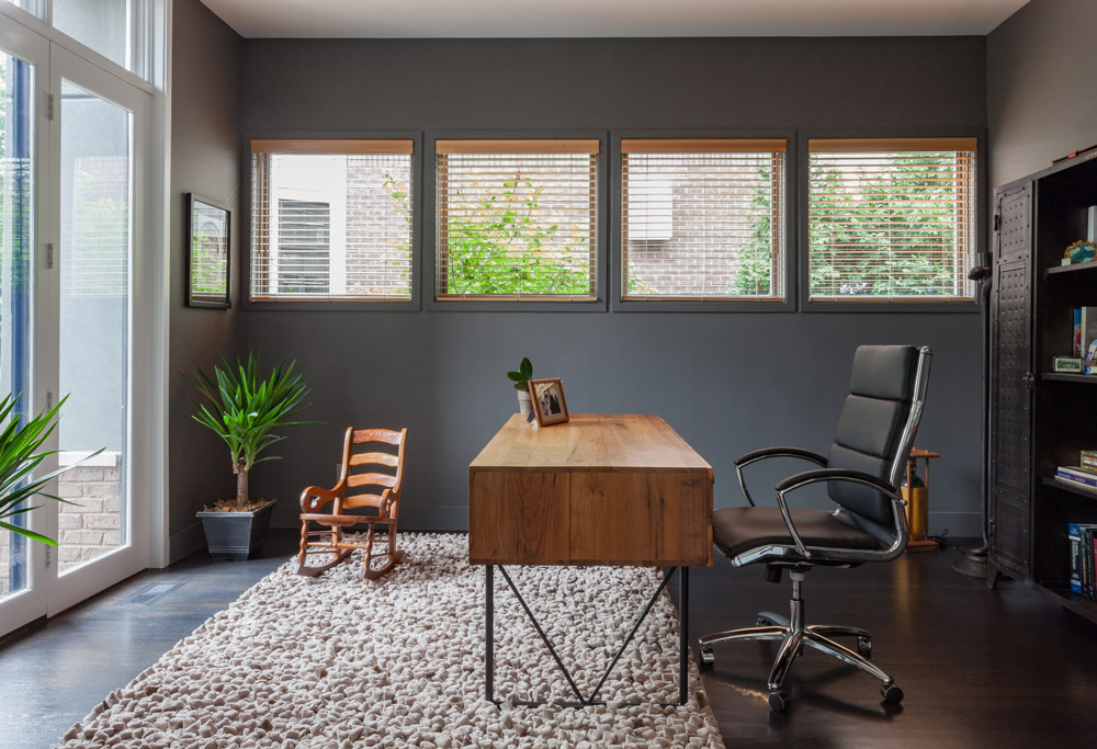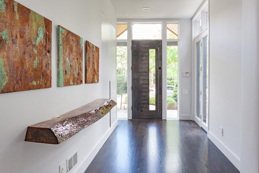 The new front door, complete with an Axolotl coating, indicates immediately the industrial style of this home. The old timber floors were stripped back and re-stained to a black ebony matte finish.