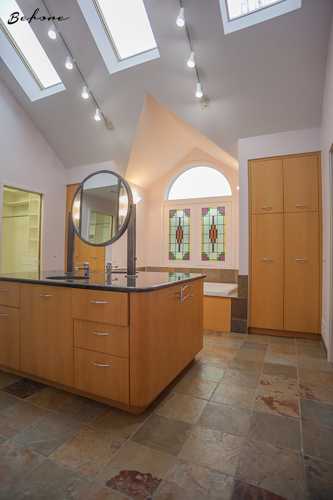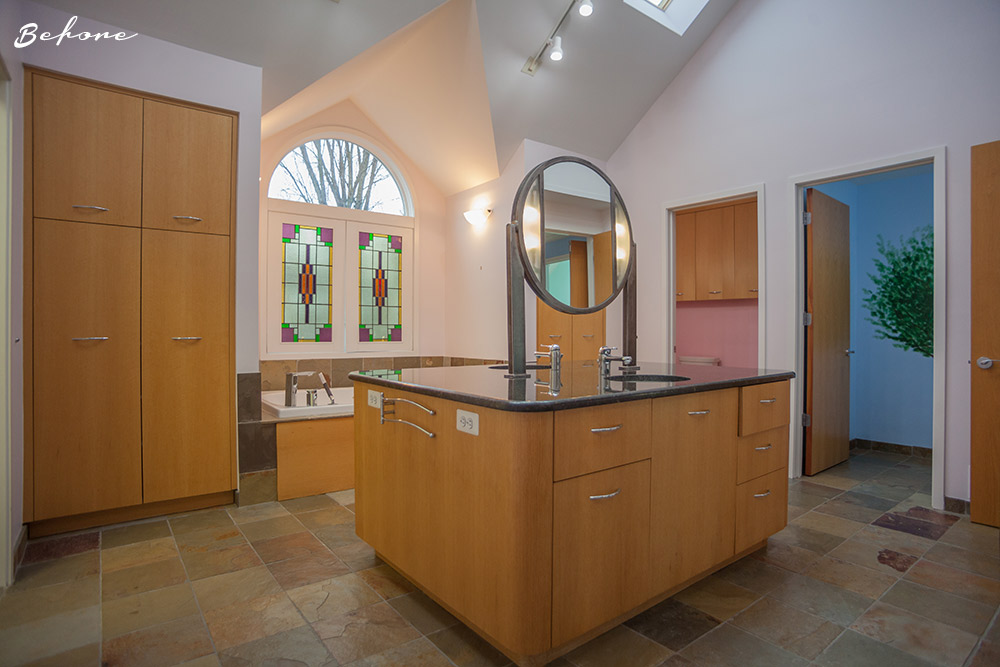 The master bedroom was a spatial dream, but lacked zoning. We craftily separated this space into three sections: a bedroom, an ensuite and a robe. Now the suite is multi-functional and not “wasted” space.