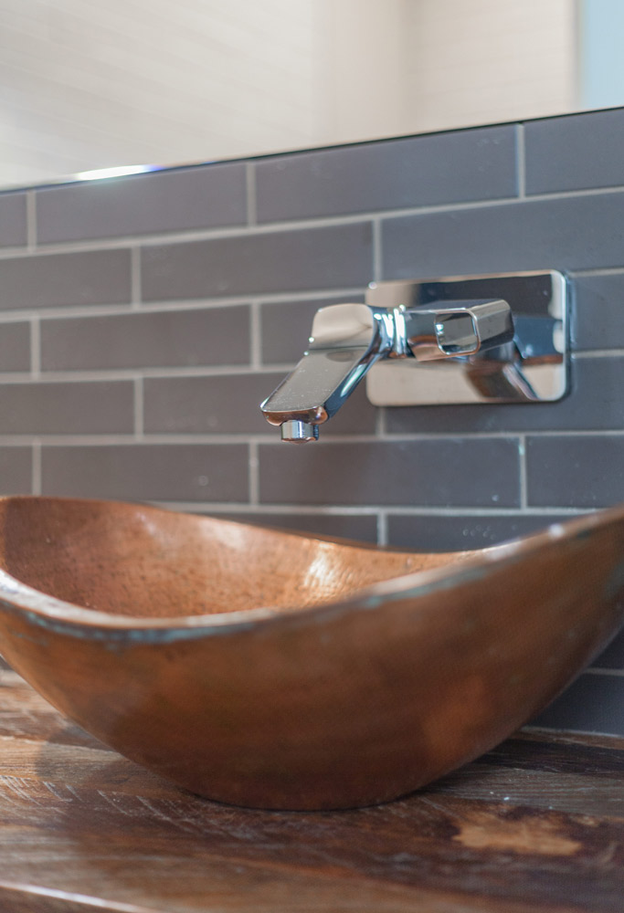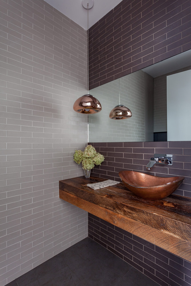 The guest powder room consists of three different grey tiles. To bring a contrast, we used a custom made reclaimed timber benchtop and copper highlights in the basin and pendant light.
