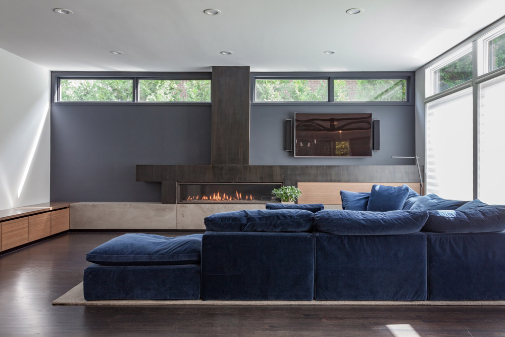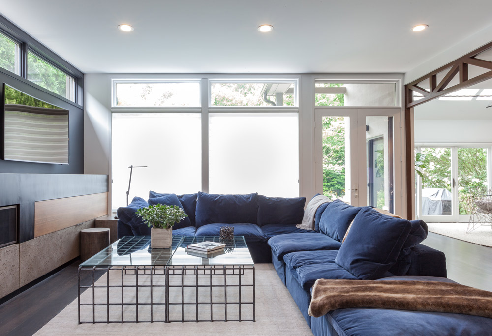 The main living room (great room) in the home now replicates a modern and inviting style. A linear gas fireplace has been installed with stunning timber veneer joinery on either side, designed for storing entertainment devices, cushions and blankets. A show-stopping blue velvet lounge adds a bright contrast of plush, sophisticated colour.