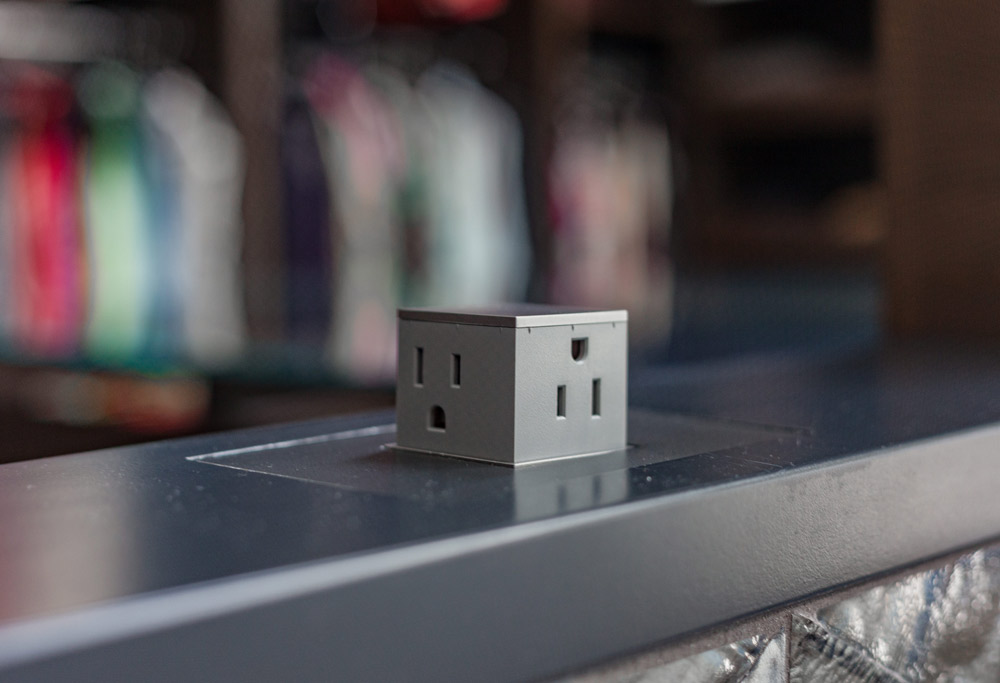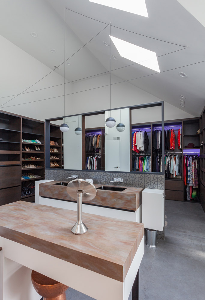 The walk-in robe also features a dual vanity unit (with pop-up power points for hairdryers and electric shavers) and a makeup station. Our clients wanted a space to sit and apply makeup, do hair,mentally prepare for the day, whilst still being close to the basins in the ensuite.