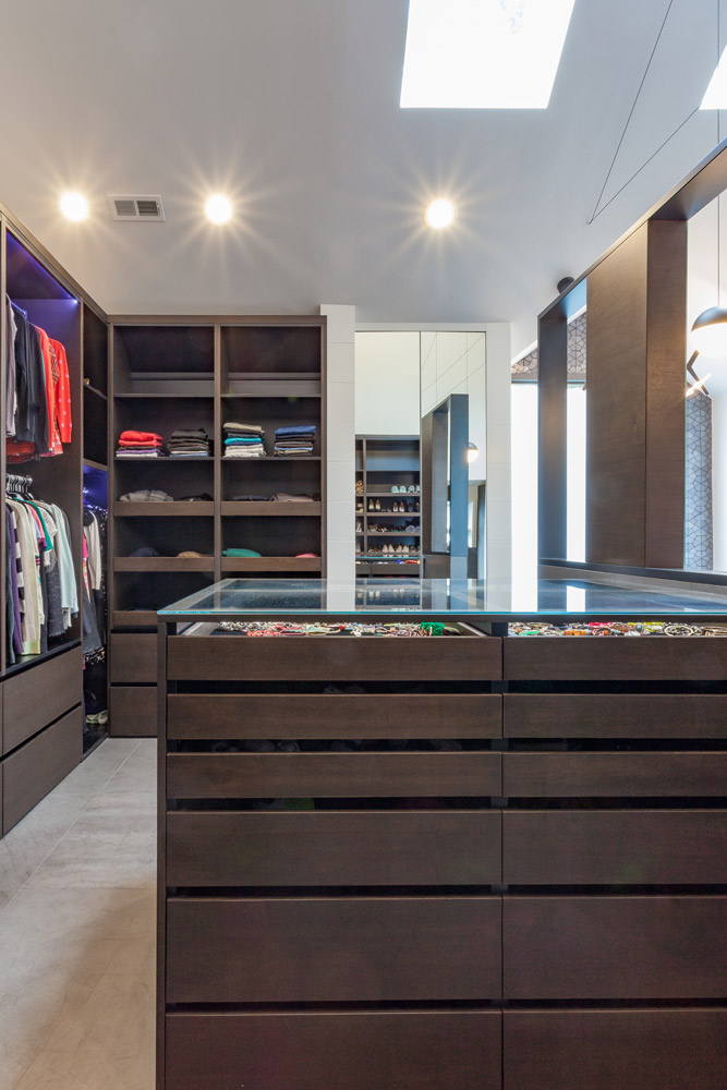 The walk-in robe is so spectacular it needs its own introduction. We created a vast open space, splitting between husband and wife: hubby’s on the bedroom side, wifey’s the ensuite side. This robe is a walk-in wonderland that works harmoniously with the ensuite space. New ducted ventilation and heated floors allows our clients to have a partially open-style robe as there is no condensation or moisture build up. The wife’s side of the robe was meticulously designed to fit every pair of heels, boots, long dresses, gym clothes, work clothes, purses, jewellery, and accessories… everything that she owned! We utilised full ceiling height for the robes to maximise space. The vanity unit houses her accessories and under garments with a glass top so that jewellery pieces are displayed with easy to reach access.