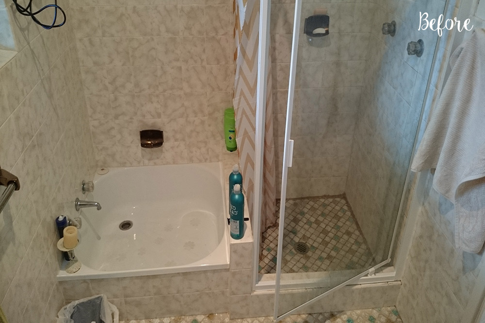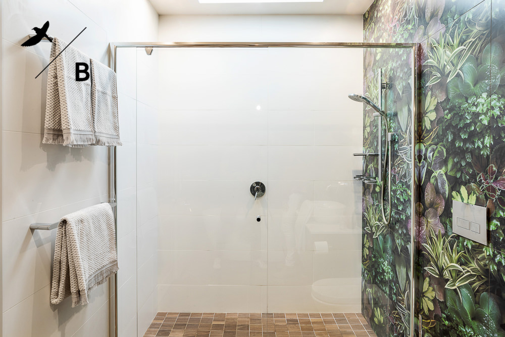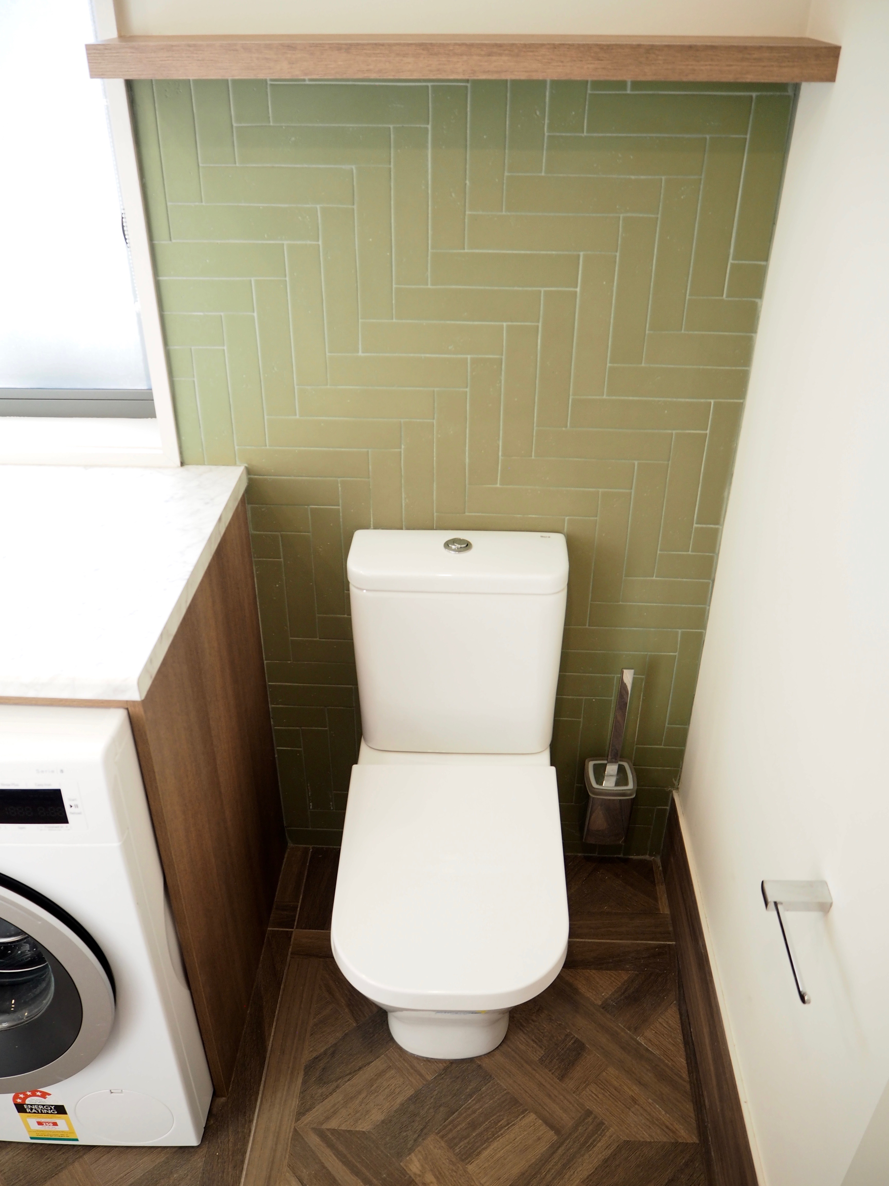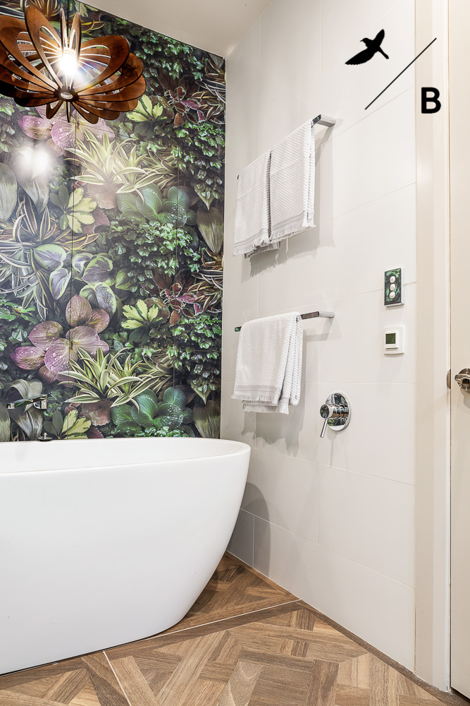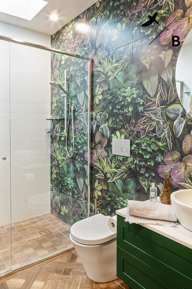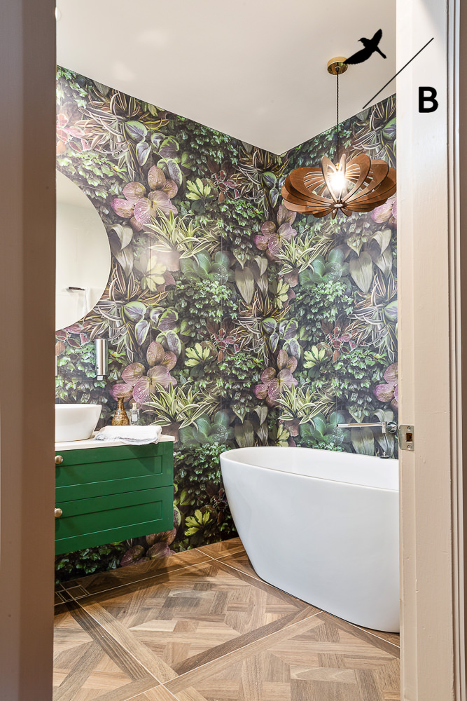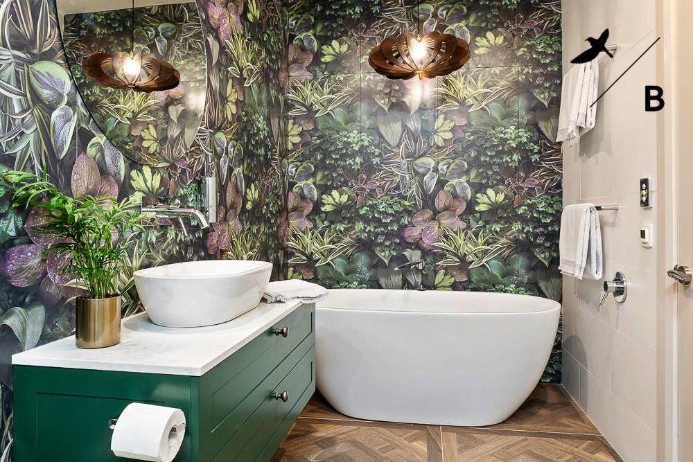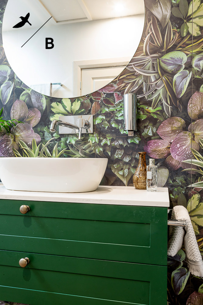 It is now time to address the FABULOUS elephant in the room – the bathroom’s most striking feature. Like most people, you may be shocked to discover this jungle inspired tile is in fact a tile, and not at all wallpaper! This tile set the theme for the colour green to be featured throughout the home. You can find these tiles in the kitchen as well.
