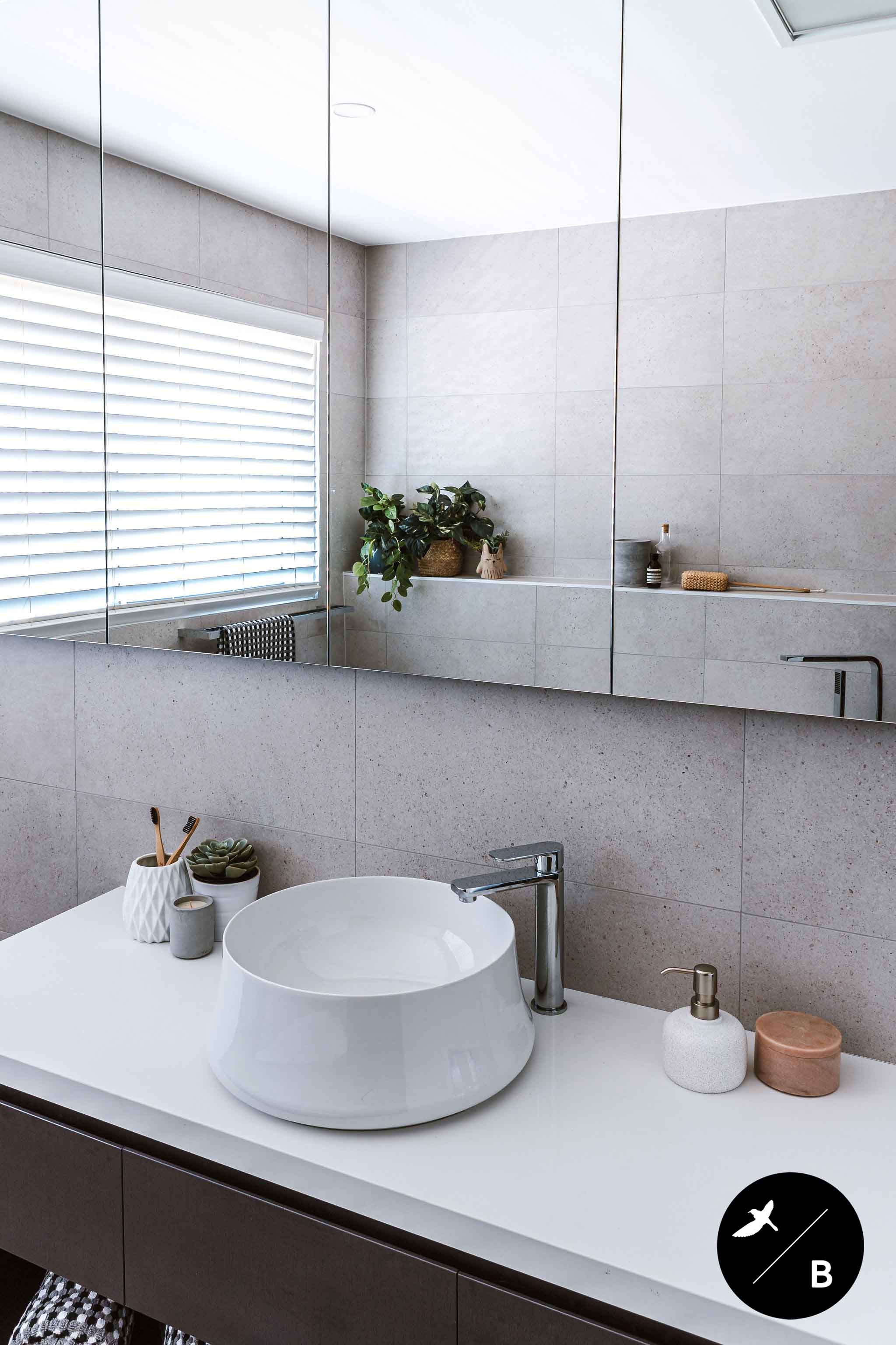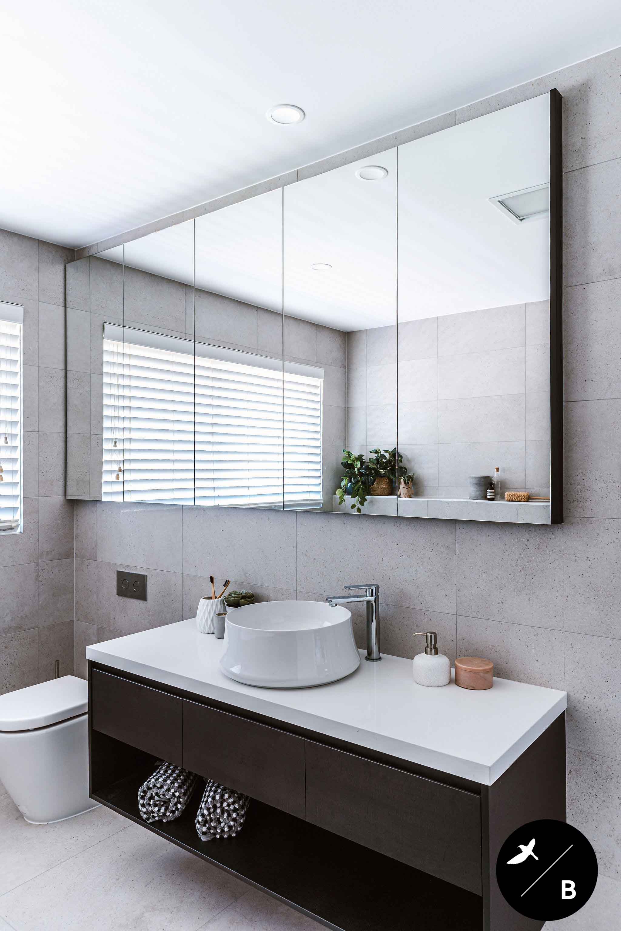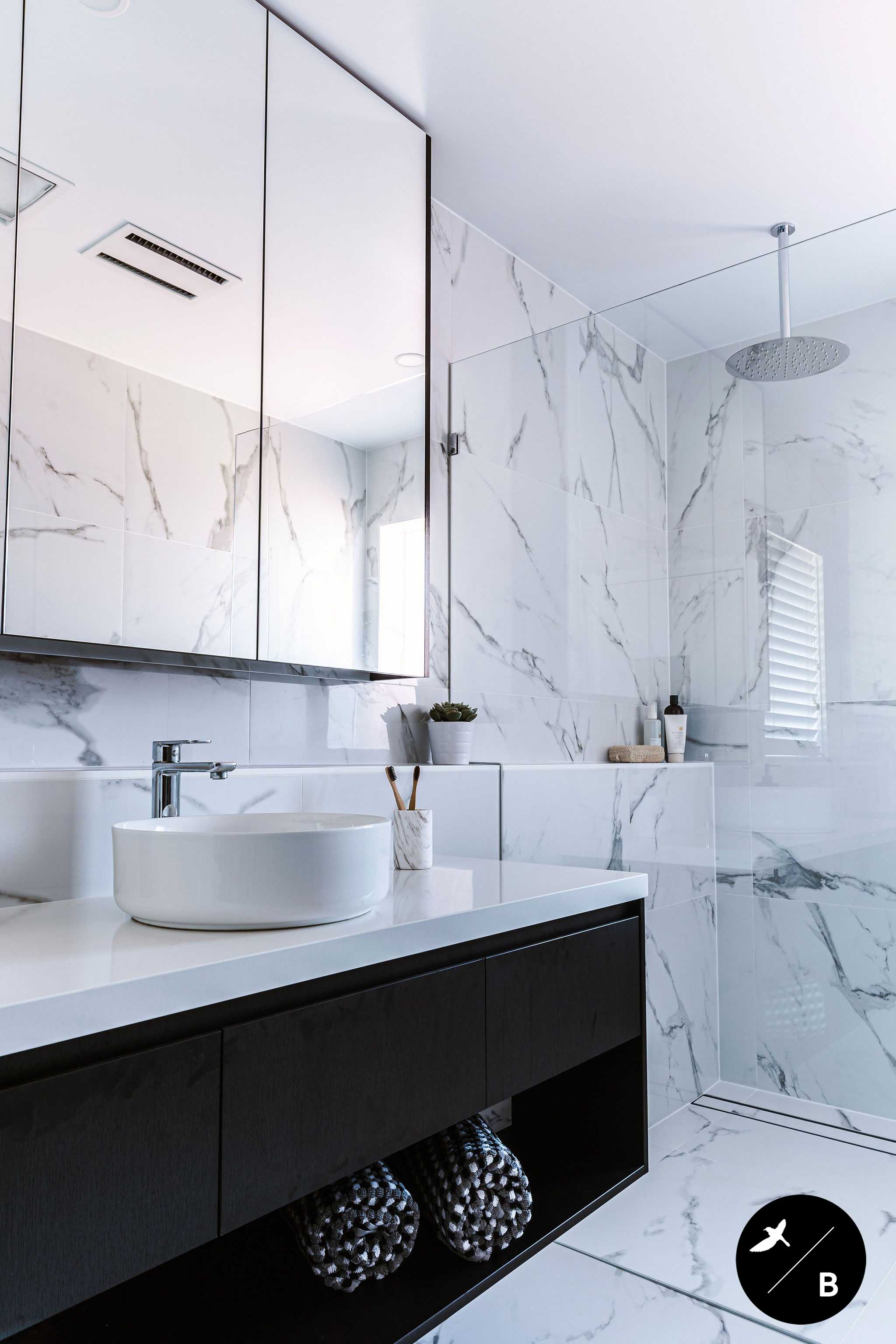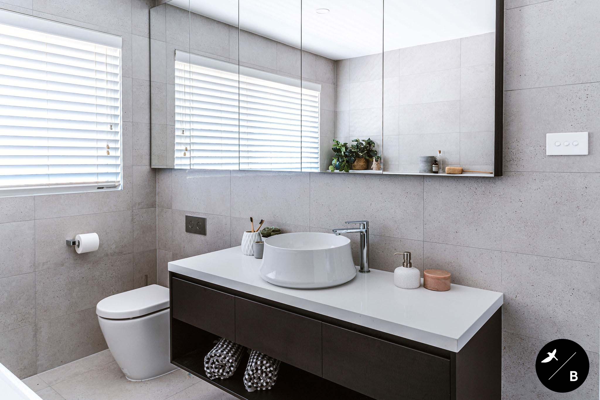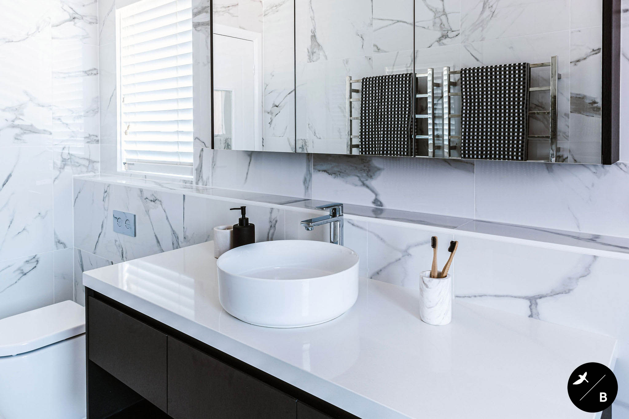 Common elements between all three Bathrooms are the wall to wall ledges, the mirror cabinetry and the polished chrome tapware and accessories. These subtle similarities create cohesion and continuity throughout the home, showcasing harmony throughout all the freshly designed spaces.
