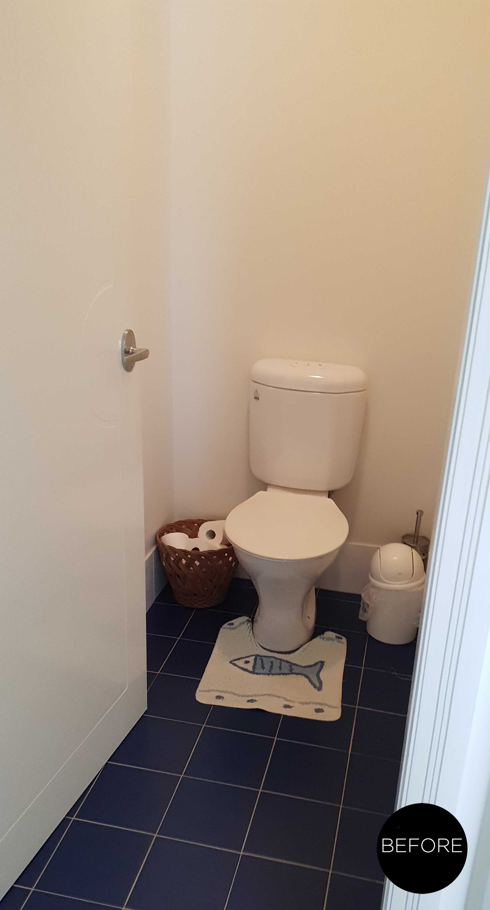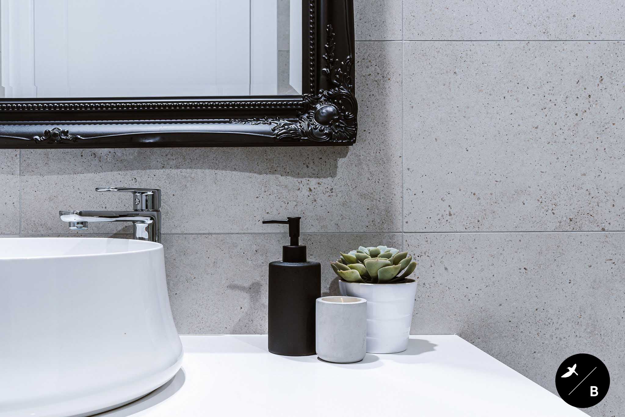The Powder Room on the Ground Floor is designed specifically to impress our clients’ guests. The existing space featured terracotta and white tiles – very late 1990’s, and again, our brief was to “give this home a birthday”. The Powder Room mirrors the Main Bathroom aesthetic, allowing our clients’ guests to experience the home as a whole: another frameless glass shower, the light tiles which feature a subtle movement, the black custom vanity and polished chrome. This Powder Room allows the guests to feel like part of the family!