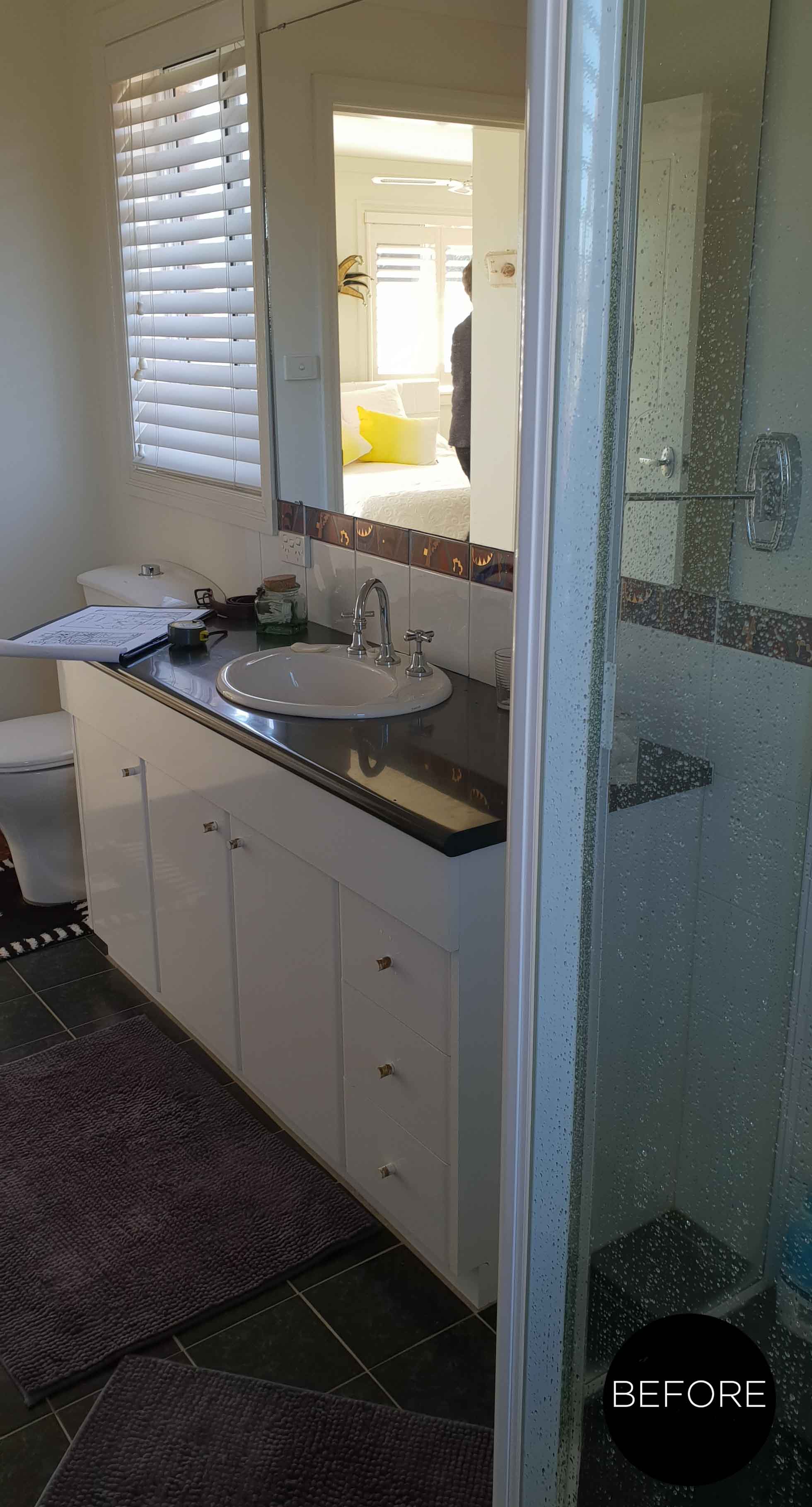 The Ensuite off the Master Bedroom is exemplary. The floors and walls are tiled with a striking marble look tile and immediately lends to a luxurious aesthetic. We maintained both the existing layout and the existing windows, choosing to simply add functionality and engage the Classic aesthetic. The dated corner shower was replaced with a spacious shower; the specified custom black cabinetry adds a contemporary element, as does the white manmade stone benchtop with the round counter basin.