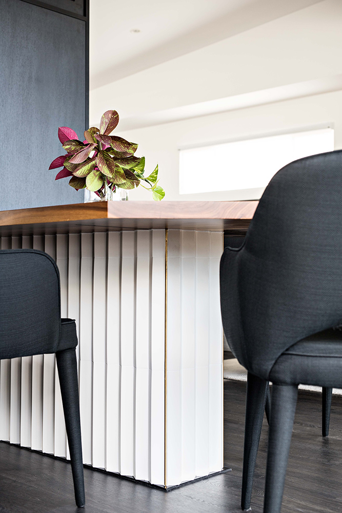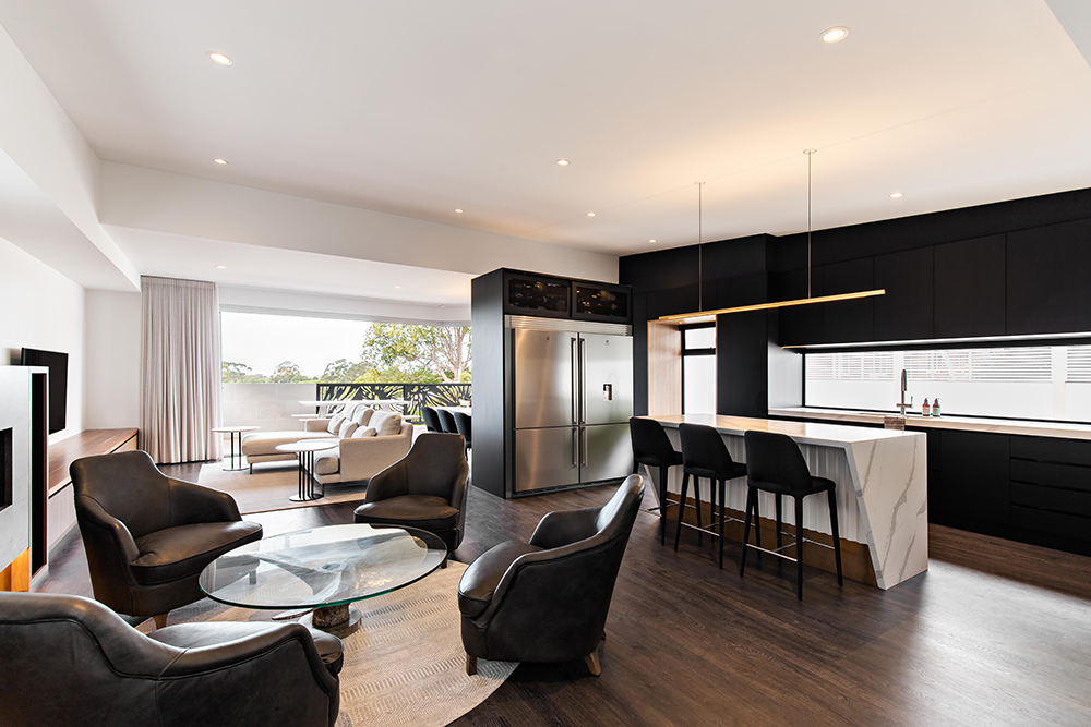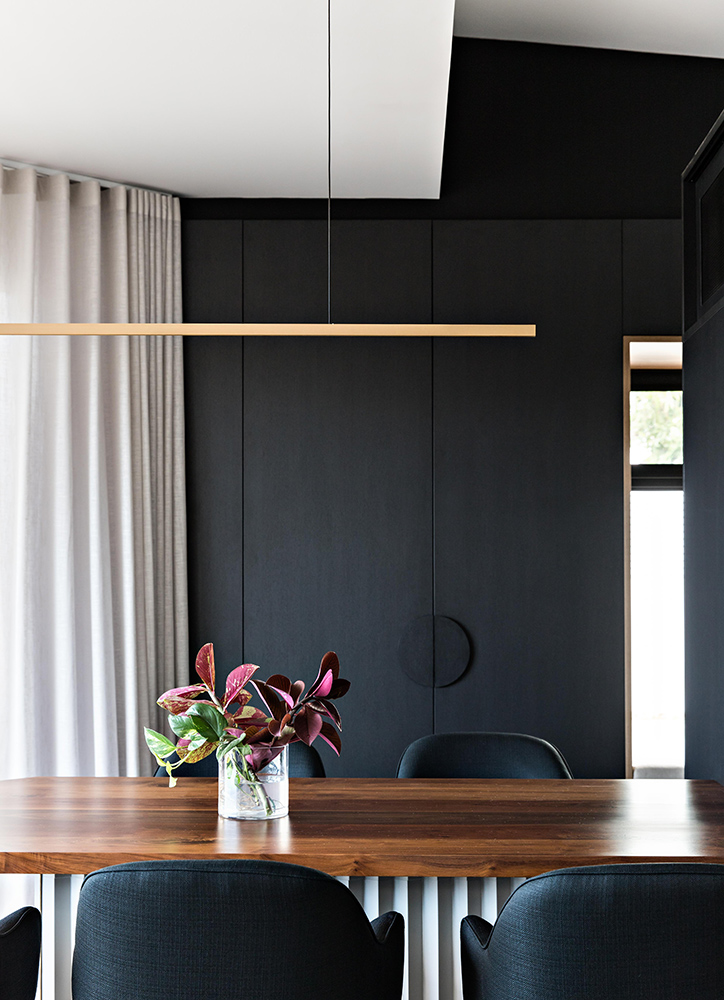 For this young professional couple, we wanted to create a moody interior that felt warm and inviting. We captured this aesthetic through the use of ebony timber floor and cabinet fronts. Walnut timber warms the space while the brass elements in the pendant lights and kickboards add a dynamic spark.