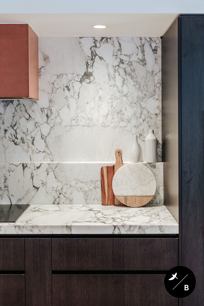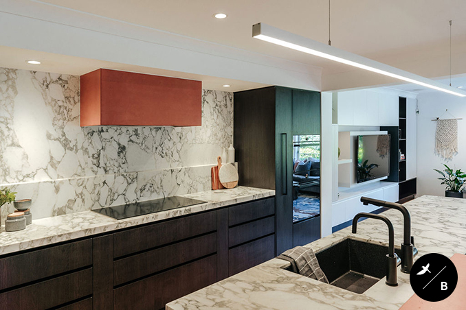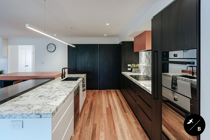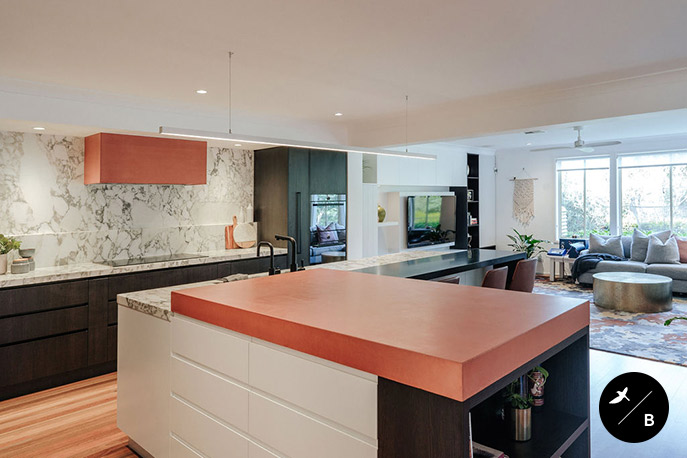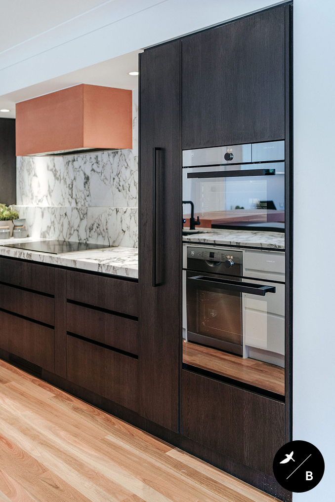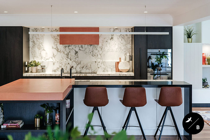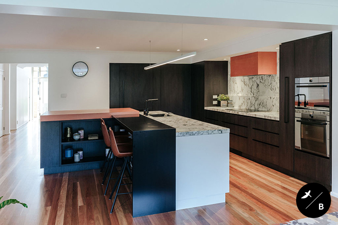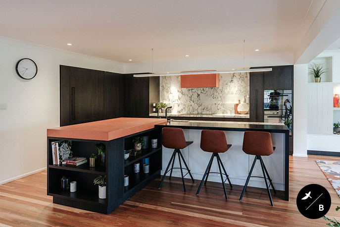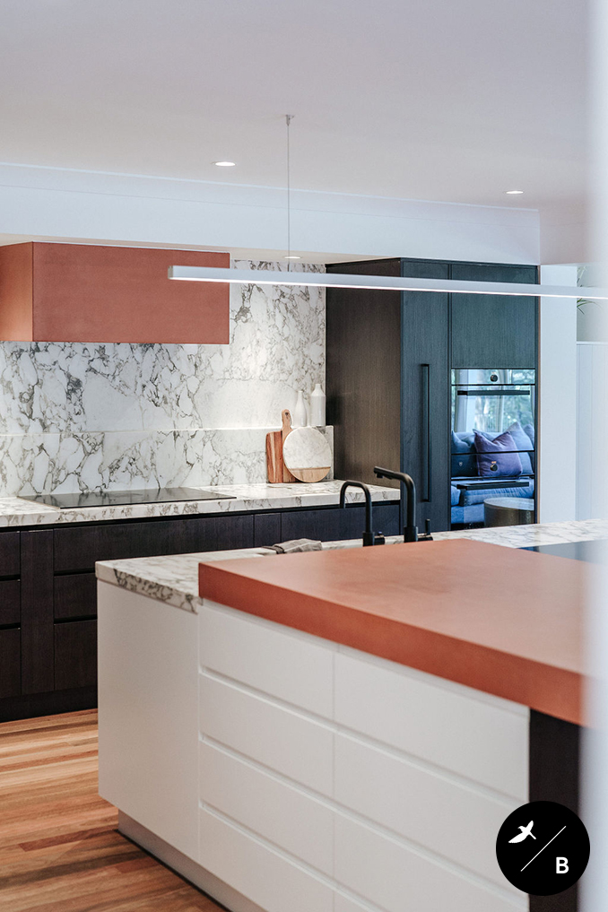 The Kitchen is the heart and the focal point of the home. Birdblack Design created a black and white background palette and then warmed the space with beautiful terracotta concrete around both the rangehood and the breakfast bar. Black stained solid timber and stunning natural marble are notable features in this kitchen space.