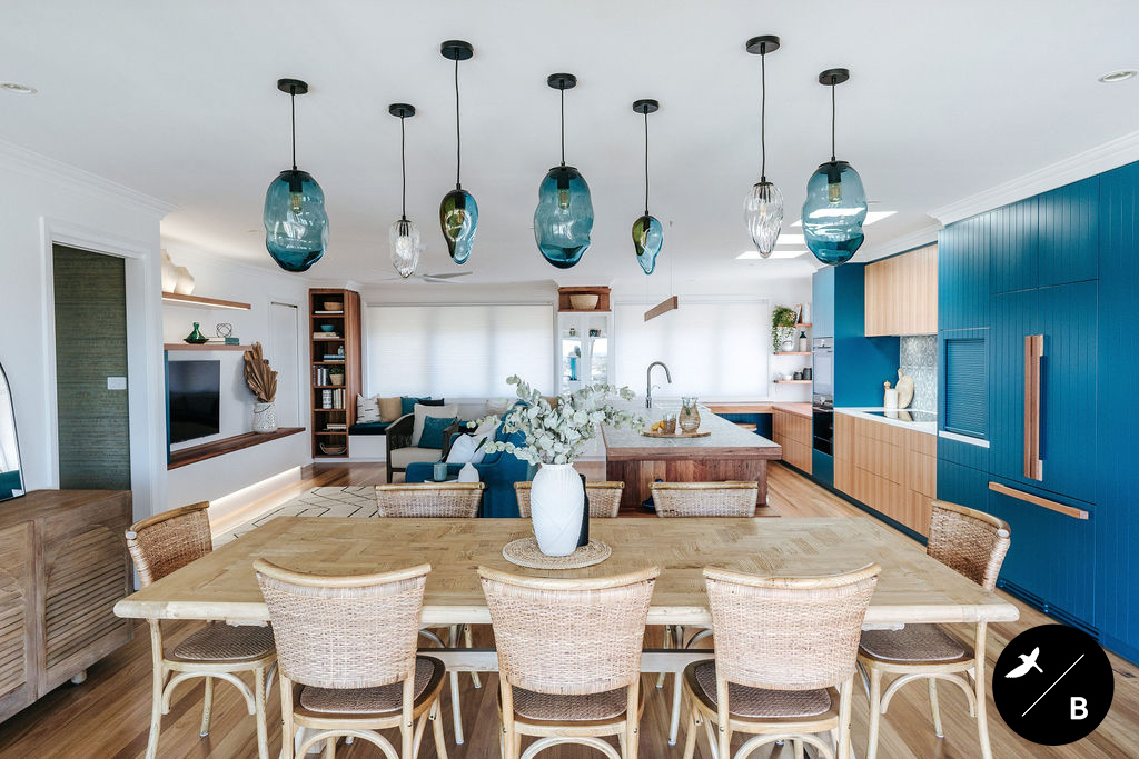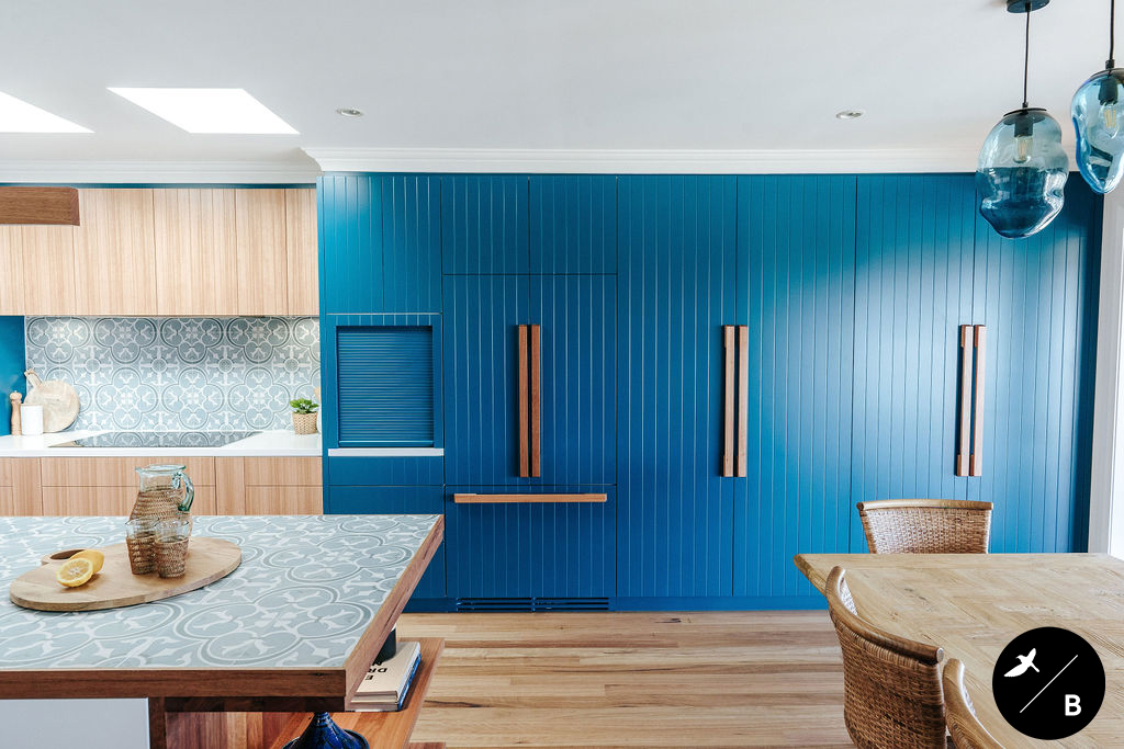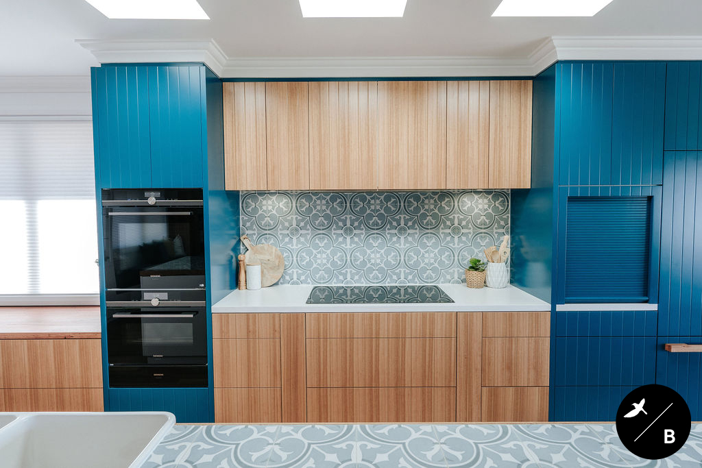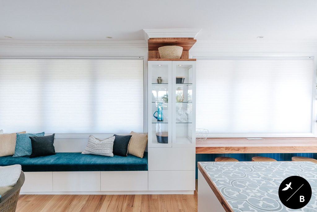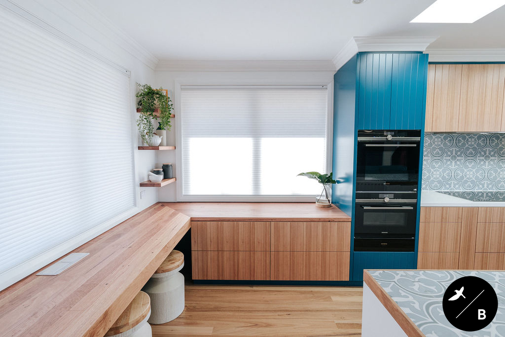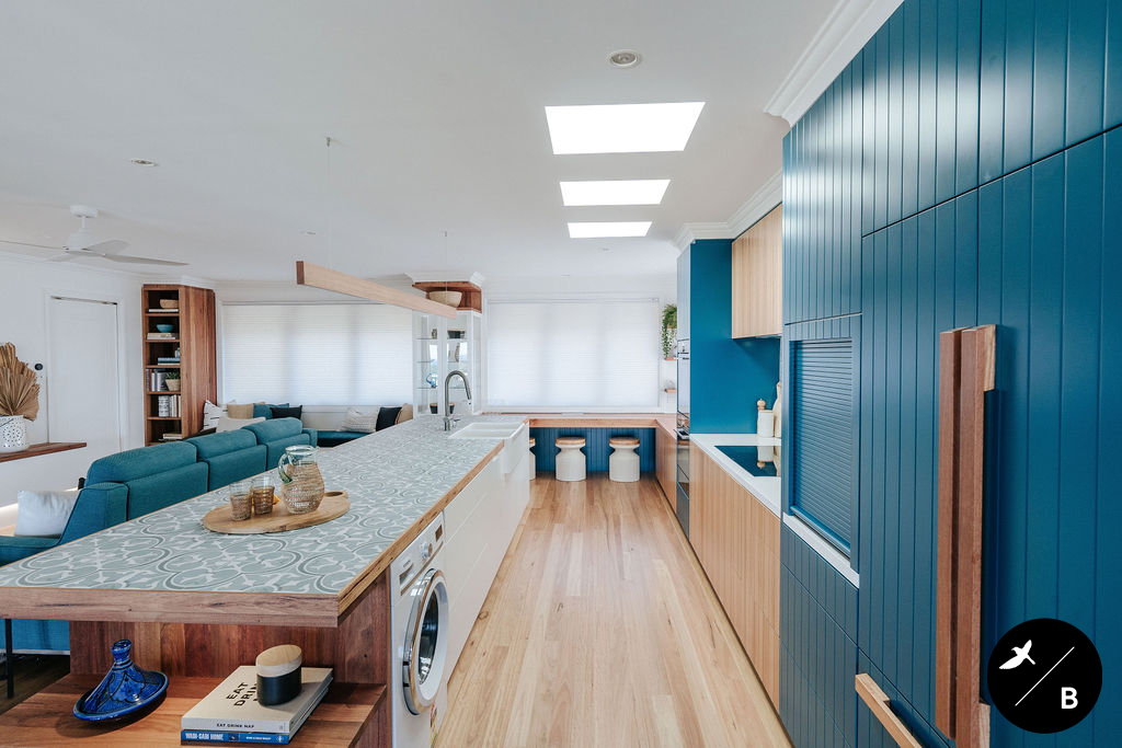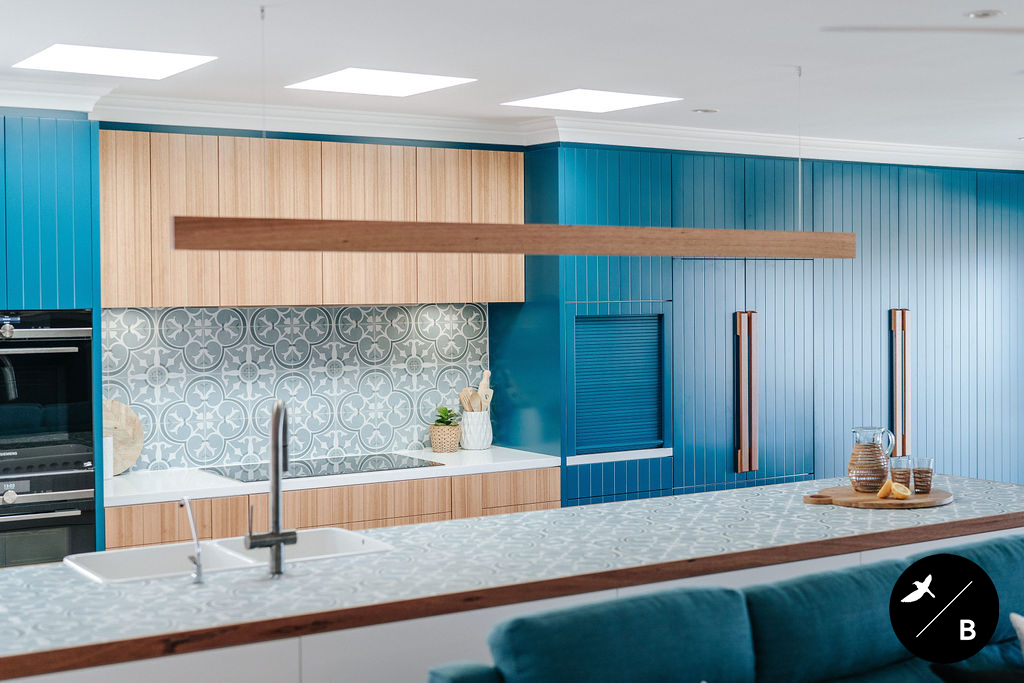 This homeowner has a great love of travelling; Morocco being a favourite. As the Bathroom was Moroccan-inspired, we wanted to continue this theme in the Kitchen and open-plan space. Morocco, famous for its bold colours and patterns, was the perfect inspiration for this home and resulted in this absolutely gorgeous teal Moroccan / Coastal fusion. Pops of the striking teal are featured throughout on numerous occasions, partnered with whites and solid Blackbutt timber.