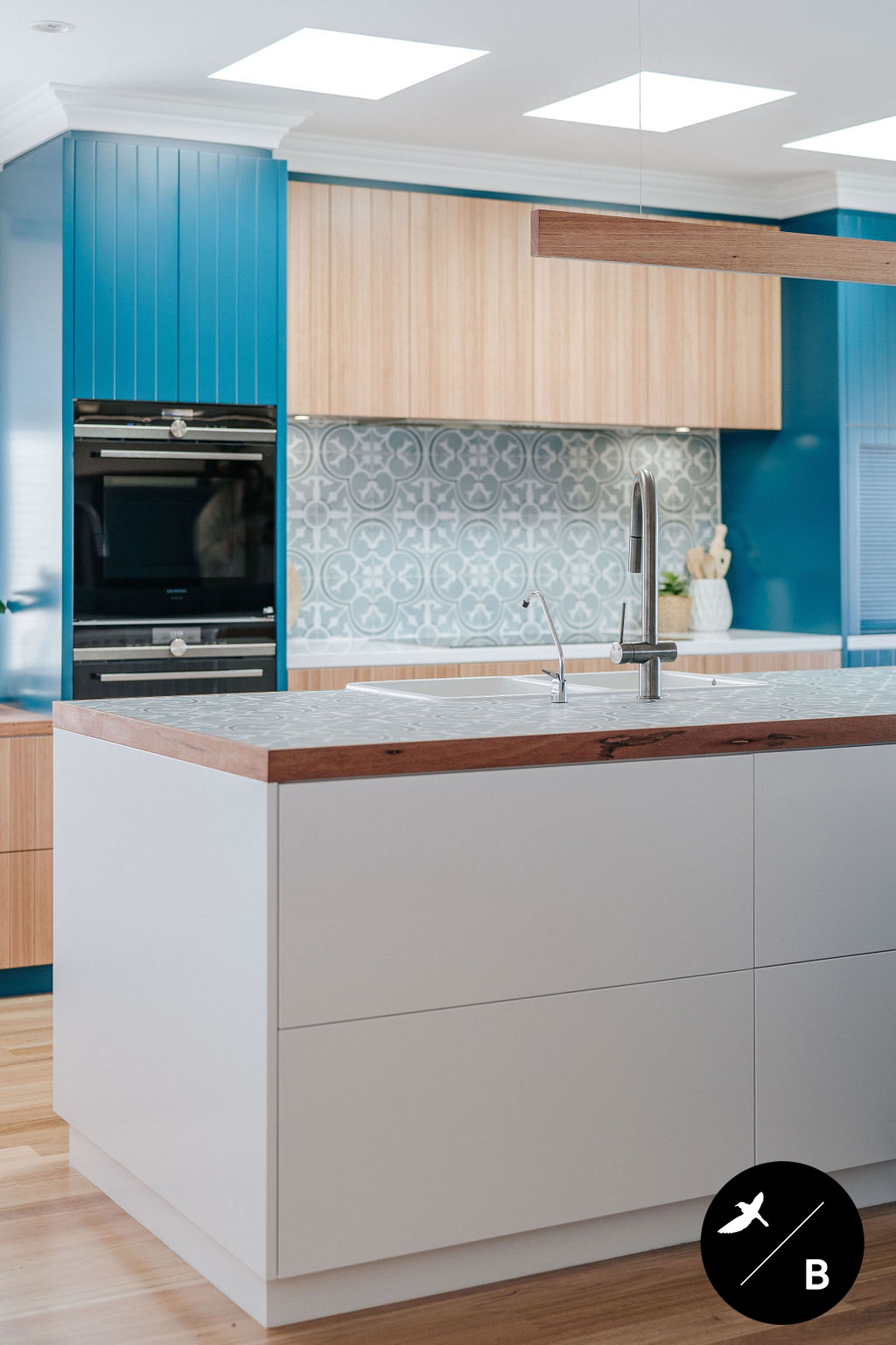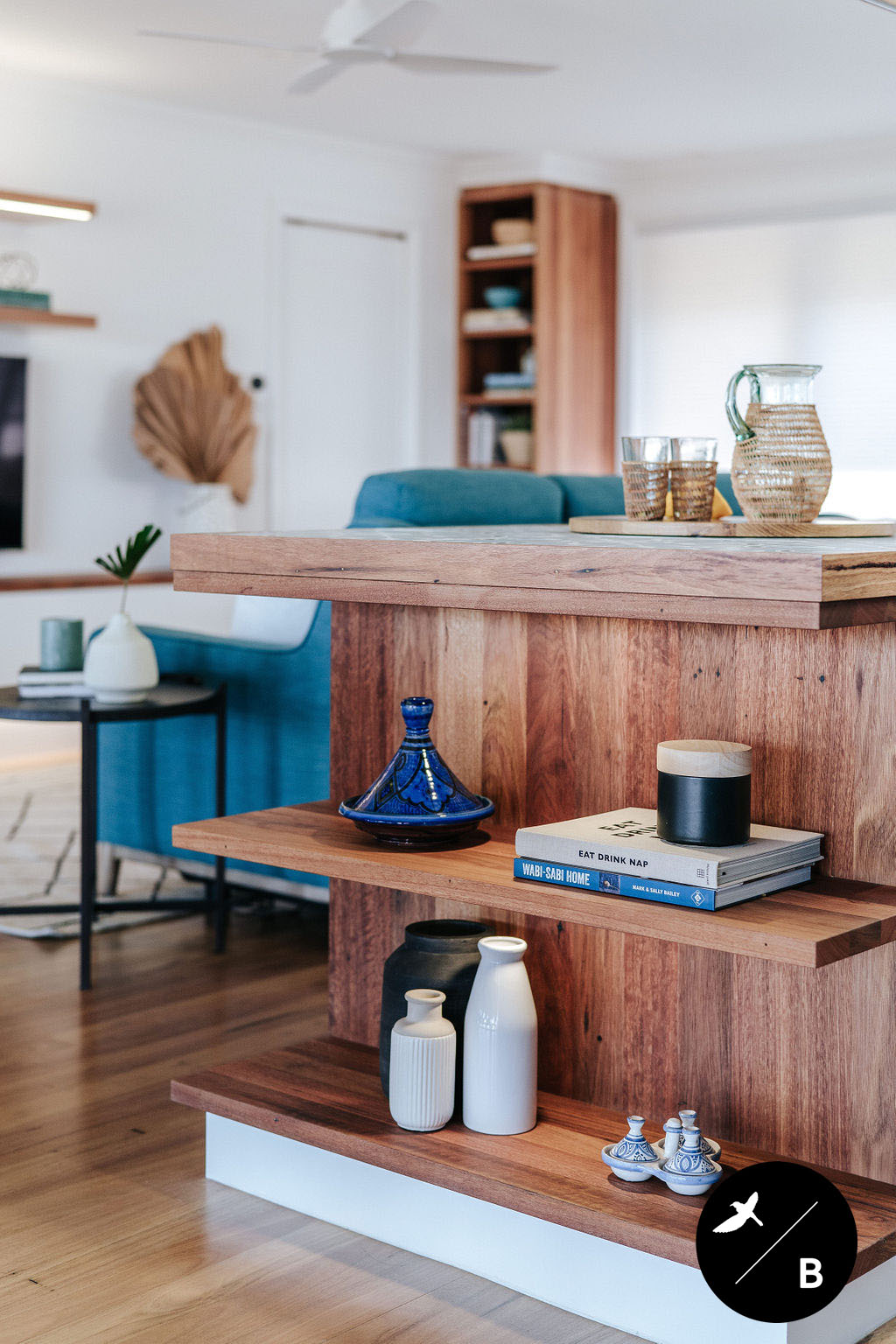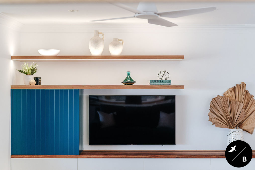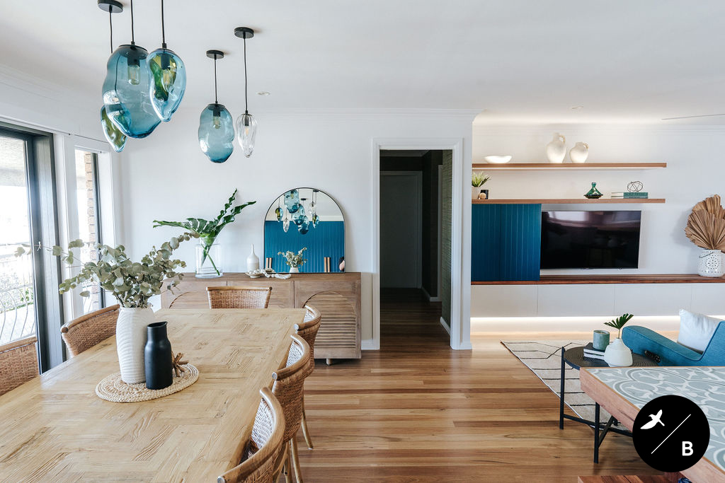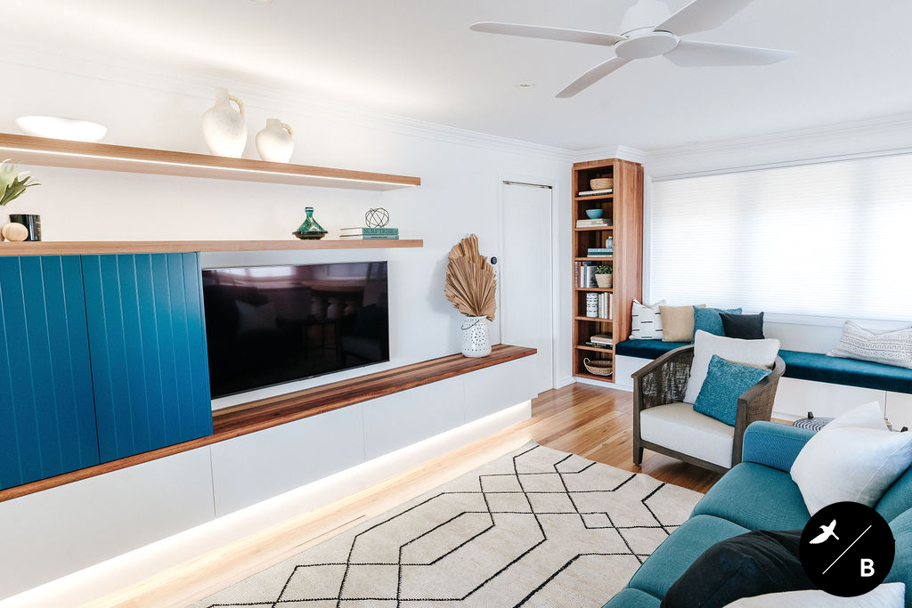 This homeowner has a great love of travelling; Morocco being a favourite. As the Bathroom was Moroccan-inspired, we wanted to continue this theme in the Kitchen and open-plan space. Morocco, famous for its bold colours and patterns, was the perfect inspiration for this home and resulted in this absolutely gorgeous teal Moroccan / Coastal fusion. Pops of the striking teal are featured throughout on numerous occasions, partnered with whites and solid Blackbutt timber.