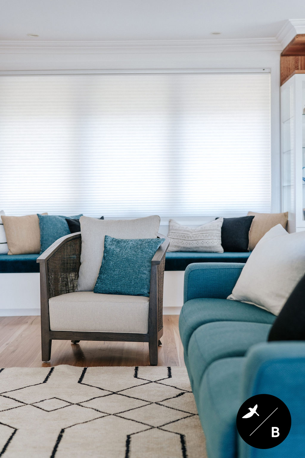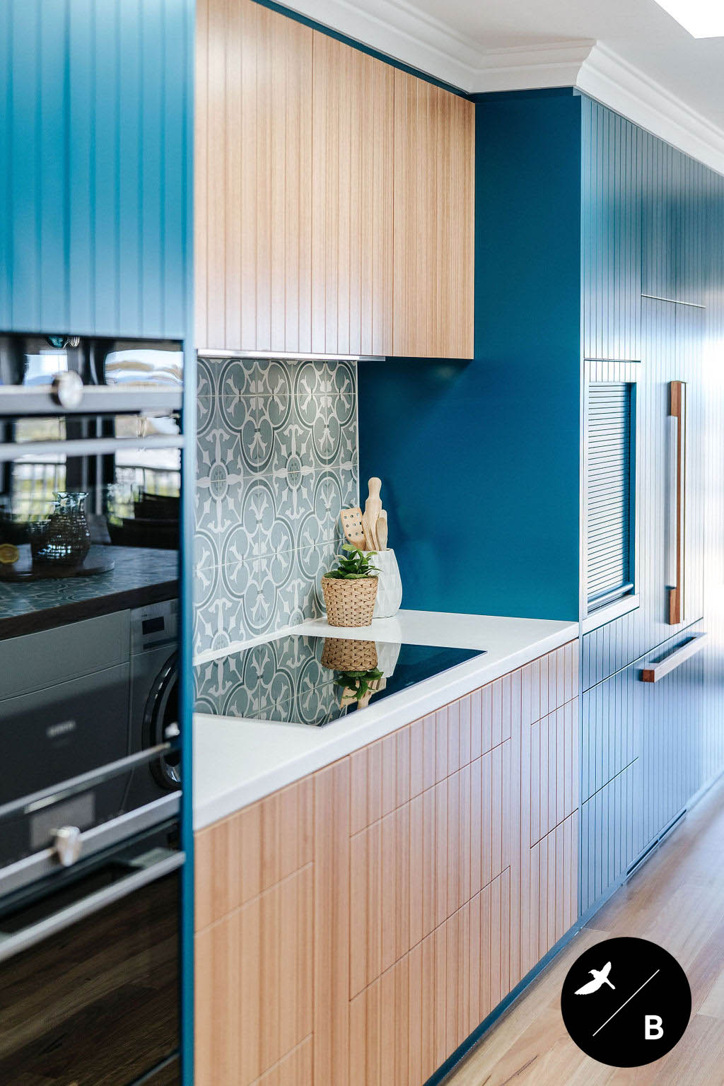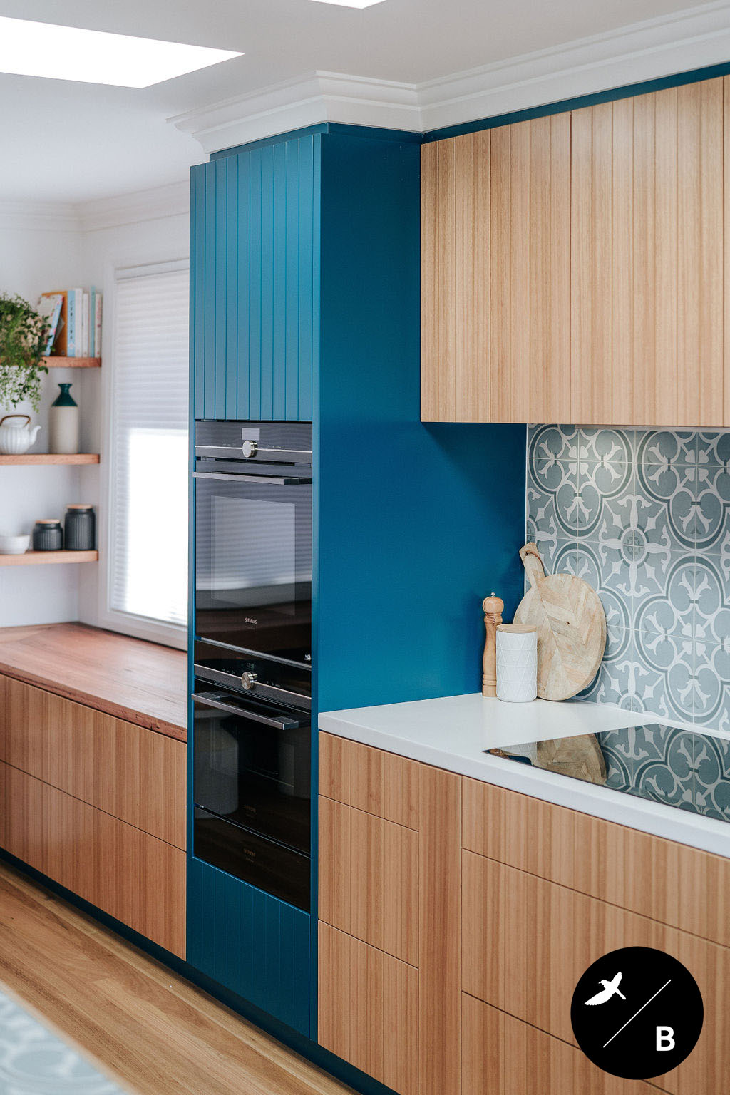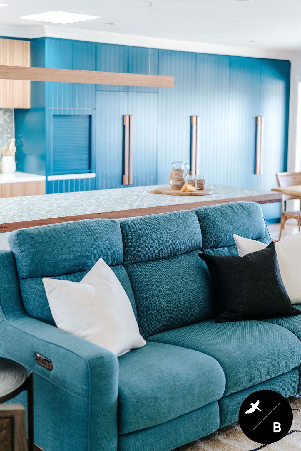 This homeowner has a great love of travelling; Morocco being a favourite. As the Bathroom was Moroccan-inspired, we wanted to continue this theme in the Kitchen and open-plan space. Morocco, famous for its bold colours and patterns, was the perfect inspiration for this home and resulted in this absolutely gorgeous teal Moroccan / Coastal fusion. Pops of the striking teal are featured throughout on numerous occasions, partnered with whites and solid Blackbutt timber.