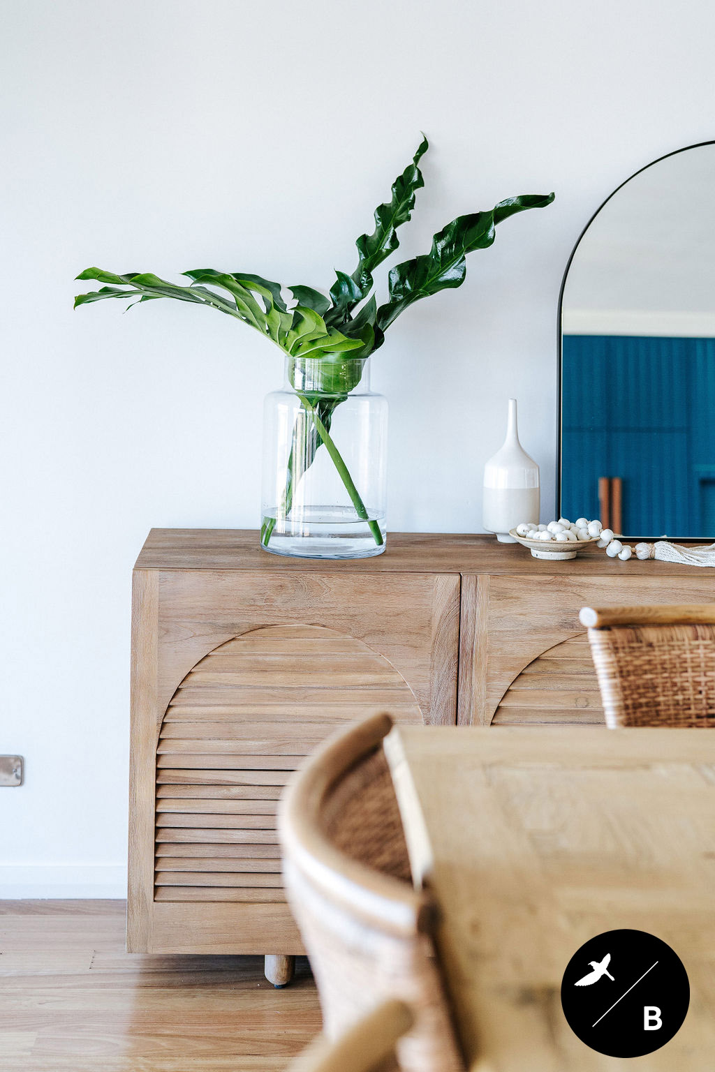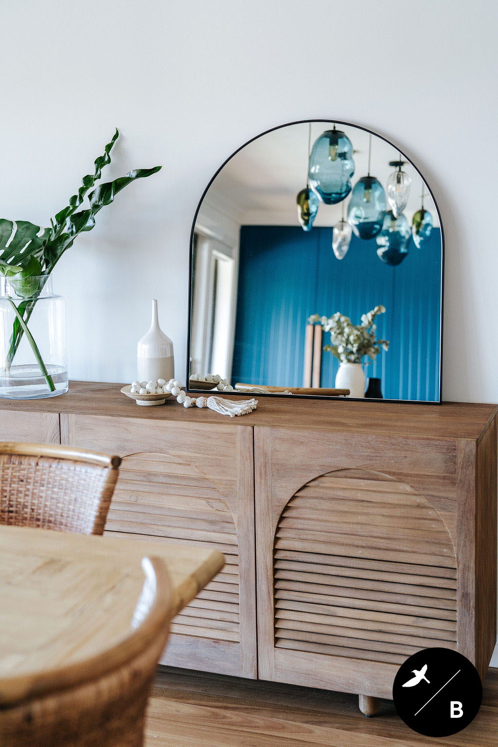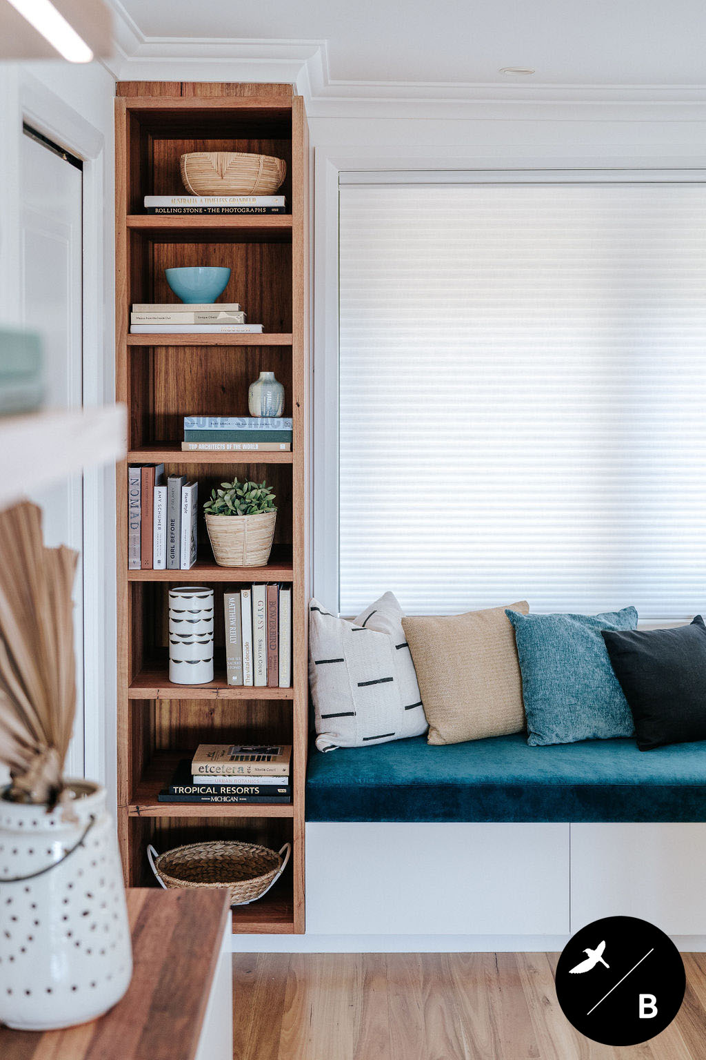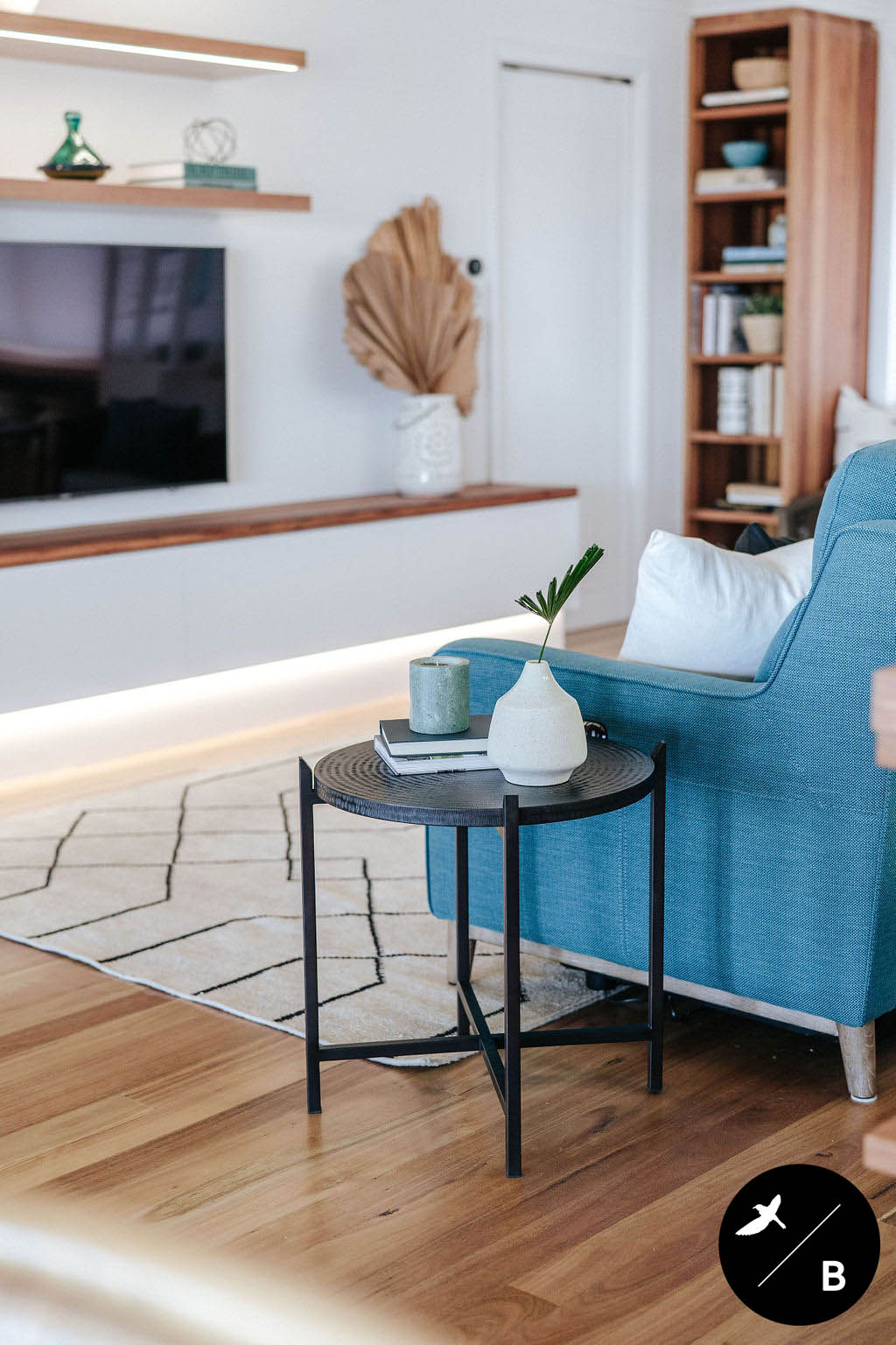 This homeowner has a great love of travelling; Morocco being a favourite. As the Bathroom was Moroccan-inspired, we wanted to continue this theme in the Kitchen and open-plan space. Morocco, famous for its bold colours and patterns, was the perfect inspiration for this home and resulted in this absolutely gorgeous teal Moroccan / Coastal fusion. Pops of the striking teal are featured throughout on numerous occasions, partnered with whites and solid Blackbutt timber.