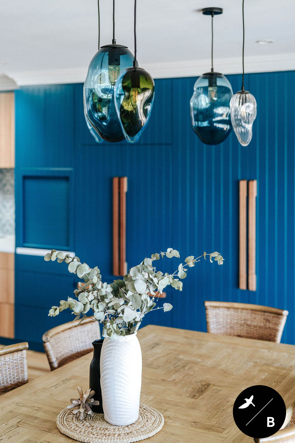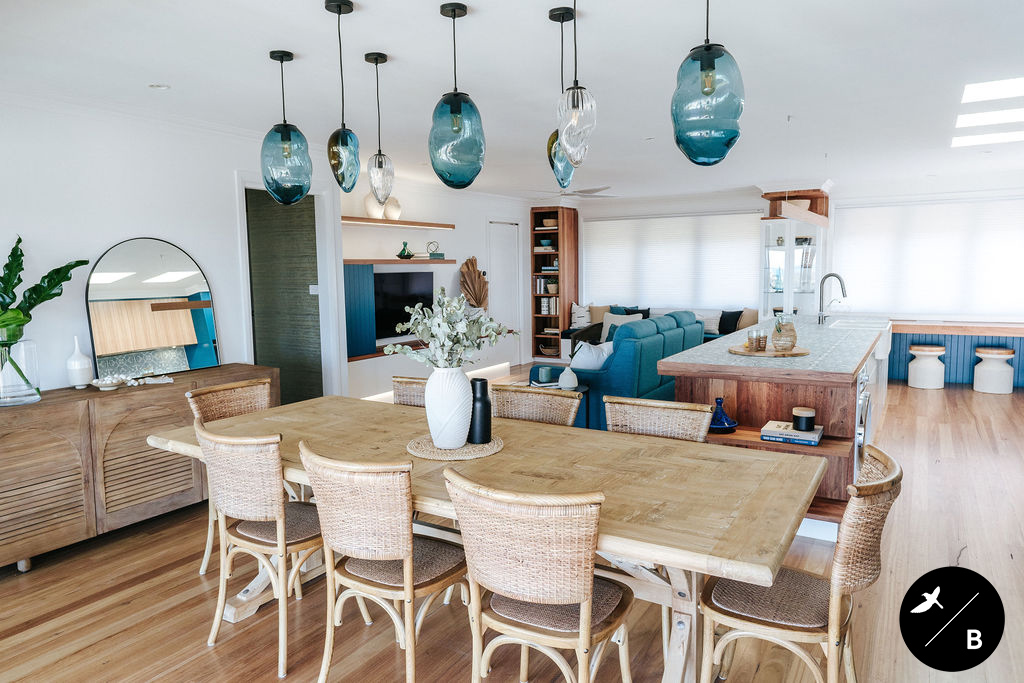 Hand-blown glass pendants clustered above the timber Dining Table are another stunning feature in this home. These beautiful pendants are an artistic addition within the space, picking up the teal colour and formalising the Dining Area. The ceiling in this grand open-plan space features three skylights. These magnificent skylights allow natural lighting to brilliantly flow throughout the space.