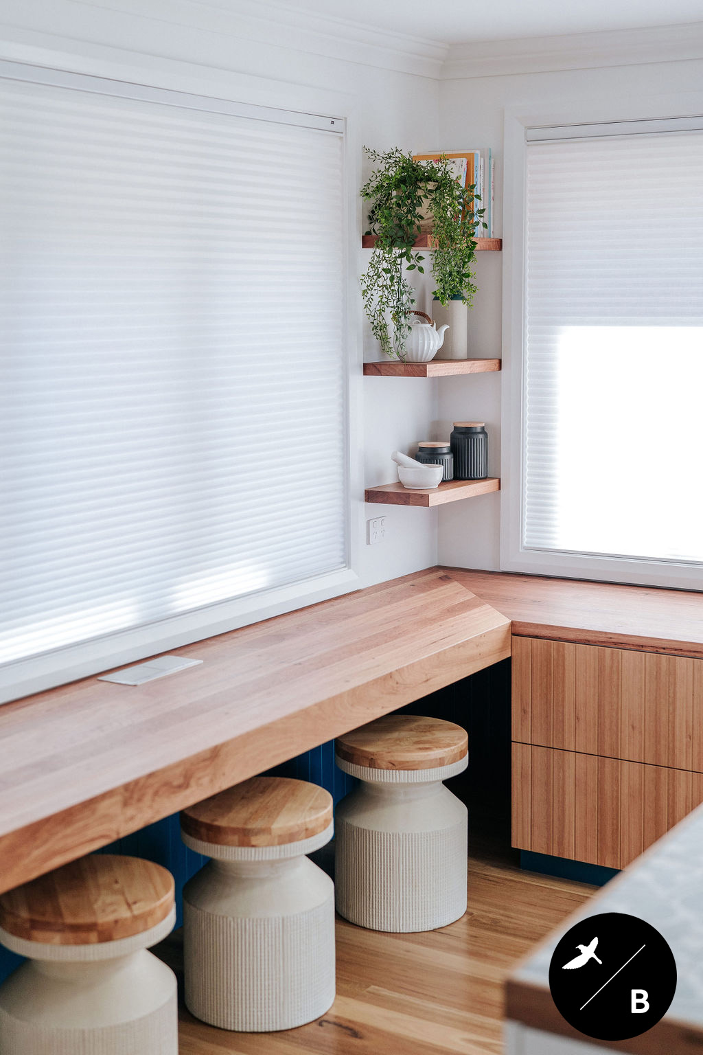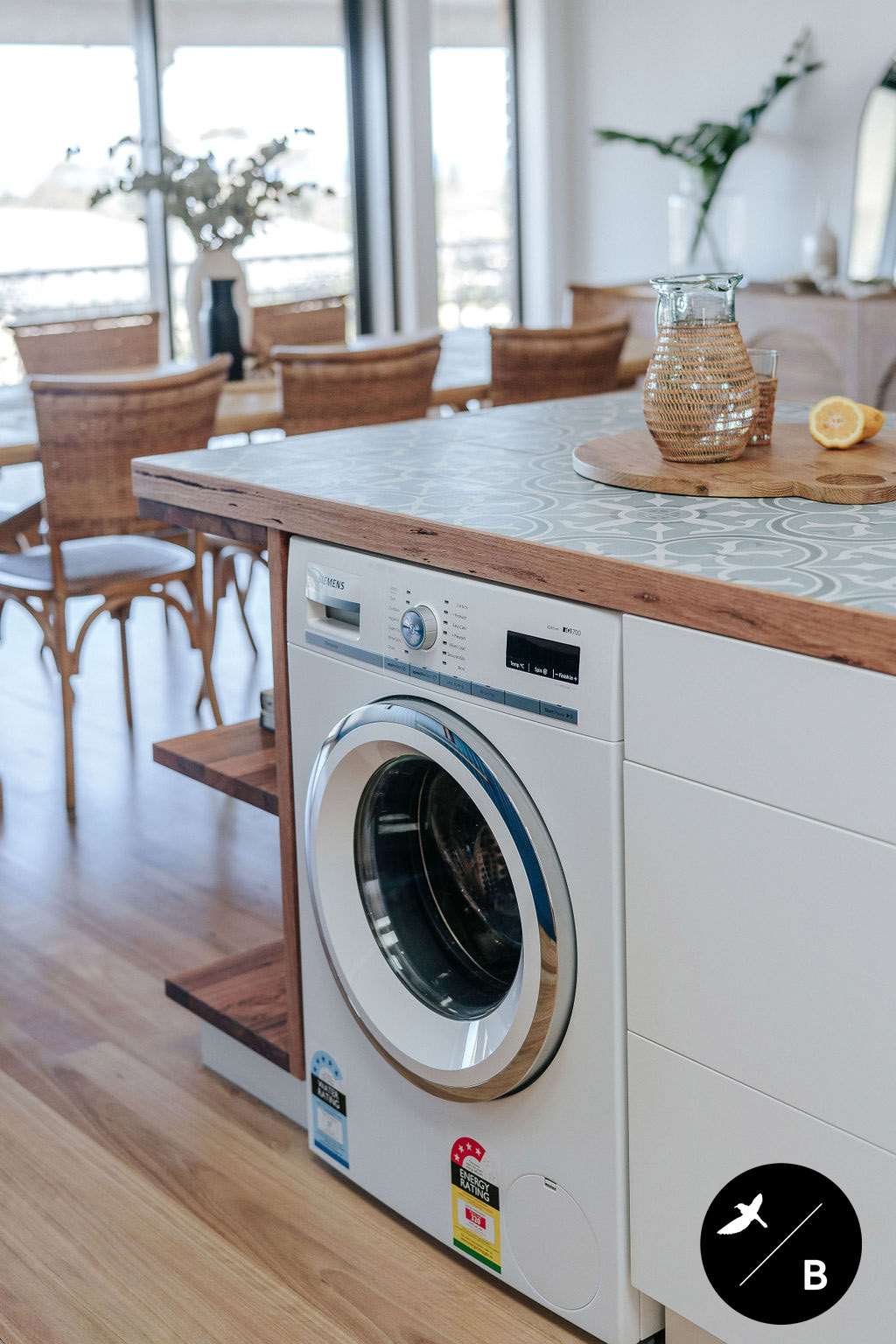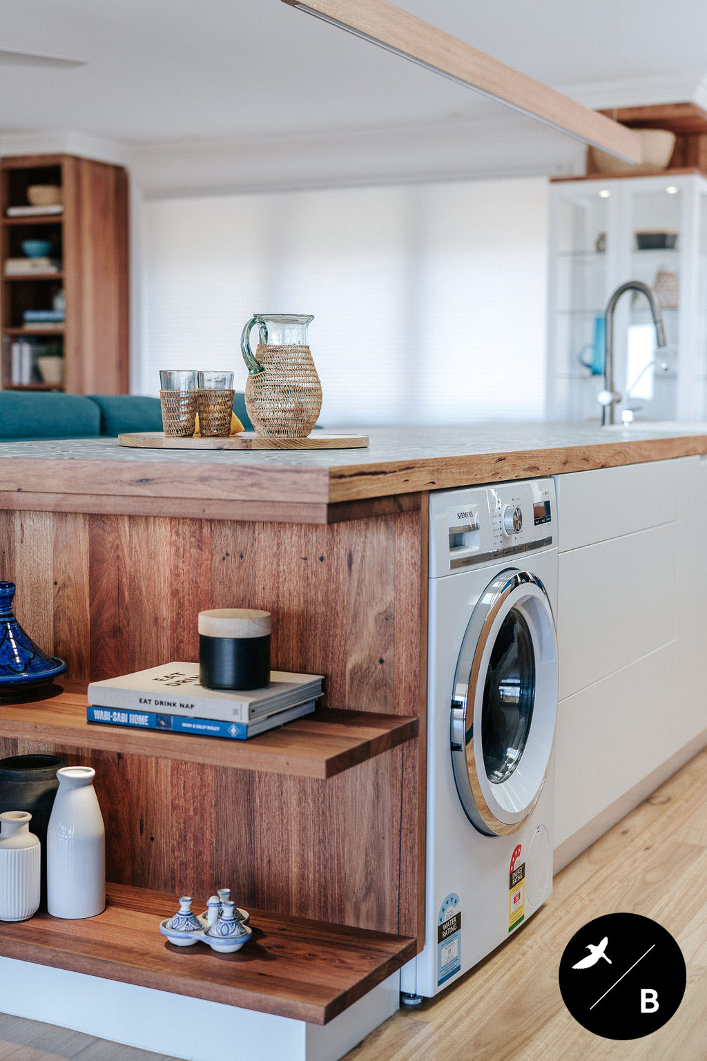 The Kitchen features a large Kitchen Island, acting as a subtle divide between the Kitchen and Living Room, and perfect for prepping meals. Positioned above the Island is a custom-made linear timber pendant working hand-in-hand with the Blackbutt flooring and benchtop border. This island features an abundant amount of storage - even a washing machine! Our home owners imagine their old age in this abode and so a laundry downstairs would be impractical for them in the future.