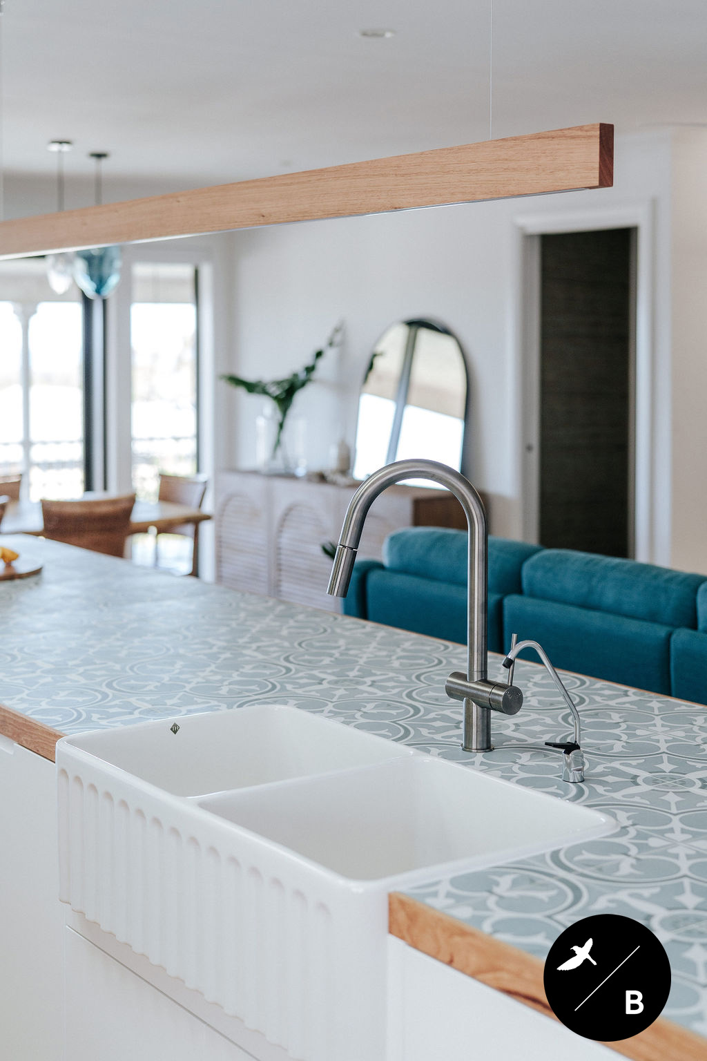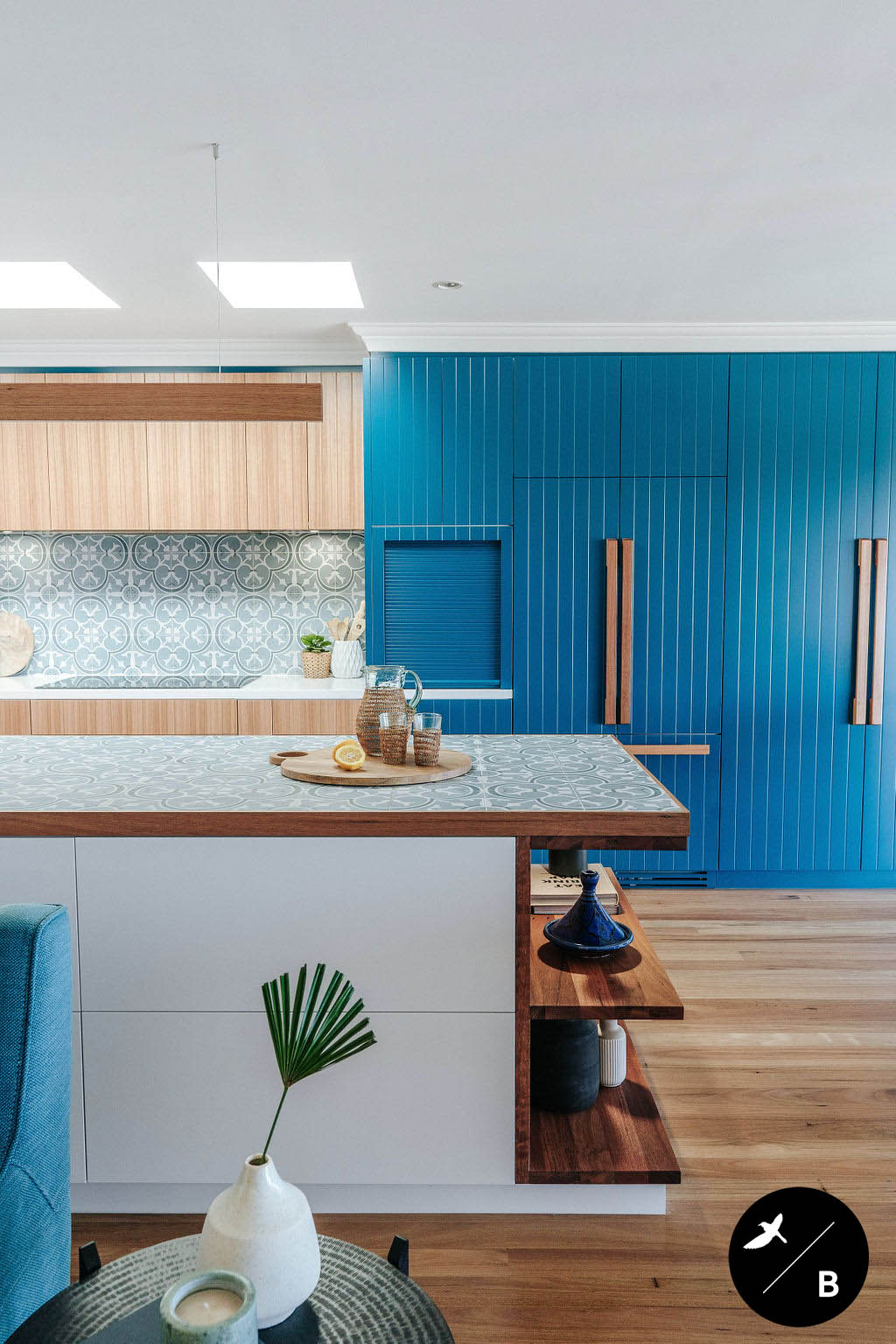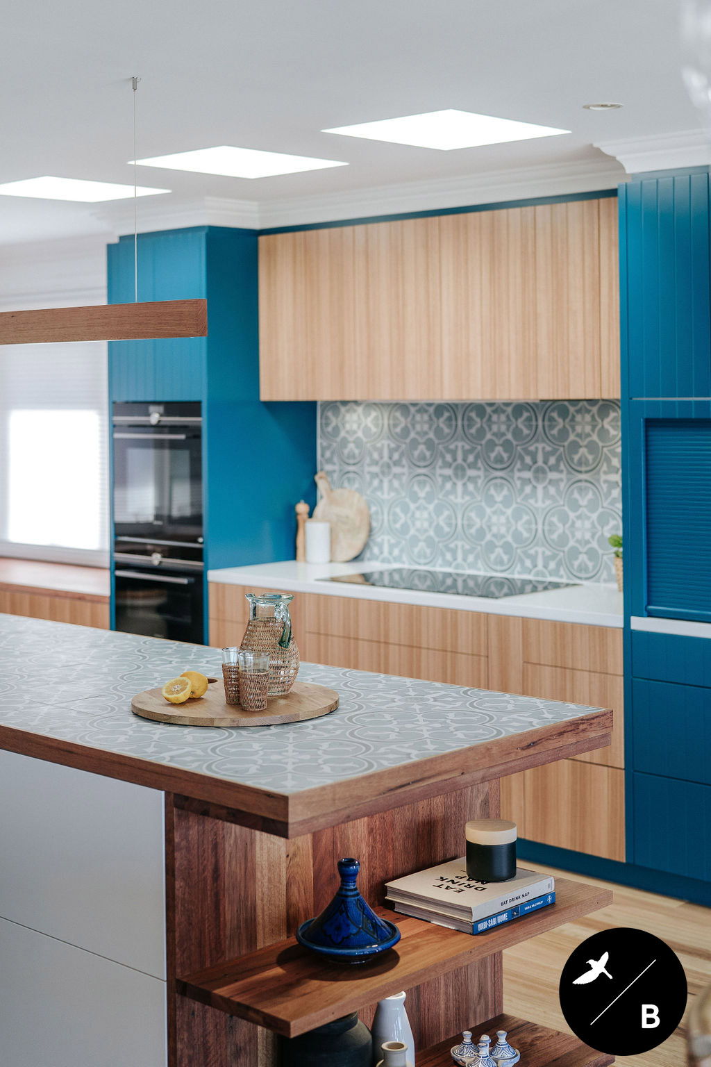 Yet another bold Moroccan-pattern inspiration is found in the encaustic-look tile utilised as the splashback. This tile features an ocean blue and white colourway, pairing perfectly with the bold teal cabinetry. Encaustic-look tiles are popular in Morocco’s architecture and interiors.