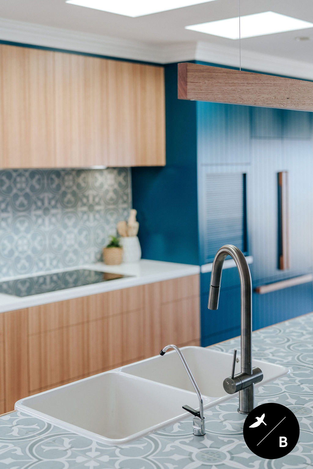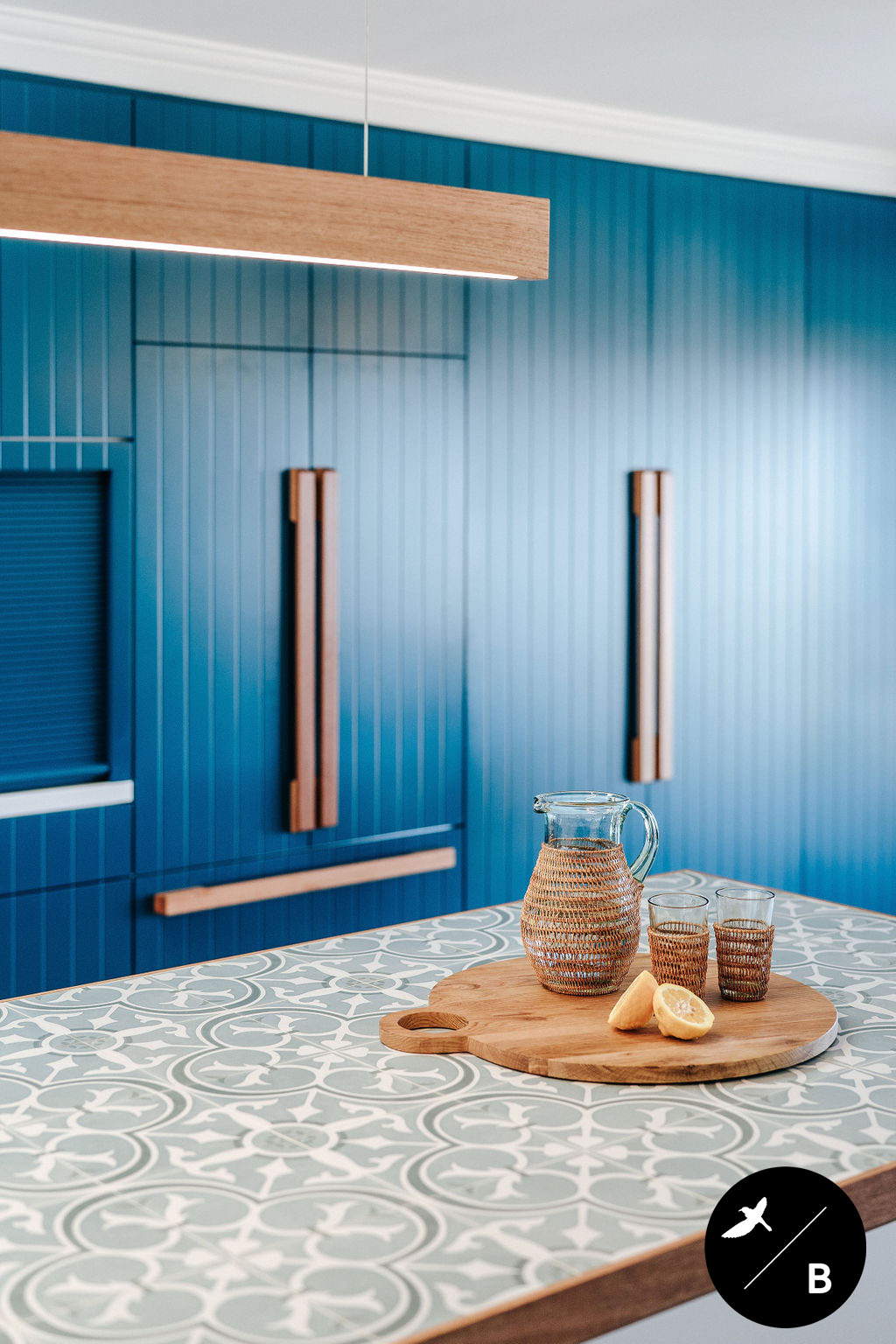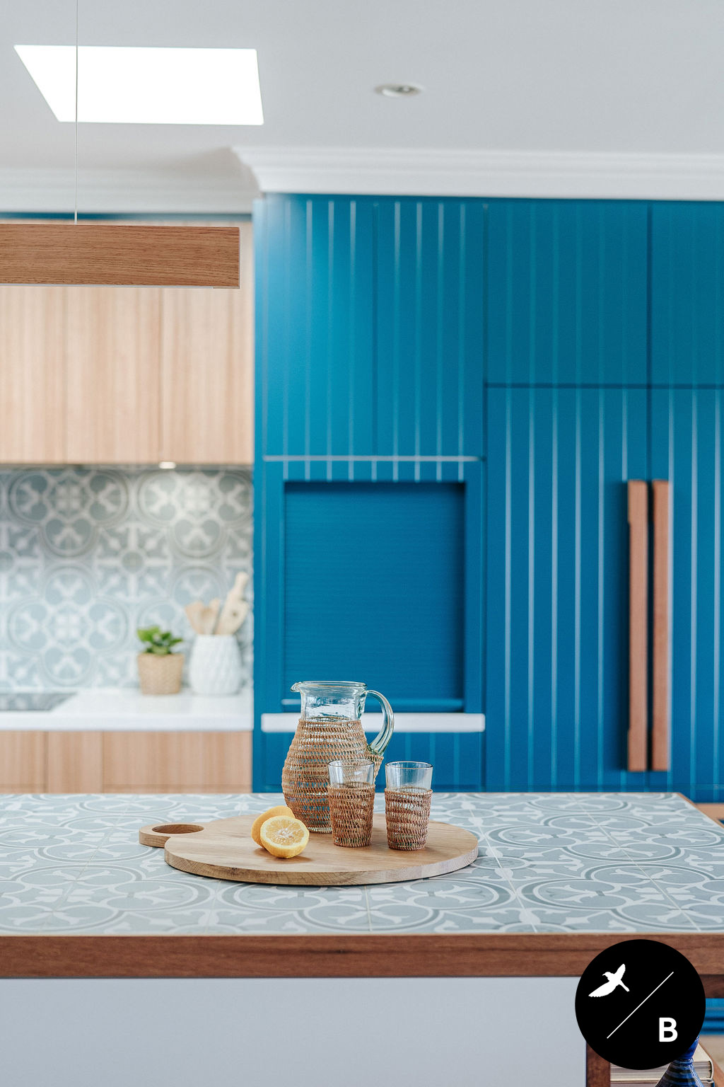 Yet another bold Moroccan-pattern inspiration is found in the encaustic-look tile utilised as the splashback. This tile features an ocean blue and white colourway, pairing perfectly with the bold teal cabinetry. Encaustic-look tiles are popular in Morocco’s architecture and interiors.