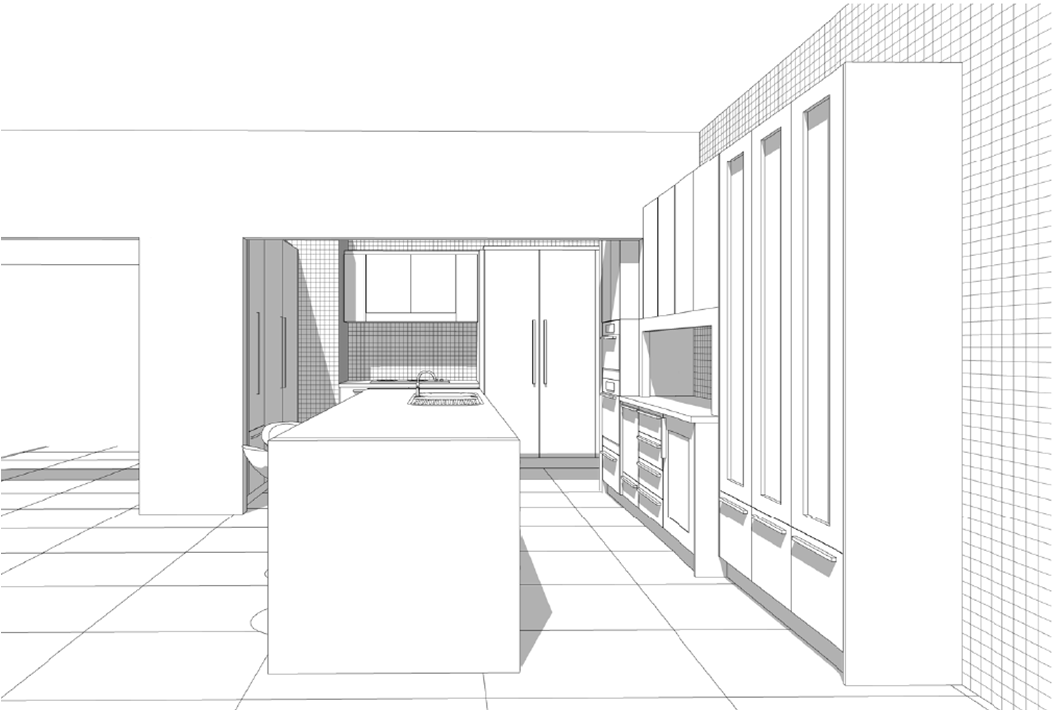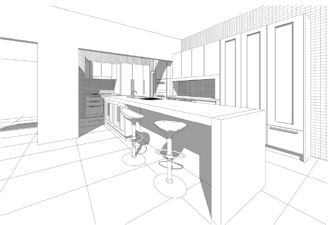 The new design encompasses multiple work stations so that each space can be occupied without affecting the other spaces. Even though there are separate work stations the design principle of the working triangle works to its full extent. Having the cooktop, fridge and sink all in close proximity without any flow interference provides an easy to work in kitchen.