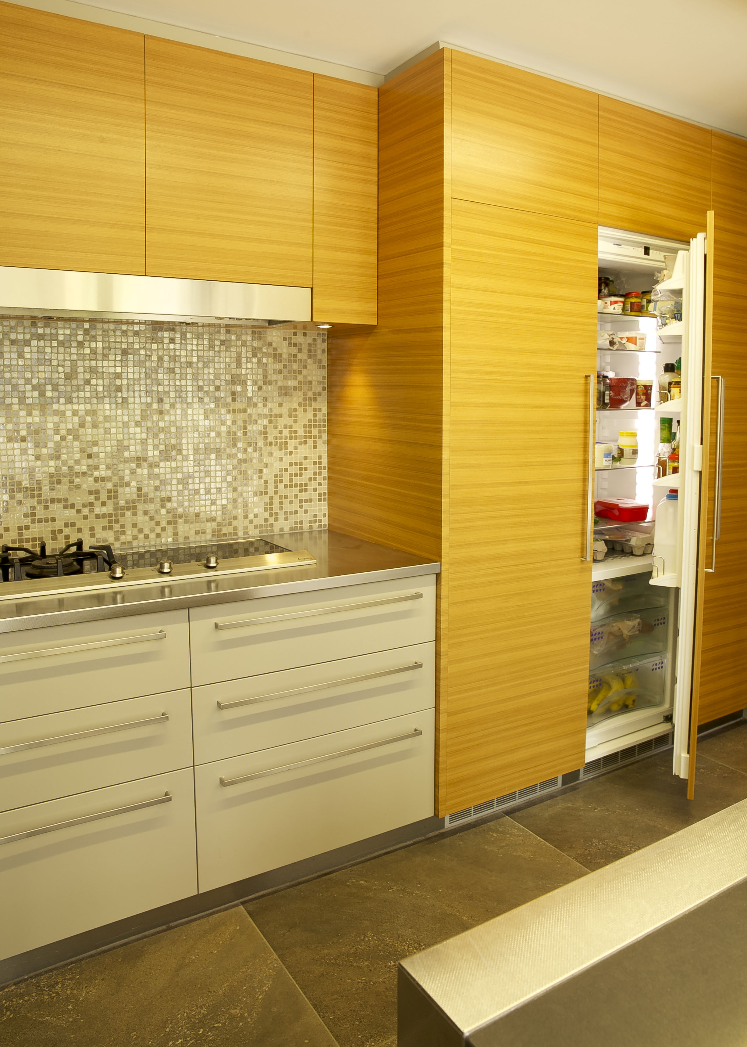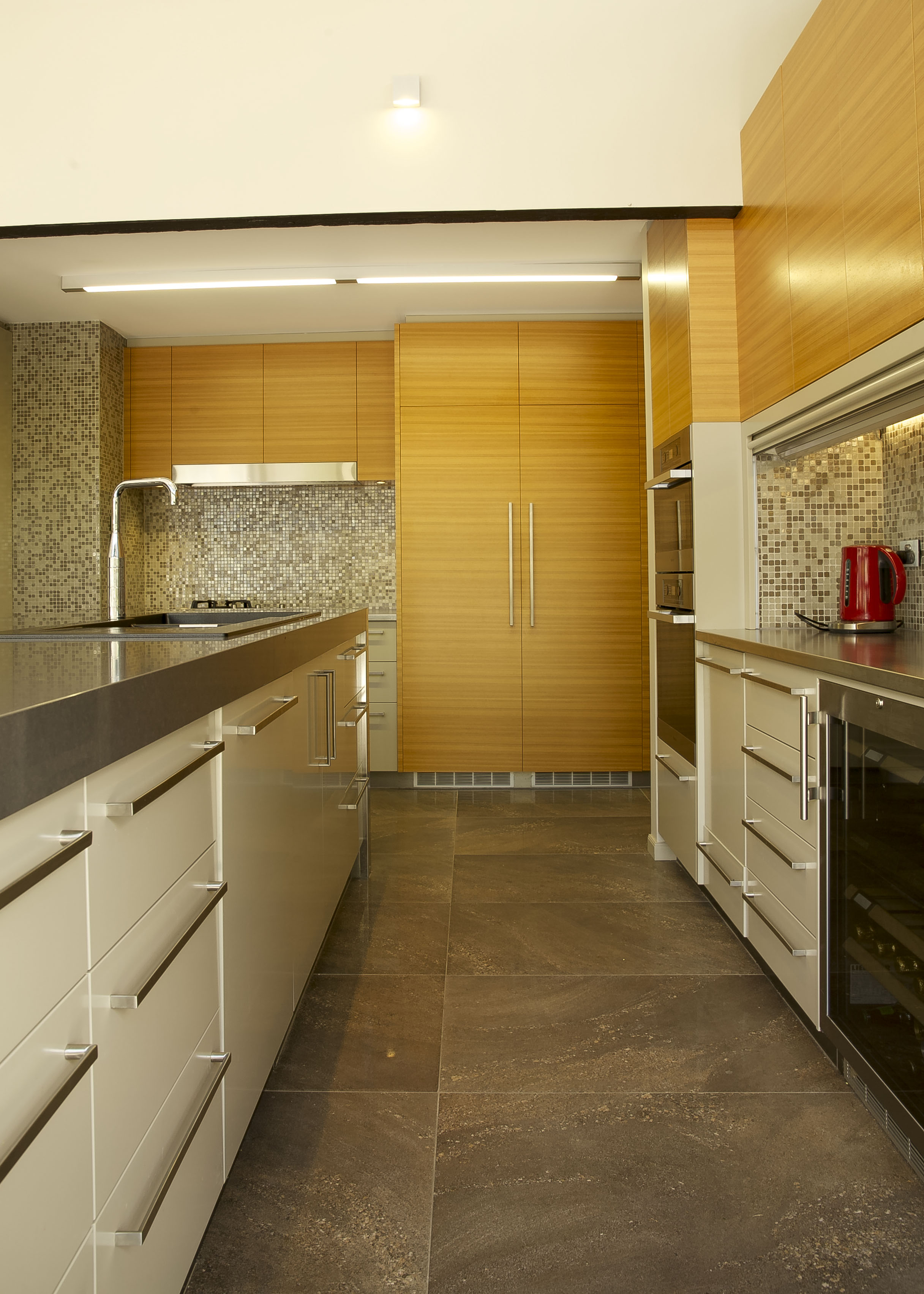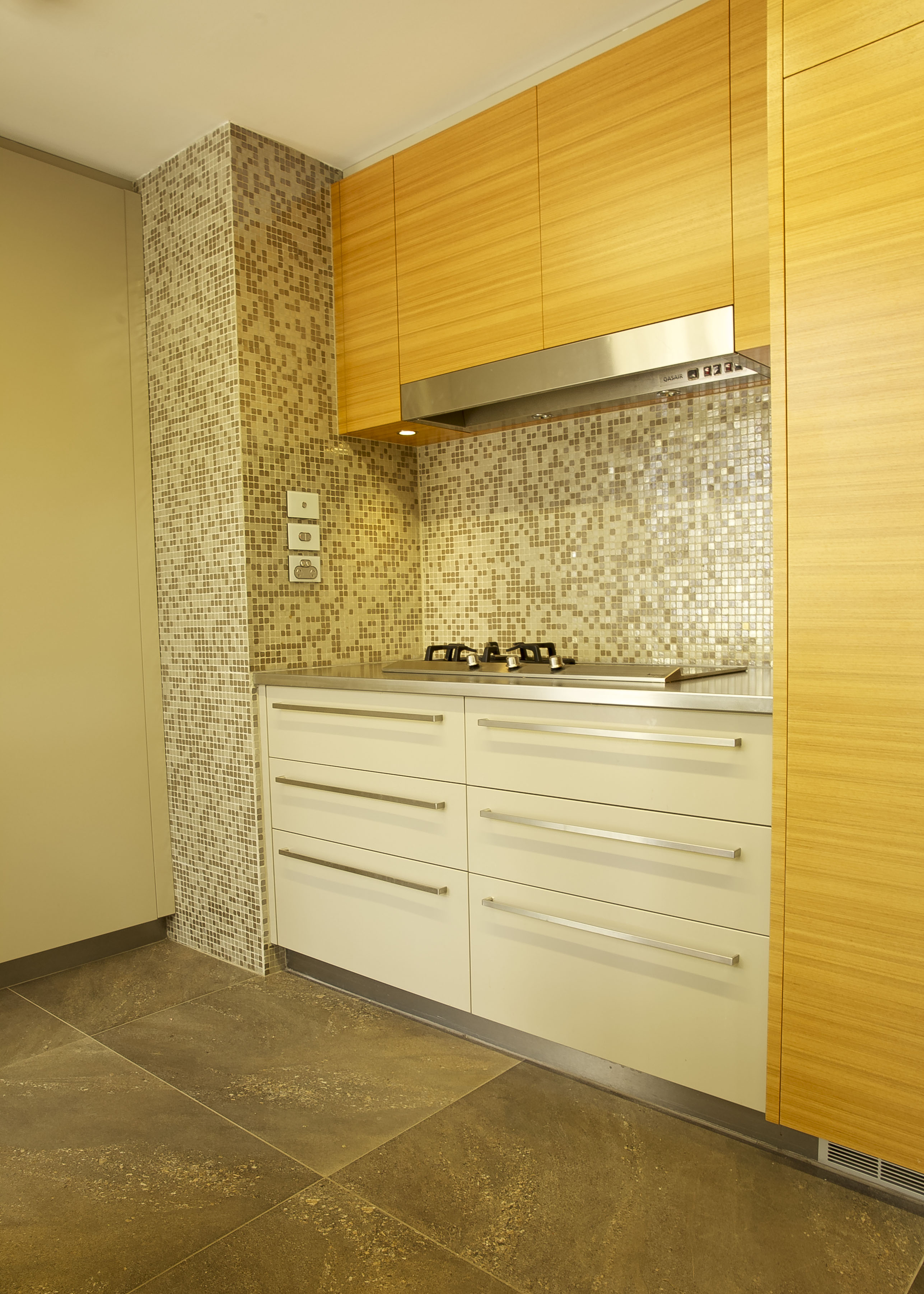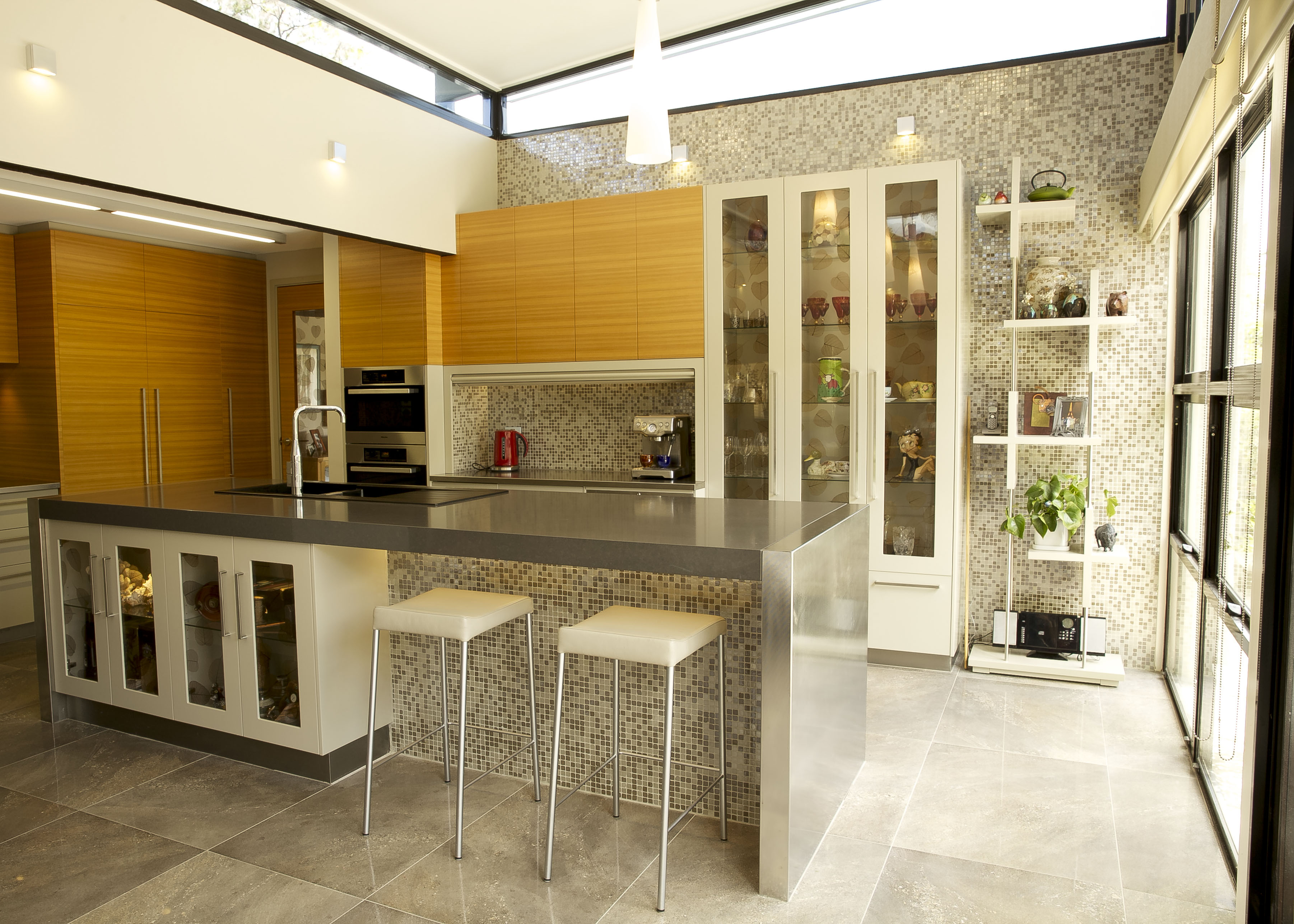 The combination of the Golden Teak Veneer balanced with the Dulux Linseed satin polyurethane cupboard fronts create a stunning modern look with magnificent warmth. The cupboard finishes produce a modern take on a 1970’s colour scheme so there is a beautiful harmony with the structure of the home. The benchtops were thoughtfully designed to be innovative not only in the design itself but also in the choice of materials. A unique combination of reconstituted stone marries well with the sleek patterned stainless steel. This contrast of material is a feature within the kitchen, the luxurious sheen of the stainless steel elegantly runs down to the base of the island where it is met with the stunning floor tile. This large format porcelain tile was selected not only for its practicality as porcelain but more so for its amazing natural stone look.
