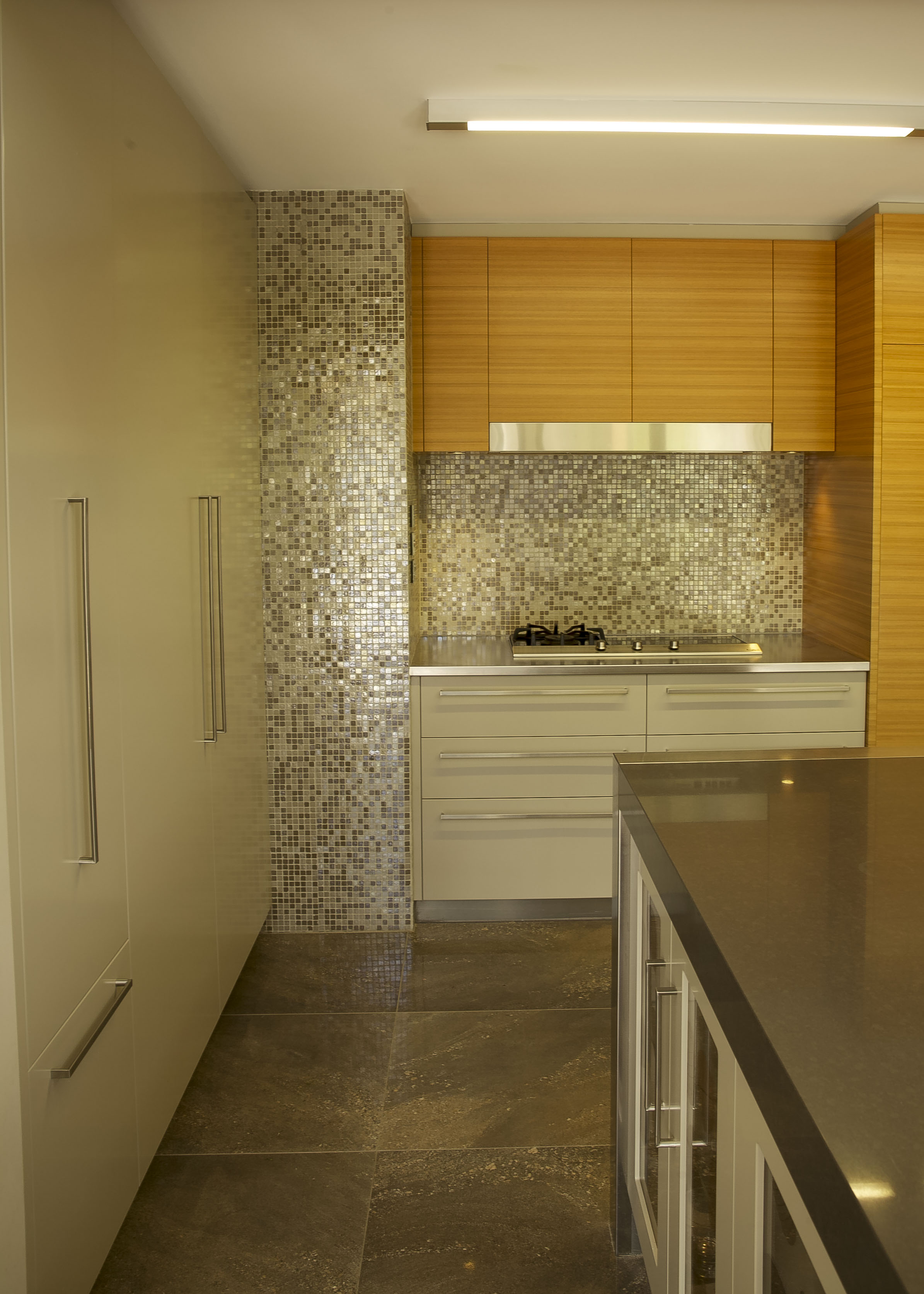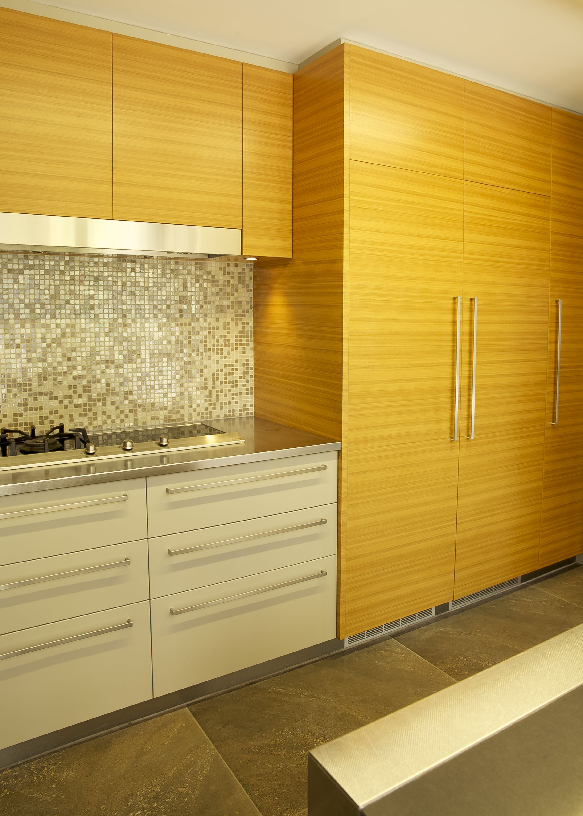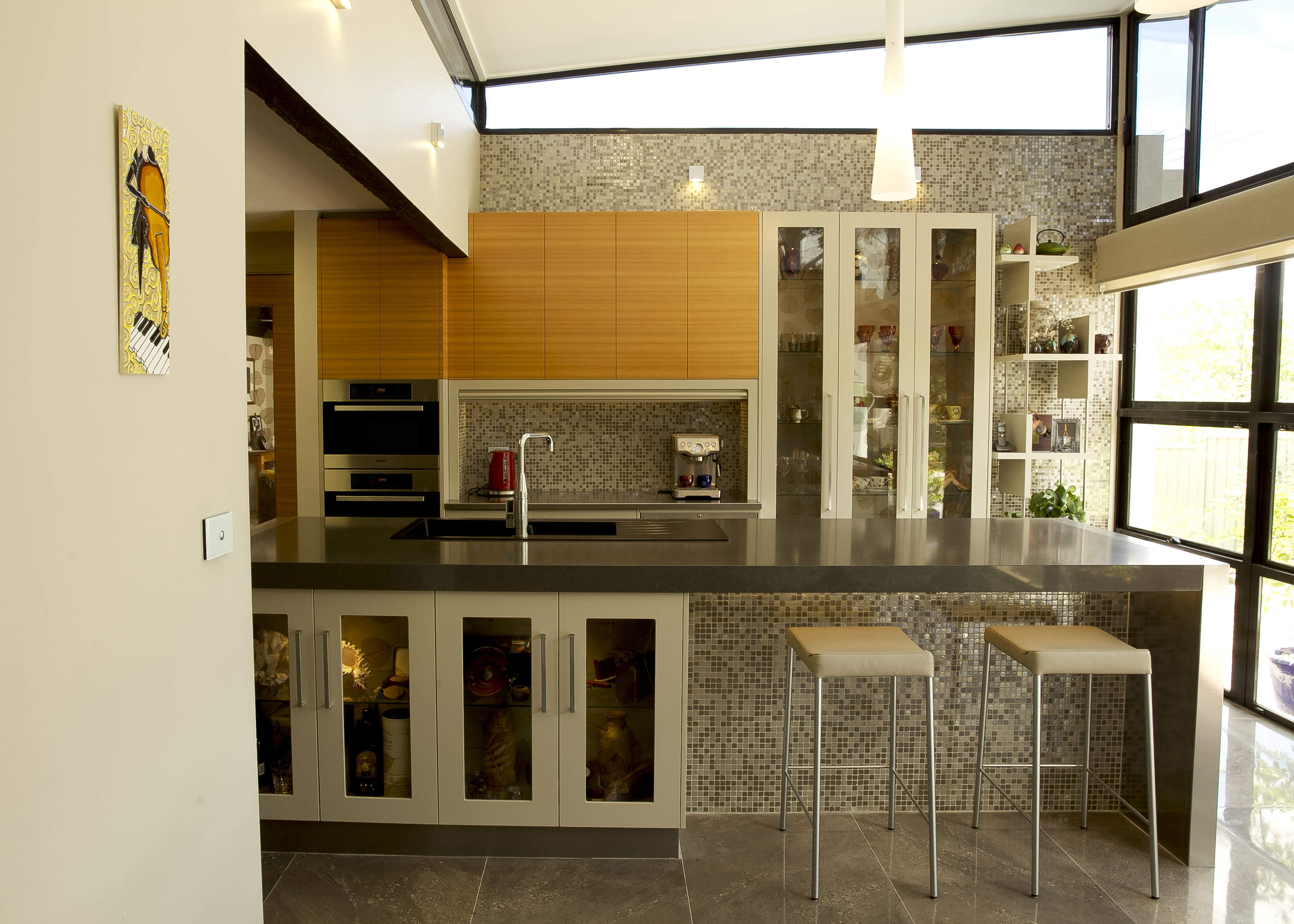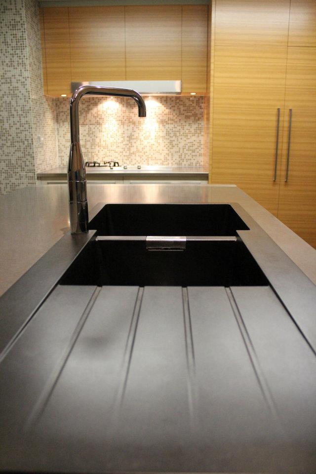The combination of the Golden Teak Veneer balanced with the Dulux Linseed satin polyurethane cupboard fronts create a stunning modern look with magnificent warmth. The cupboard finishes produce a modern take on a 1970’s colour scheme so there is a beautiful harmony with the structure of the home. The benchtops were thoughtfully designed to be innovative not only in the design itself but also in the choice of materials. A unique combination of reconstituted stone marries well with the sleek patterned stainless steel. This contrast of material is a feature within the kitchen, the luxurious sheen of the stainless steel elegantly runs down to the base of the island where it is met with the stunning floor tile. This large format porcelain tile was selected not only for its practicality as porcelain but more so for its amazing natural stone look.